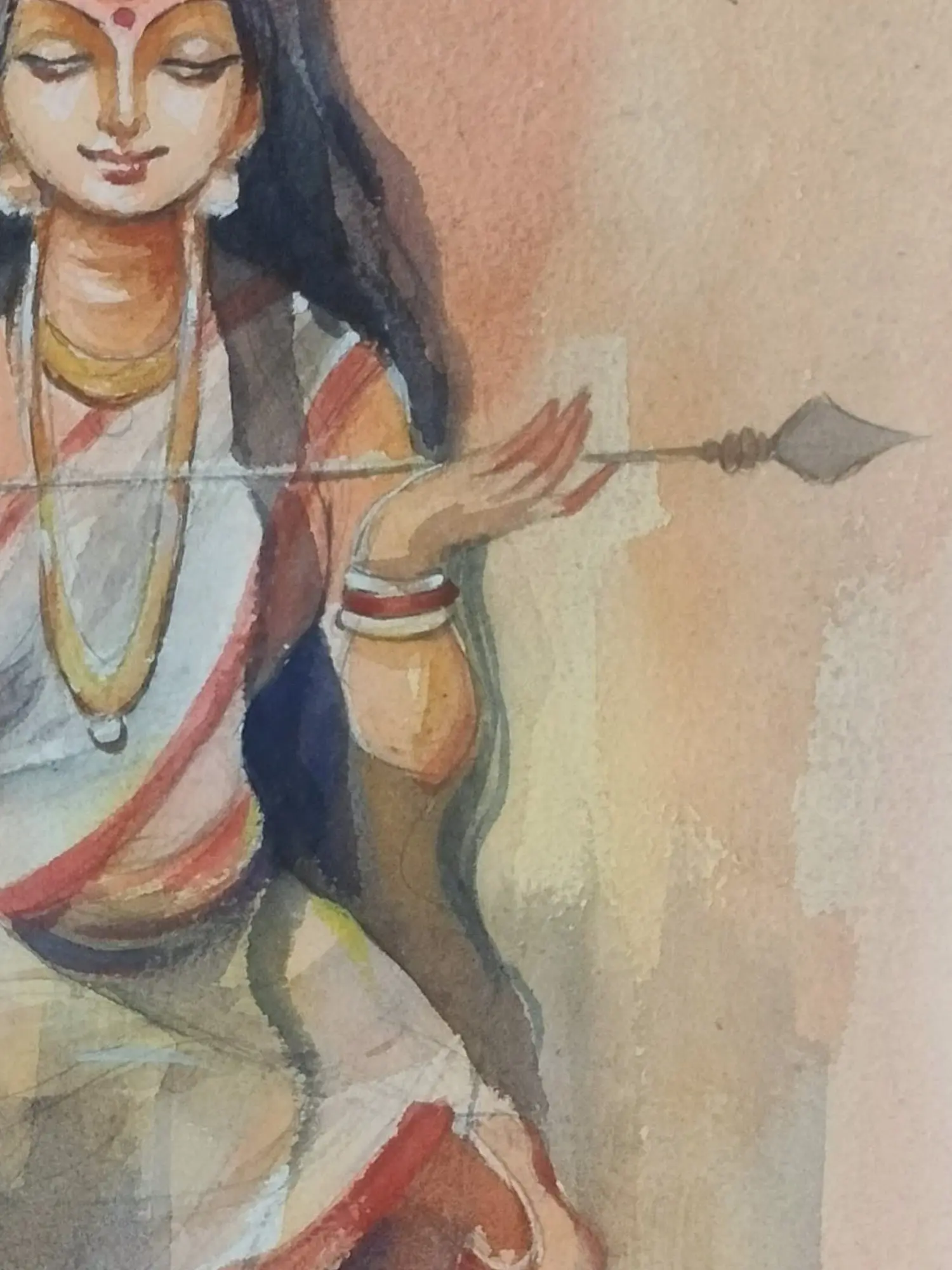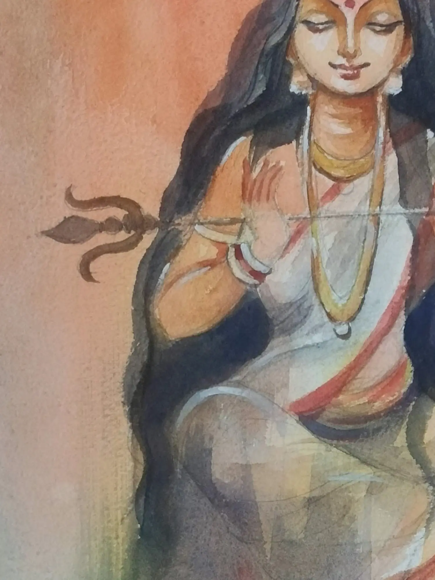 This exquisite watercolor painting by Sarat Shaw captures the essence of Goddess Shivshakti, a powerful and multifaceted deity in Hindu mythology. Shivshakti, a name that literally translates to "the power of Shiva," represents the potent union of Shiva, the destroyer, and Shakti, the divine feminine energy. This fusion embodies the cosmic dance of creation and destruction, highlighting the cyclical nature of existence and the inherent strength within the feminine. The painting's delicate yet bold strokes bring this powerful concept to life. The Goddess is depicted with a serene yet commanding presence, her gaze suggesting both wisdom and unwavering determination. The Trishul (trident), a symbol of Shiva's power, rests gently in her hands, further signifying her connection to the divine masculine and her ability to wield both creation and destruction. The subtle play of light and shadow enhances her radiant aura, portraying her as a force of nature, both beautiful and indomitable.