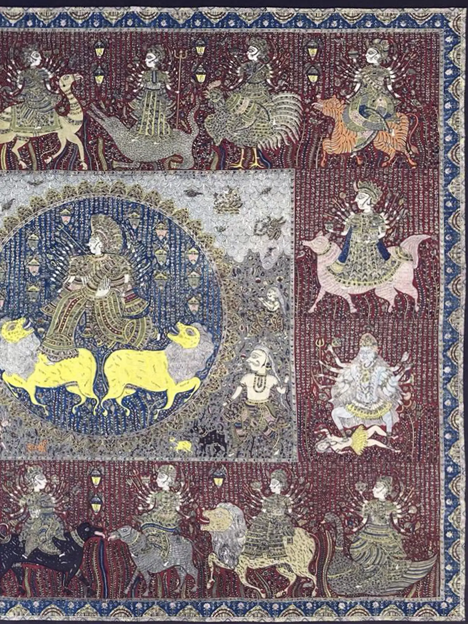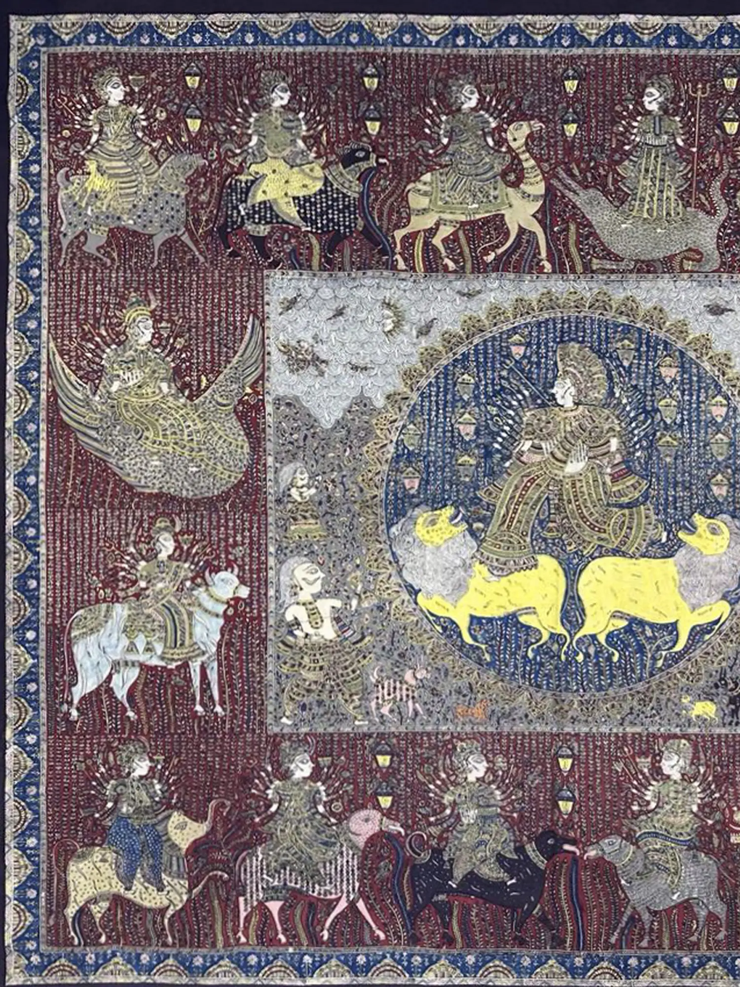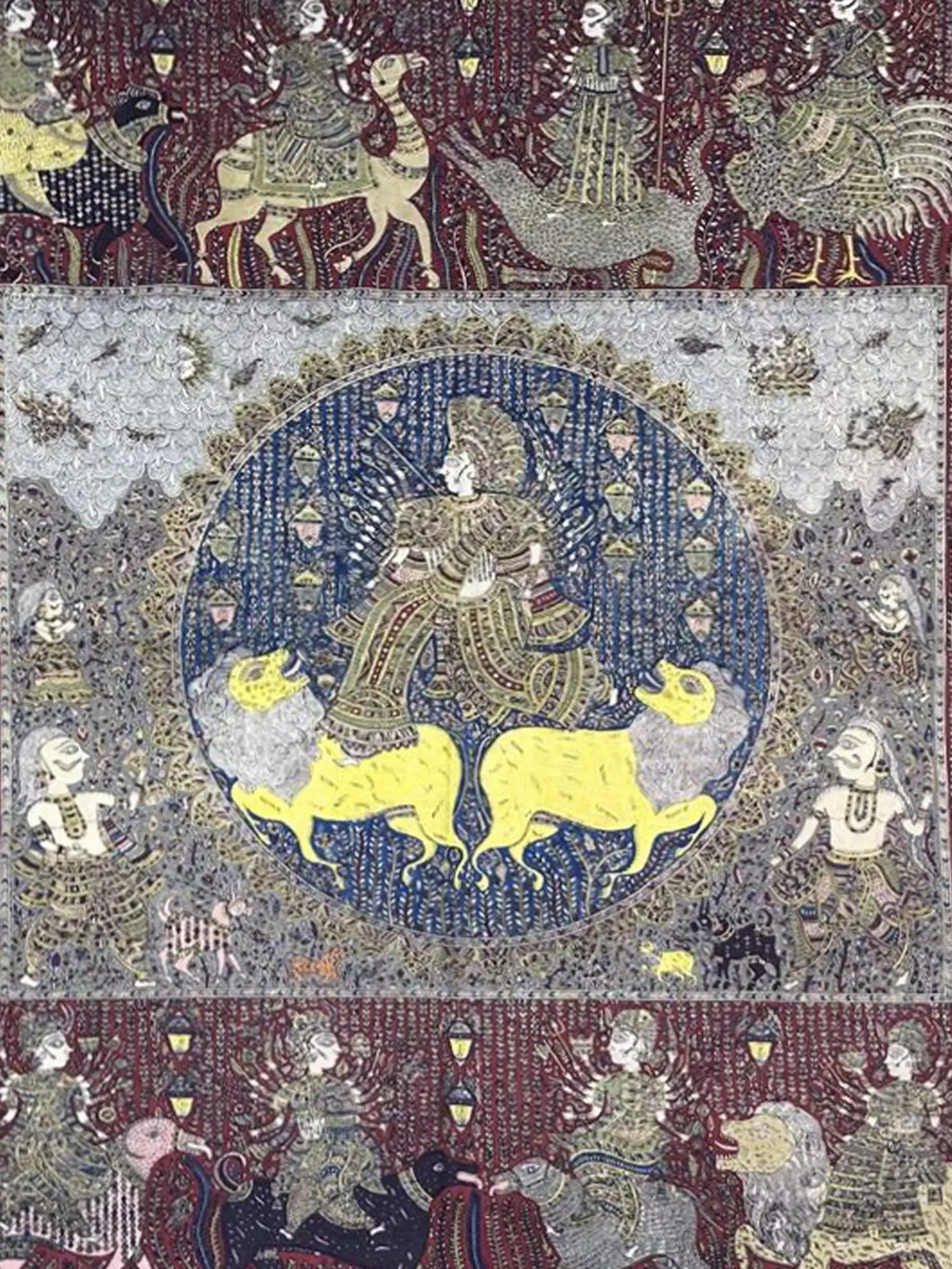 The composition unfolds as a divine procession, centered around a serene depiction of celestial beings flanked by powerful leonine forms. Surrounding this core imagery, you’ll discover a pantheon of goddesses, each uniquely rendered upon their respective mounts – from graceful avian figures to the mighty bull and agile camel. The intricate patterns adorning the figures and their regal transport create a mesmerizing visual rhythm across the expansive 54-inch height and 66-inch width canvas. Small, illuminating details, reminiscent of ancient lamps, punctuate the background, adding depth and a sense of sacred illumination.