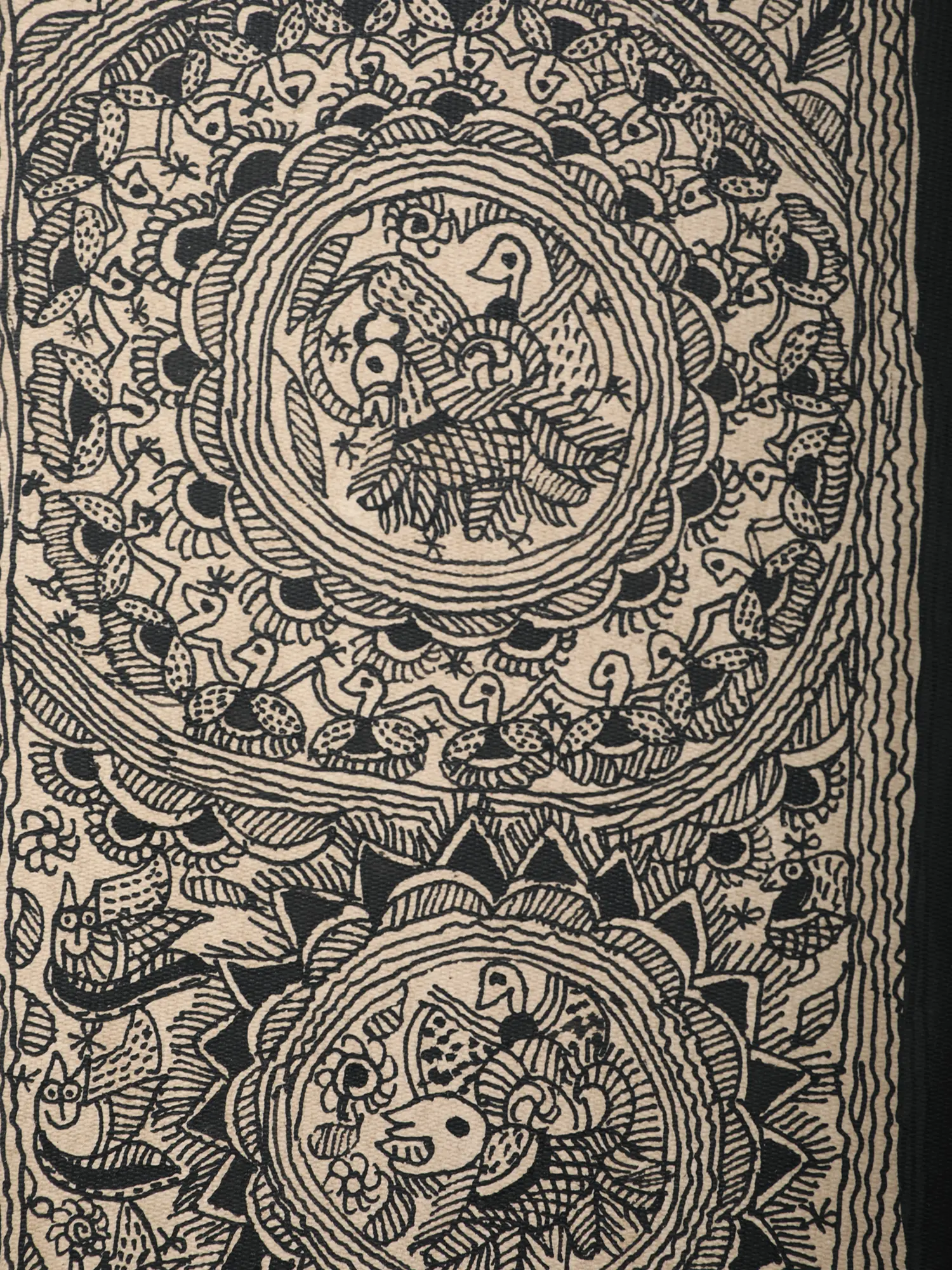 This unique artwork showcases the vibrant tradition of Godna art, a form of body art practised by women in Bihar, India. Rendered on handmade paper using the Madhubani style, this piece depicts intricate patterns and natural motifs. Traditionally, Godna art depicted auspicious symbols for fertility, protection, and good luck.