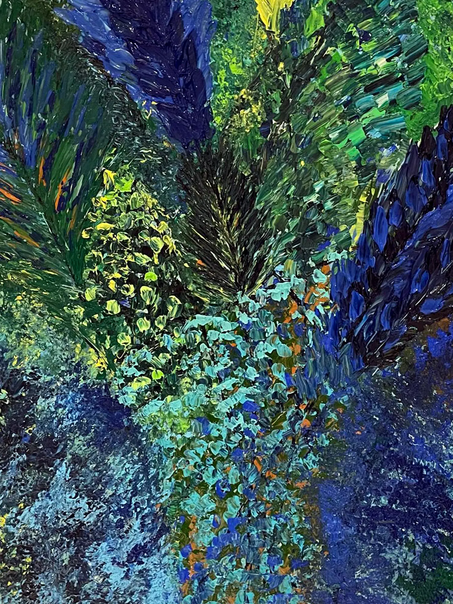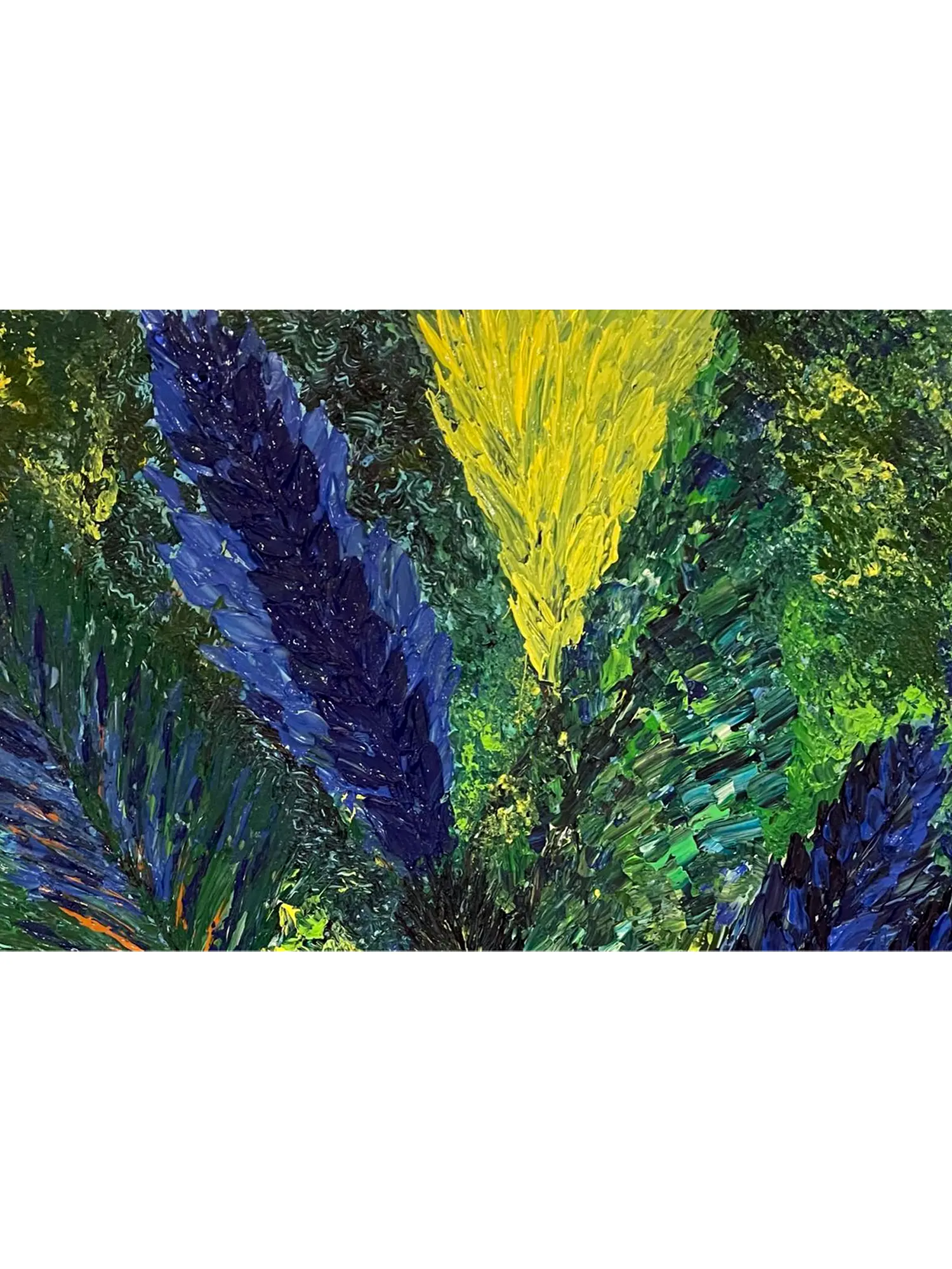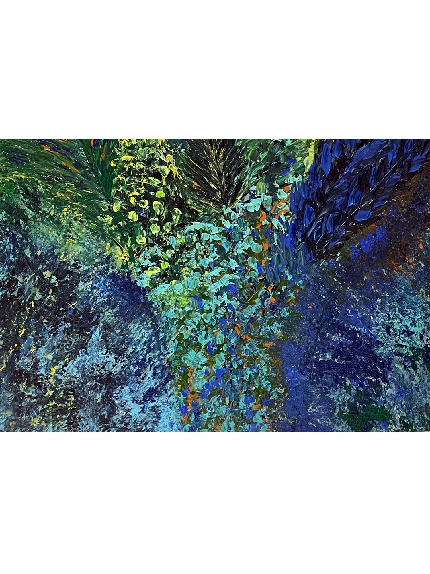 Imagine stepping into a world teeming with life, where vibrant hues dance and intertwine, creating a symphony of color and texture. This captivating painting invites you to lose yourself in its lush, layered depths. The artist employs a masterful application of acrylic paint on canvas, building up the surface with bold, expressive strokes that suggest a thriving, untamed space. The interplay of light and shadow creates a sense of depth and movement, drawing the eye deeper into this verdant scene. Notice how the artist uses different shades of green, blue, and yellow to convey the richness and diversity of the natural world. The impasto technique – where paint is applied thickly – gives the painting a tactile quality, making it feel as though you could reach out and touch the leaves and foliage. This artwork resonates with the viewer's own connection to nature, beckoning you to escape the everyday and immerse yourself in its tranquil beauty.