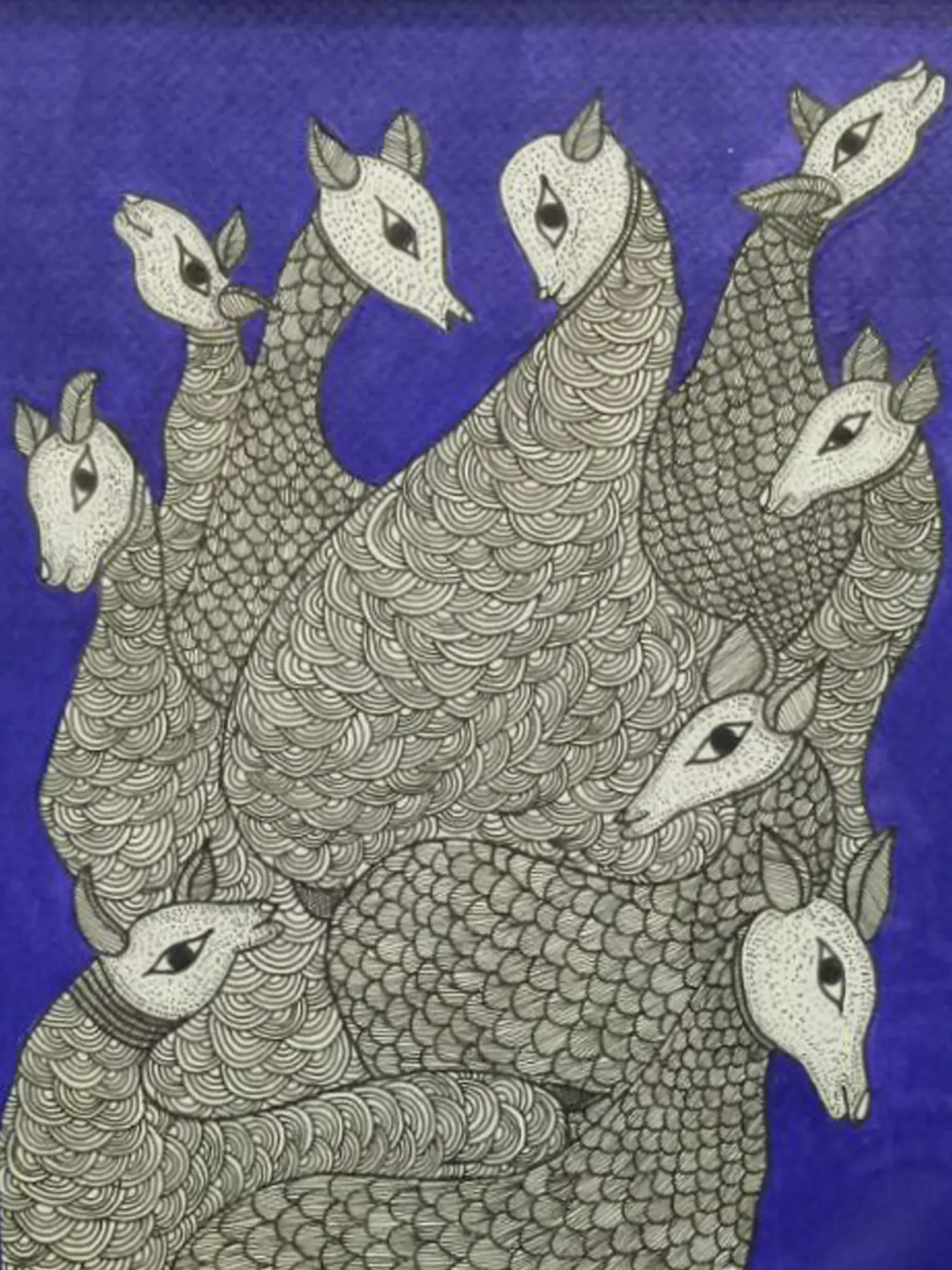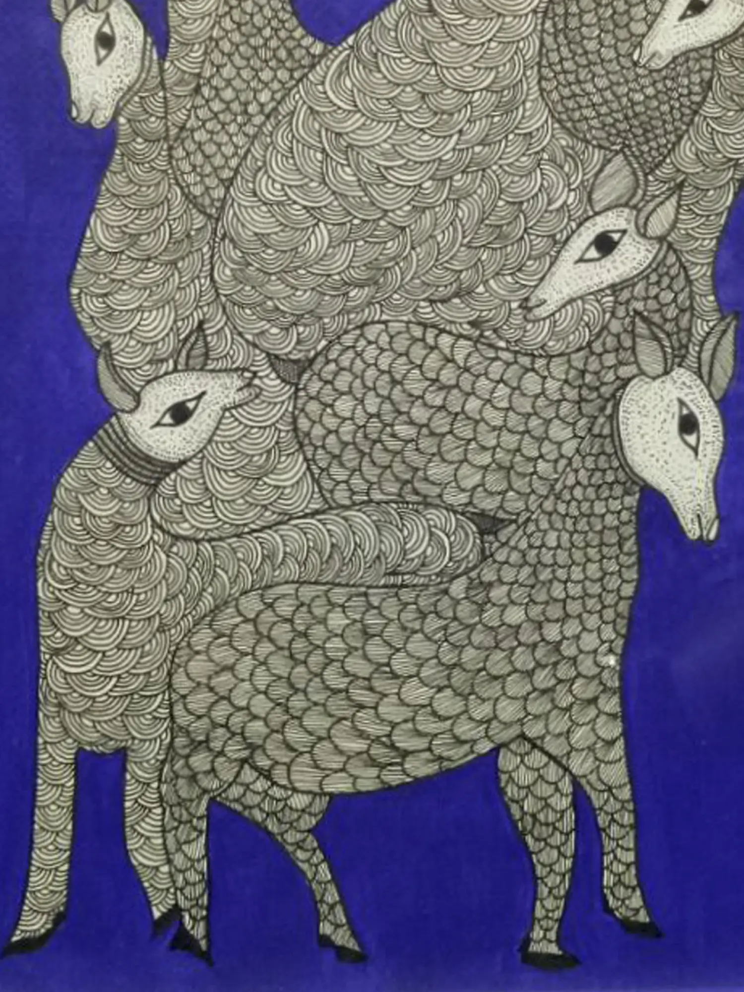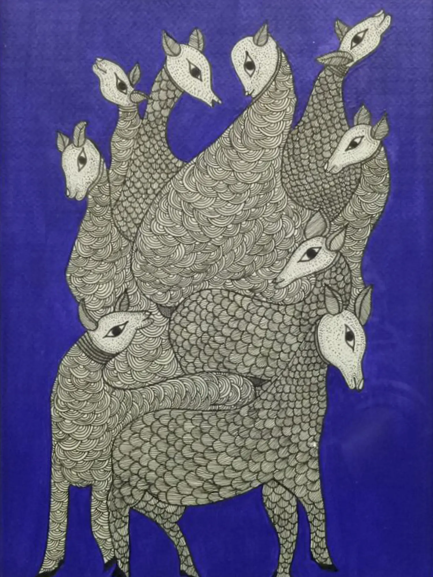 Beyond its visual allure, this painting emerges as a medium for preserving the profound teachings of the Gond community. The vibrant blue background establishes the images as pictorial teachings. It echoes their timeless message of respect for all living beings, harmonizing with the interconnectedness of nature. Through the language of Gond Art, Krishna Joshi not only celebrates the aesthetic beauty of deer but also communicates the spiritual values and ecological wisdom embedded in the cultural fabric of the Gond tribe.