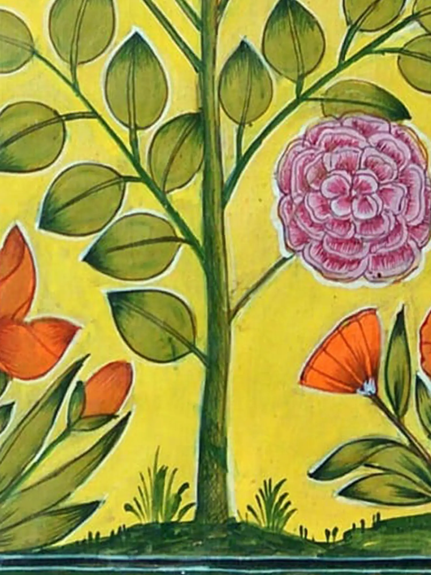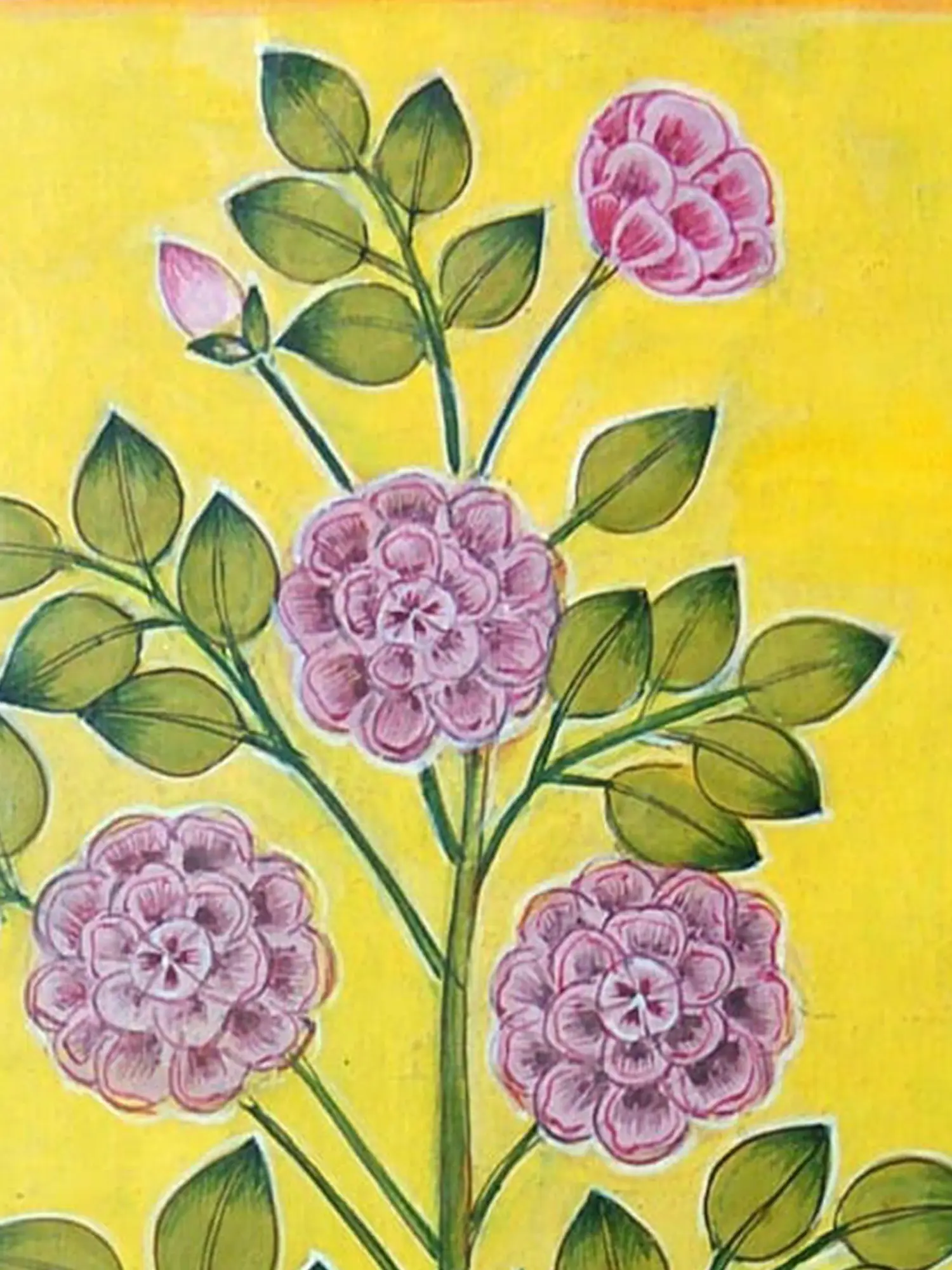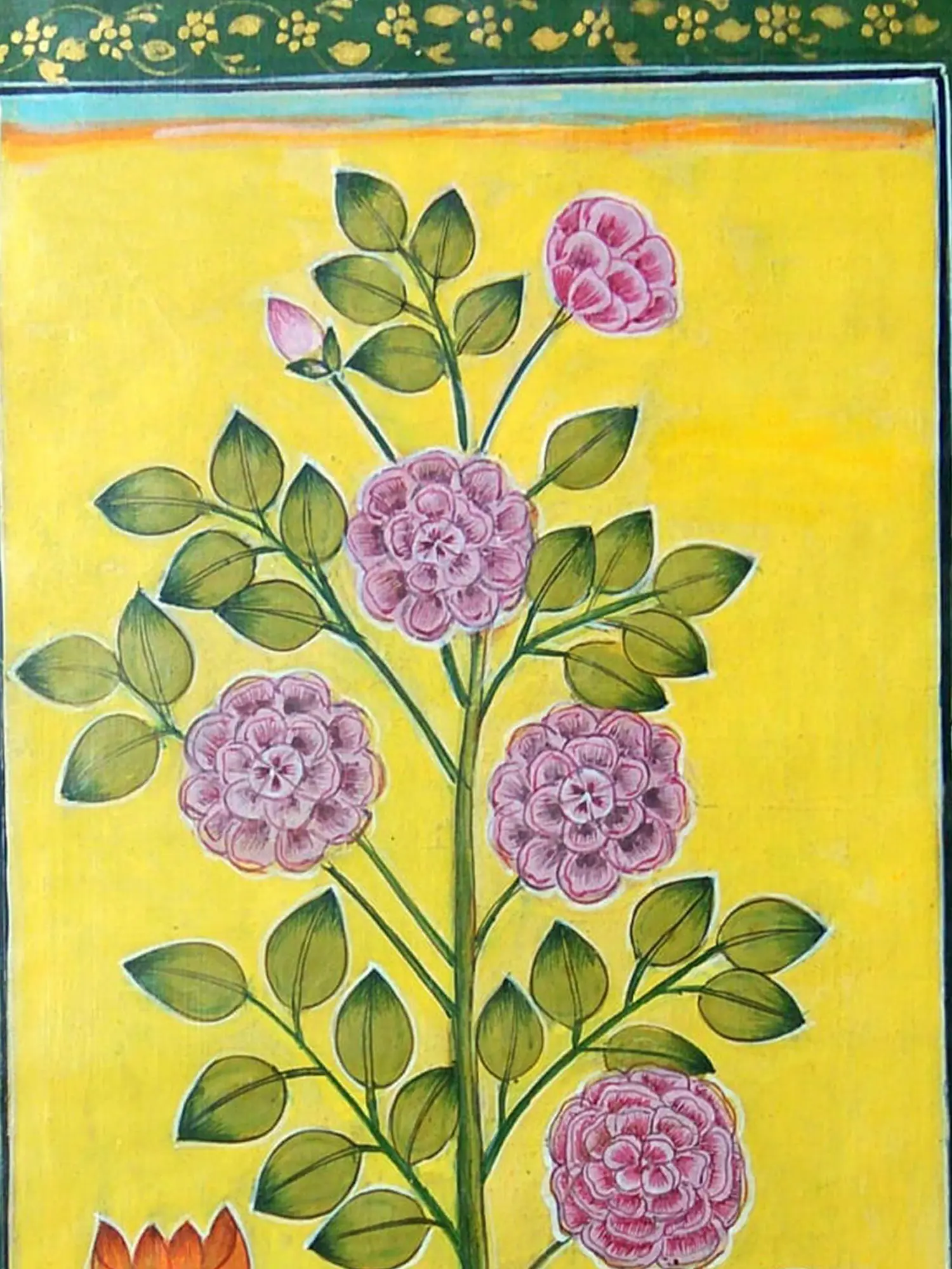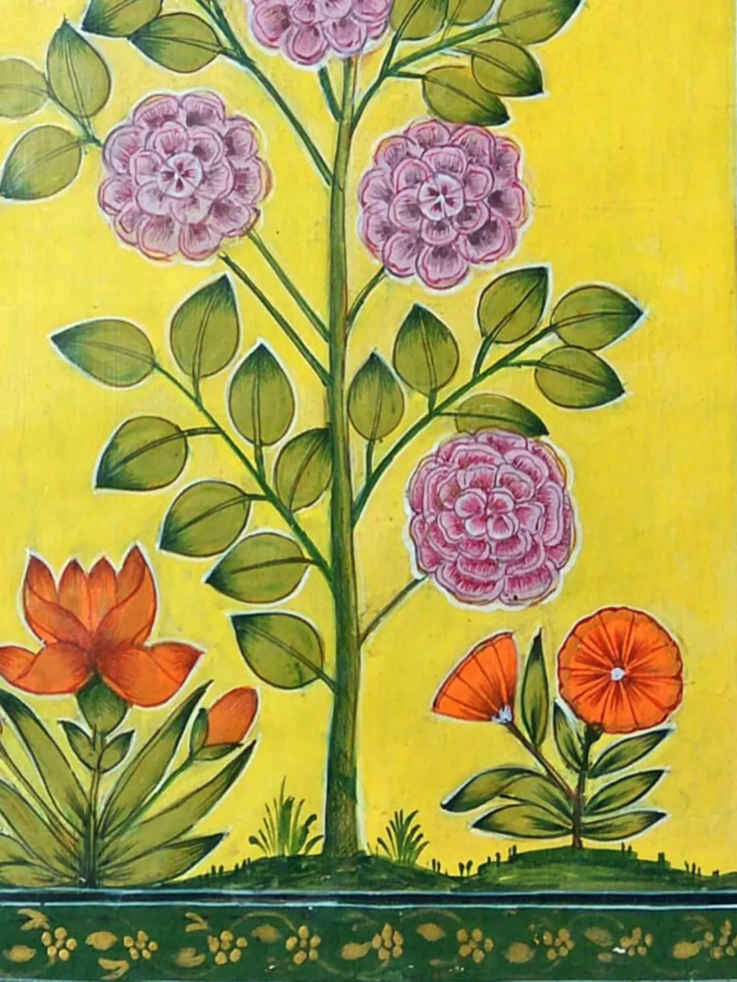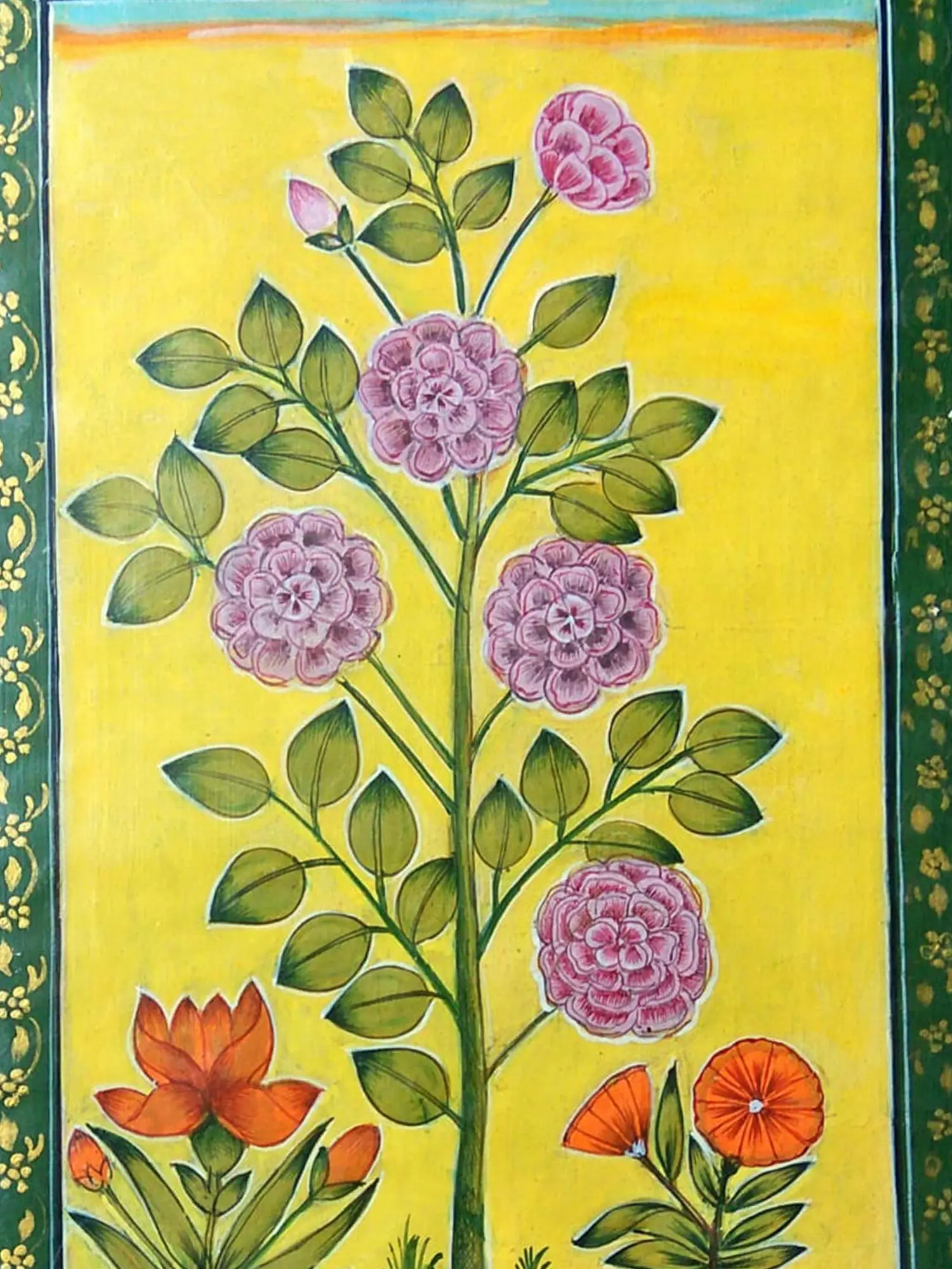 This piece resonates with the rich heritage of Indian miniature painting, particularly the Mughal school, known for its floral motifs and vibrant palettes. You'll find echoes of this tradition in the precise detailing, the symbolic representation of flora, and the harmonious use of color. Such compositions traditionally symbolized prosperity, fertility, and the cyclical nature of life, offering a glimpse into a storied artistic lineage.