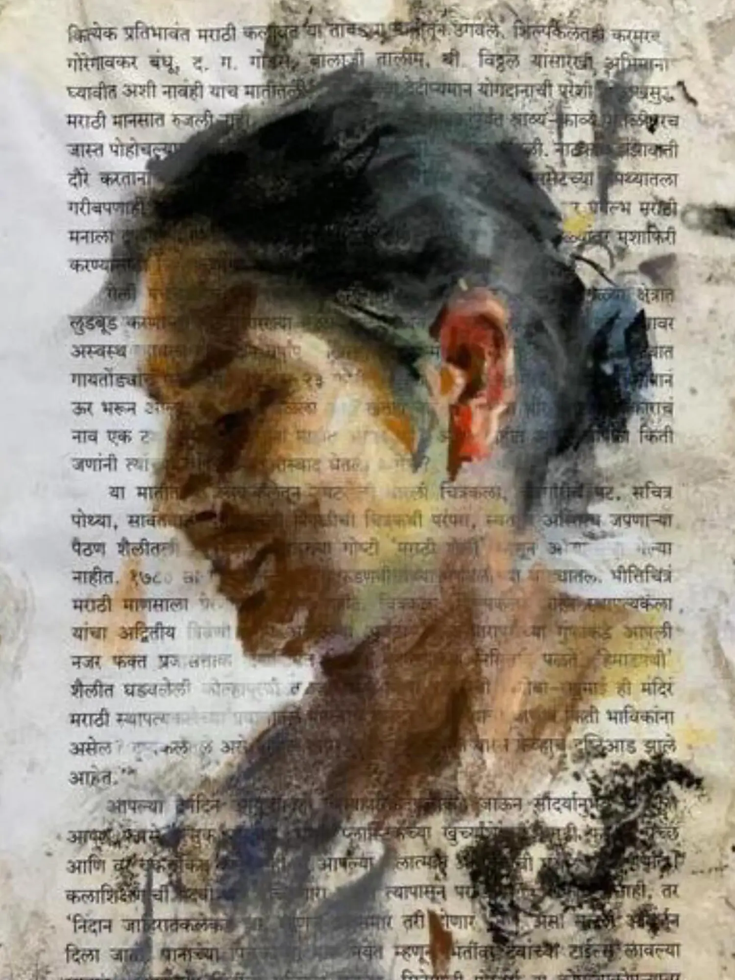 The text itself seems to be passages from Marathi literature, further enriching the artwork's cultural context. This connects the piece to a specific cultural heritage, illustrating how education plays a crucial role in preserving and transmitting that heritage. Patole's use of this fragment adds a layer of historical depth and cultural identity, suggesting that learning is also a celebration of one's cultural background. The artist's choice of using Marathi text underlines its importance in the story of growth and education. This intimate touch imbues the artwork with a powerful sense of place and belonging.