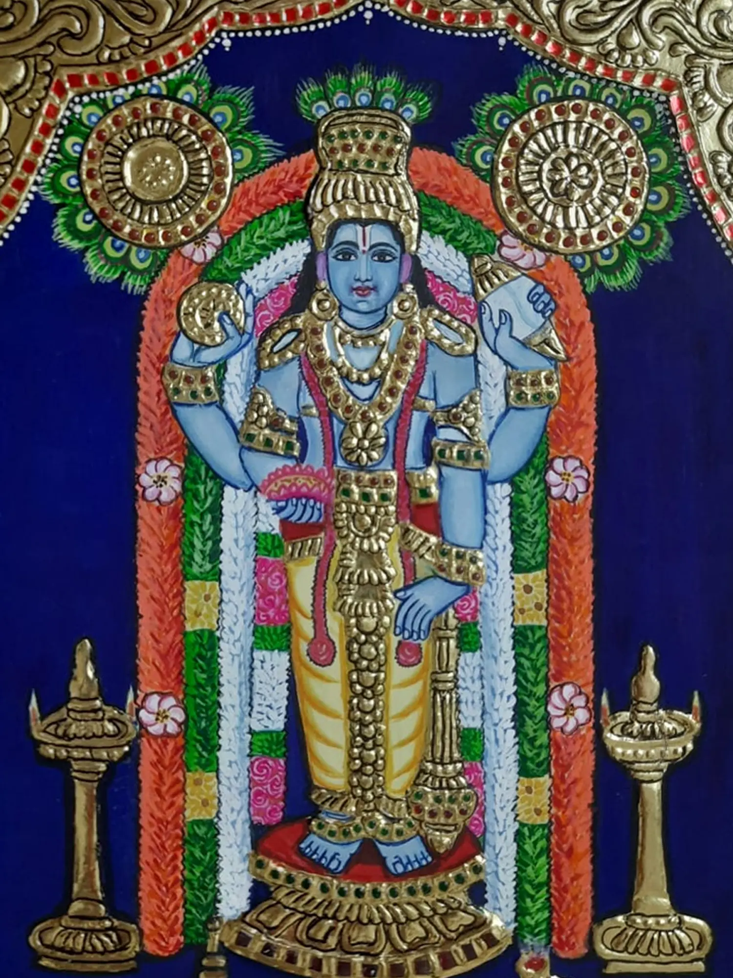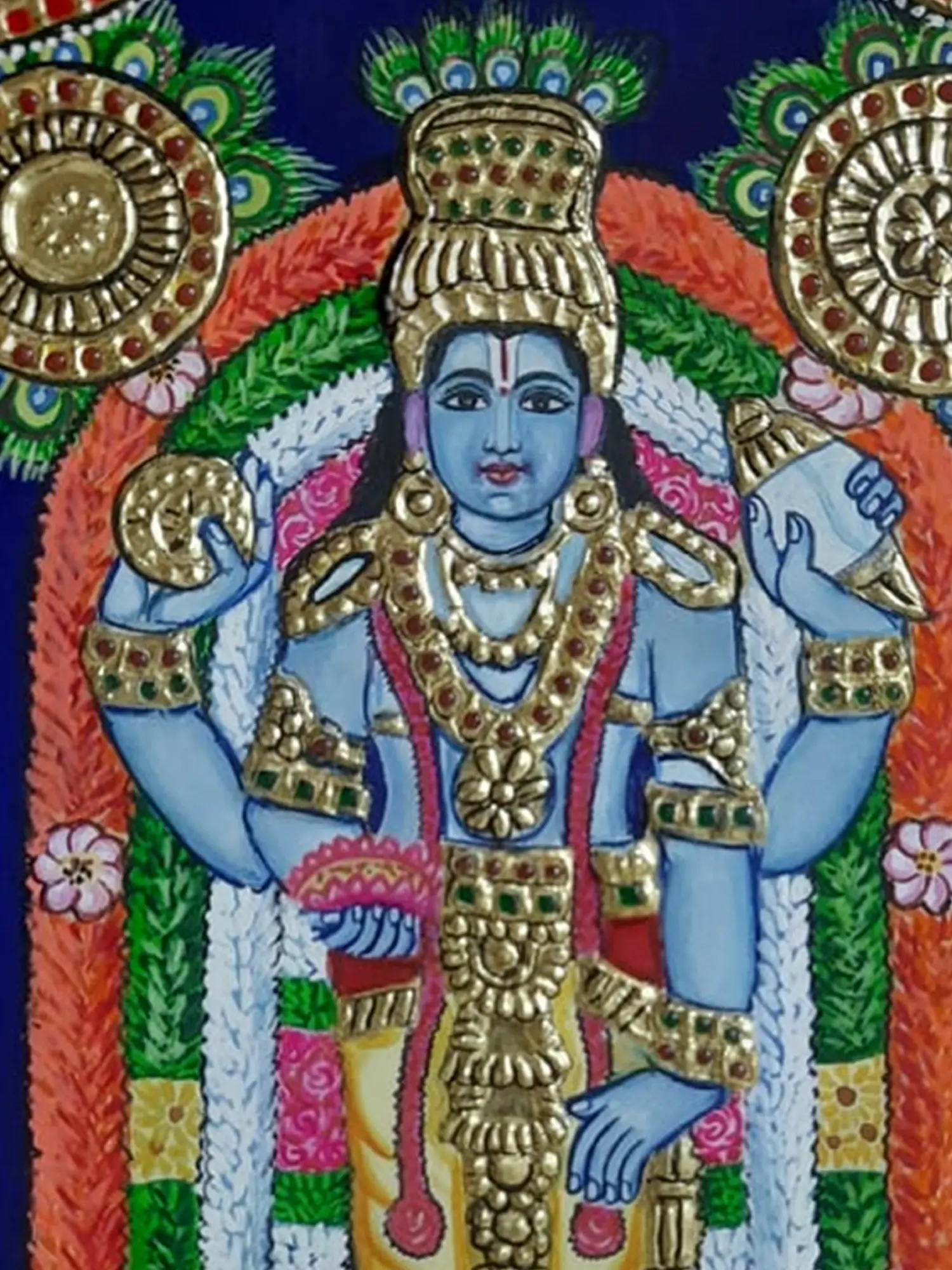 Krishna as four-armed Vishnu appears adorned with floral garlands, gold ornaments, and the iconic peacock feather around his head, symbolizing his playful yet cosmic nature.