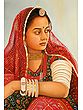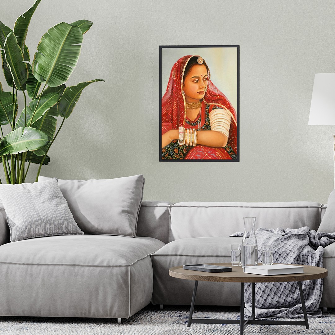 There is loveliness in Indian traditional attire, which is enhanced only by the incomparable grace of the women who wear it. The dusky beauty in this oil painting is dressed in striking red attire, which is embellished with the distinctive white dots of Bandhani- a textile from Rajasthan. Her jewelry is intricately delineated and represents the exquisiteness of traditional Indian ornaments. With the blossoms and auspicious red of her dress and the magnetism of her eyes, the lady embodies the allure of Indian beauty.