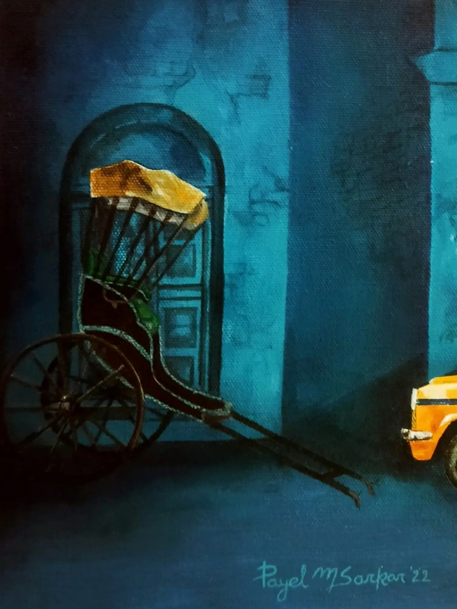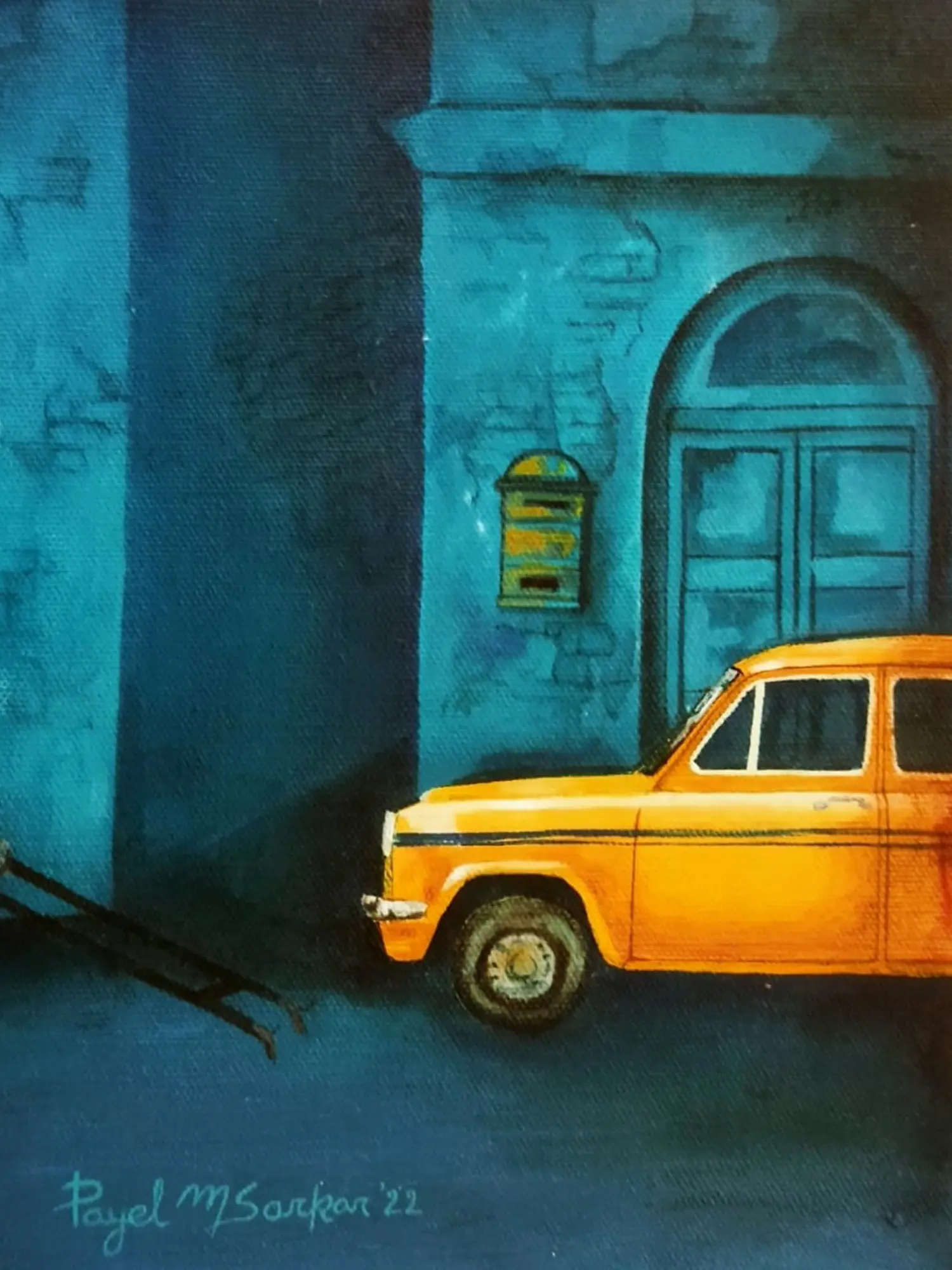 Payel Mitra’s unique artistic style is evident in her sensitive portrayal of this urban landscape. The muted color palette, the careful rendering of textures, and the evocative use of light and shadow work together to create a painting that is both visually arresting and emotionally resonant. The artist doesn't just depict a scene; she creates a mood, a feeling. It’s a snapshot of everyday life, yet imbued with a poetic sensibility that elevates it beyond the ordinary. The skillful interplay between the teal tones and the pop of yellow from the taxi creates a dynamic contrast, drawing the eye and further emphasizing the juxtaposition of old and new in the scene.