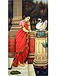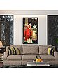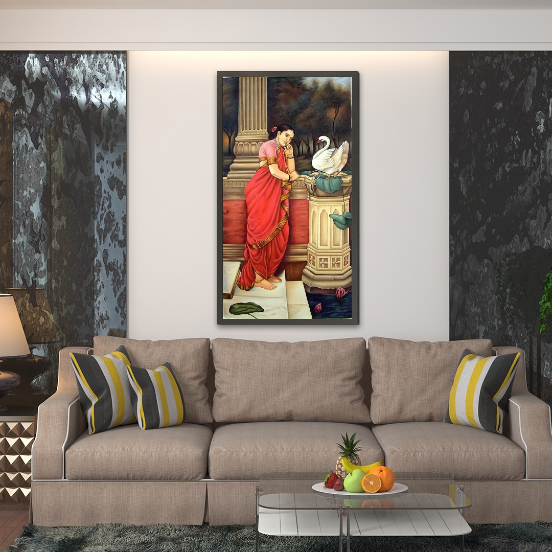 A reproduction of a work of the same name by Raja Ravi Varma, this oil painting of Hans-Damayanti depicts the heroine of the legend of Nala-Damayanti, interacting with the swan in her palace. The tale of Nala-Damayanati comes from the Mahabharata, inspired by which this exquisite artwork has been made. Damayanti draped in red and jeweled ornaments, faces Hans, who appears to have descended moments ago. As a symbol of love, Hans in this painting represents the condition of Damayanti’s heart.