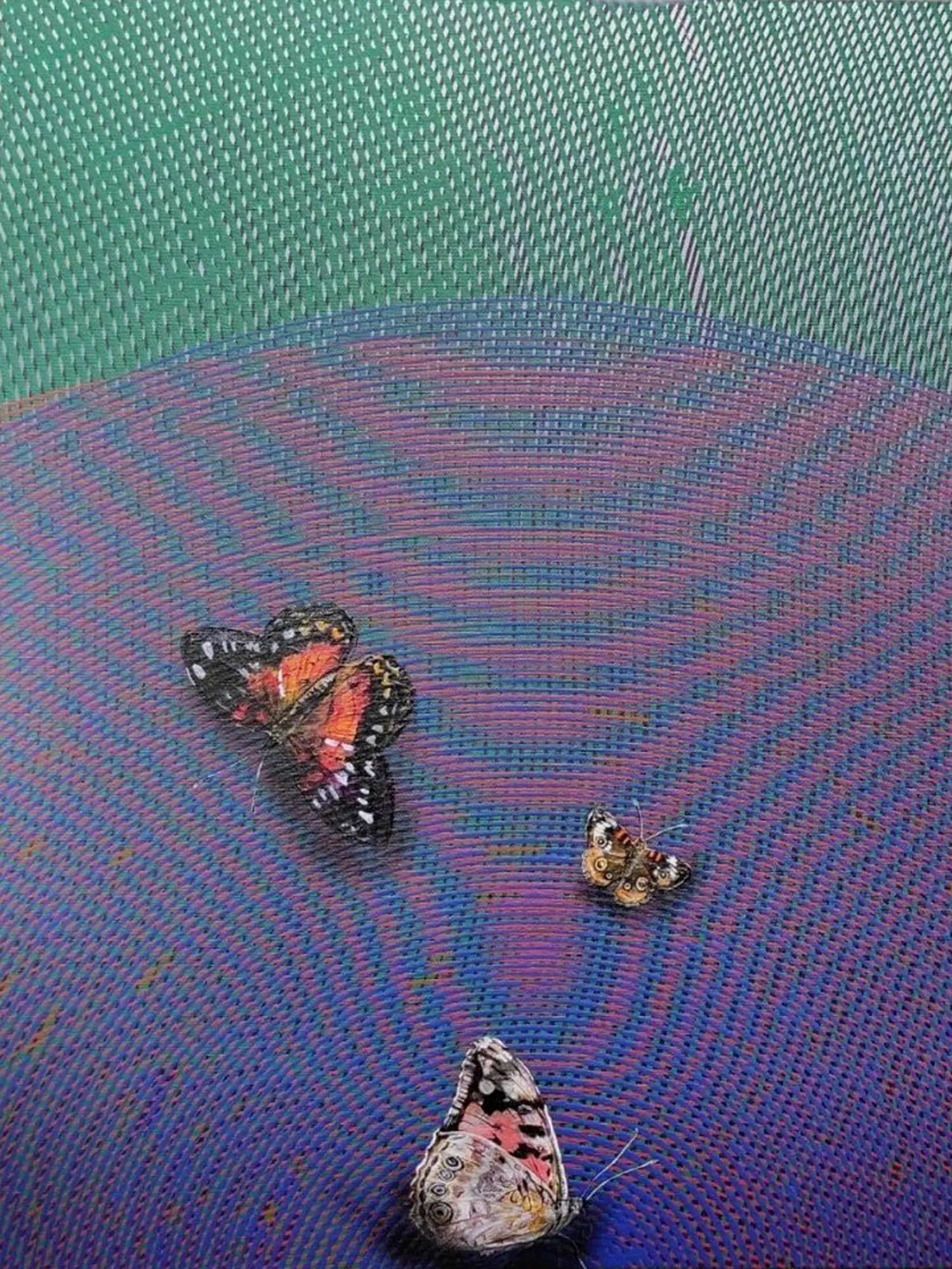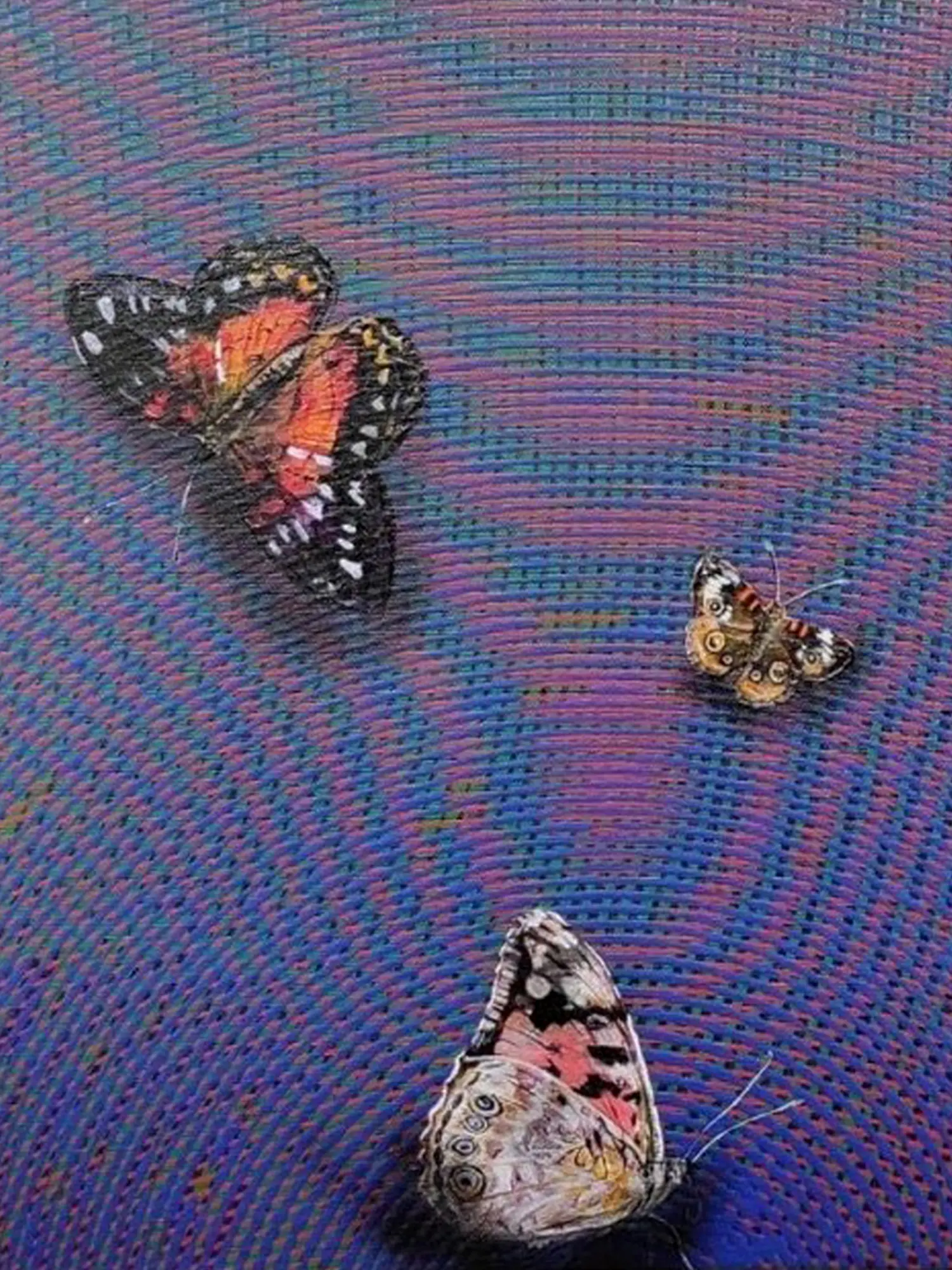 The painting features three butterflies in sharp focus against an abstract background. The textures in the background are meticulously rendered, creating a captivating visual depth. The interplay of colors and patterns evokes a sense of movement and dynamism, as though the butterflies are suspended in mid-air, dancing to a silent melody. This skillful combination of realism and abstraction is a hallmark of Gupta's artistic style, showcasing his ability to blend technical precision with imaginative expression.