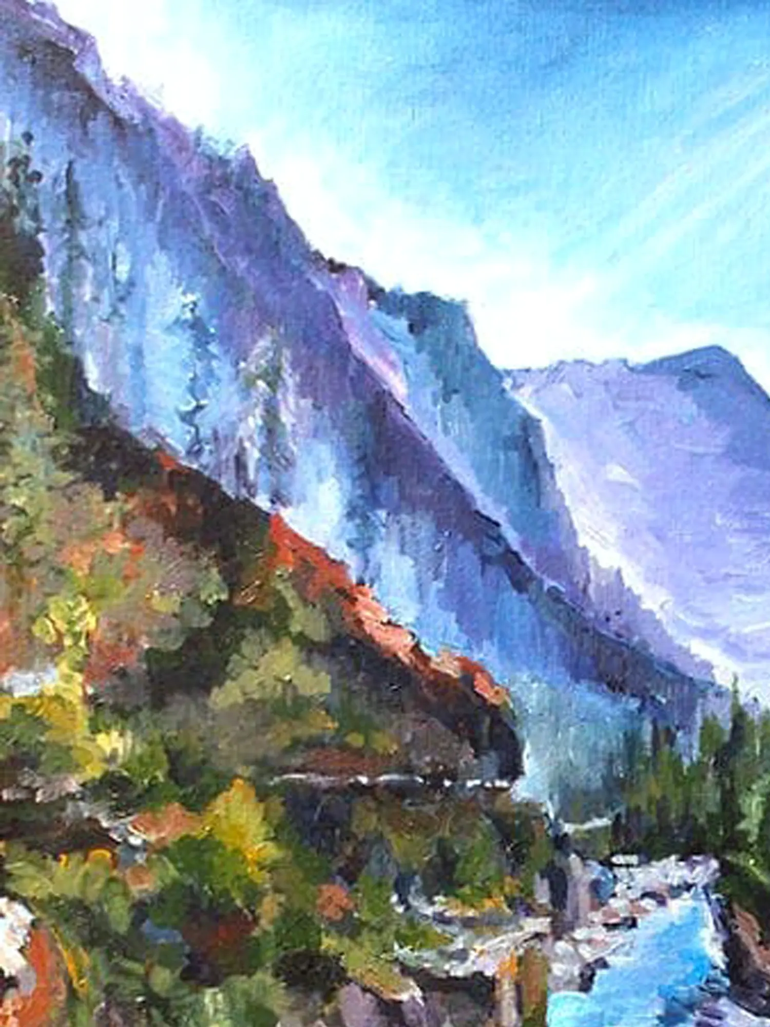 The interplay of light and shadow across the towering peaks and the rushing river is truly captivating. Notice how the artist captures the glint of sunlight on the water and the cool, shadowed recesses of the mountains, creating a dynamic visual narrative. The generous 30 by 24-inch canvas provides ample space for this compelling composition to unfold, inviting your eye to explore every detail.
