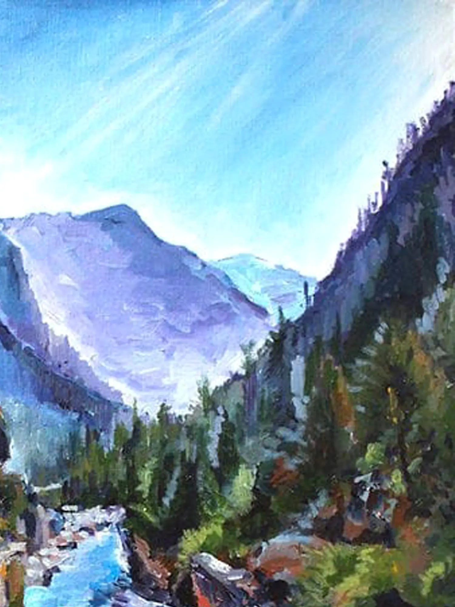 Transport yourself to the majestic Himalayas with this breathtaking acrylic on canvas, a window to a world of untamed natural splendor. You'll feel the crisp mountain air and hear the gentle roar of the river as you gaze upon this evocative landscape, a testament to nature's enduring power and beauty.