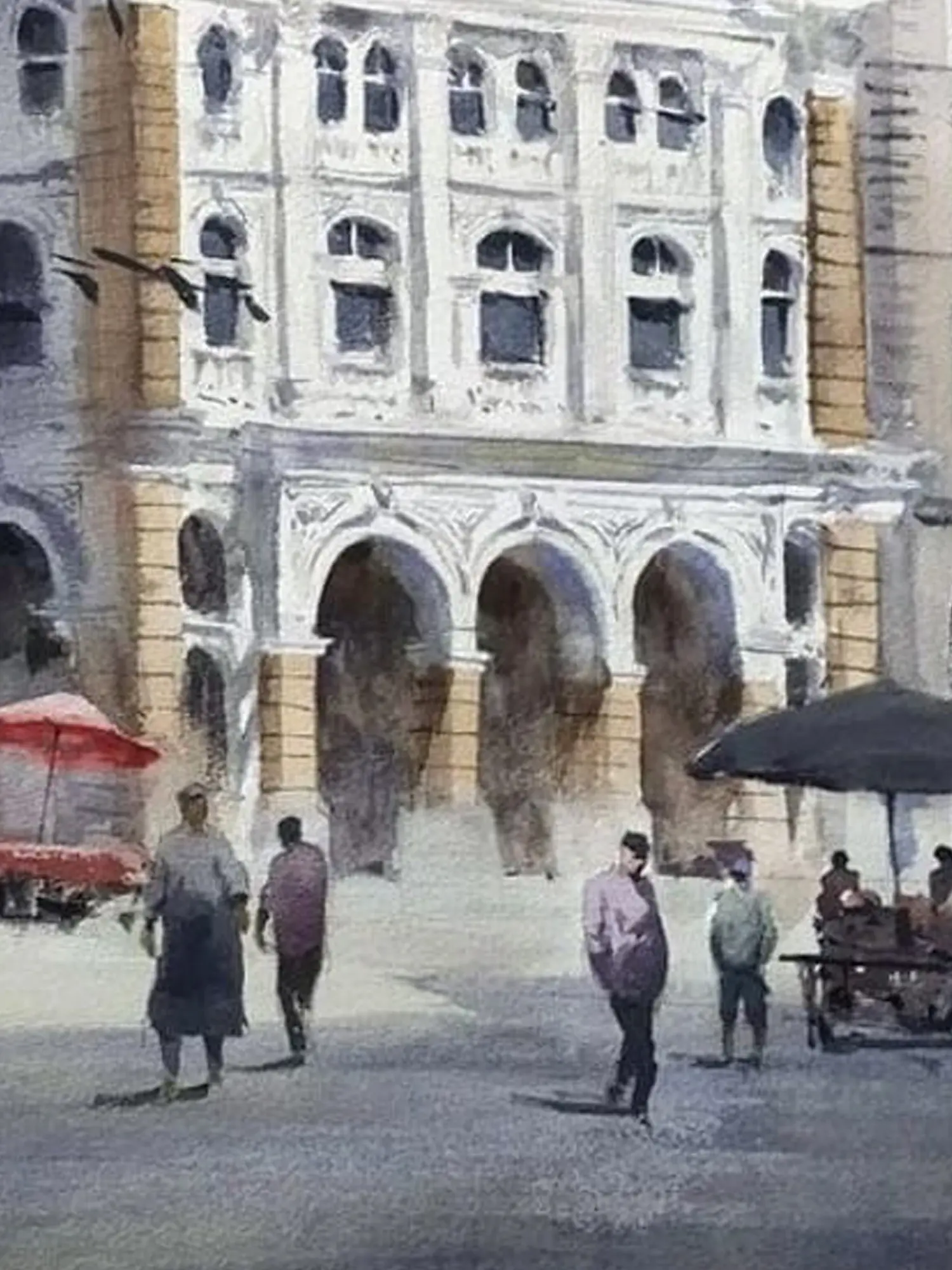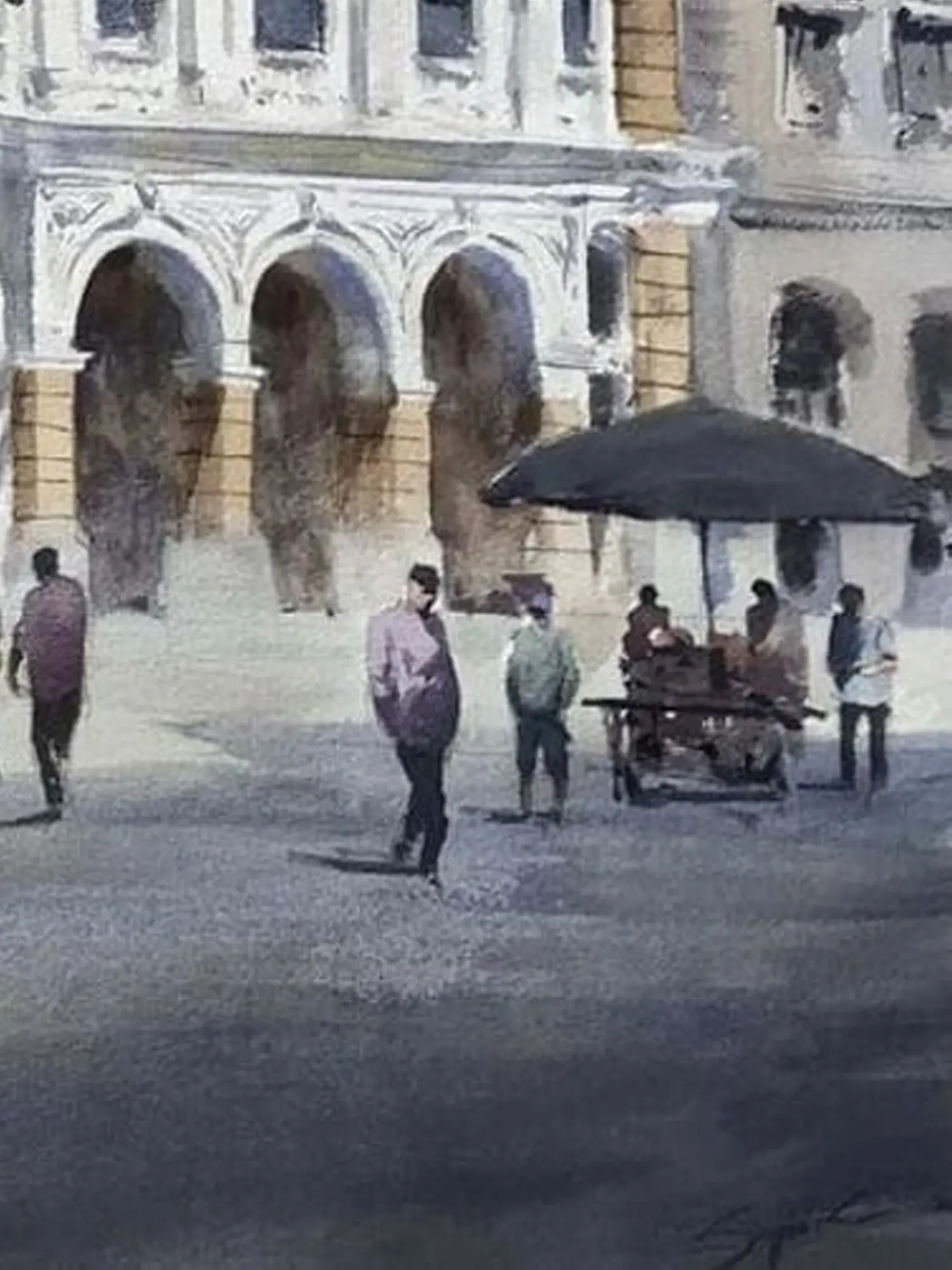 Immerse yourself in the grandeur of Mumbai's architectural heritage, captured with exquisite detail and soulful expression. This evocative watercolor invites you to step onto a bustling street, experiencing the vibrant energy and storied past of a magnificent edifice. You'll find yourself drawn into a scene that is both monumental and intimately human.