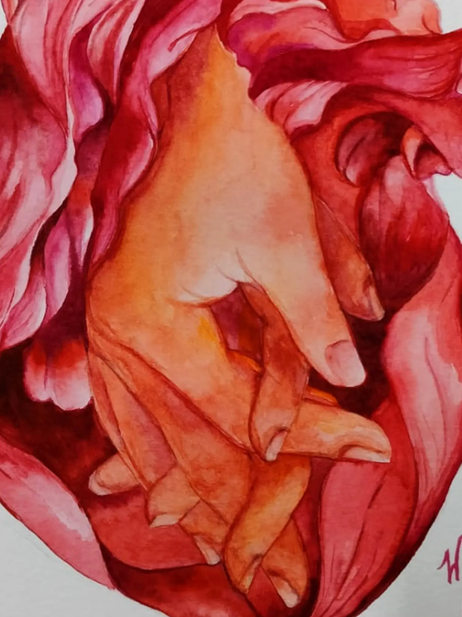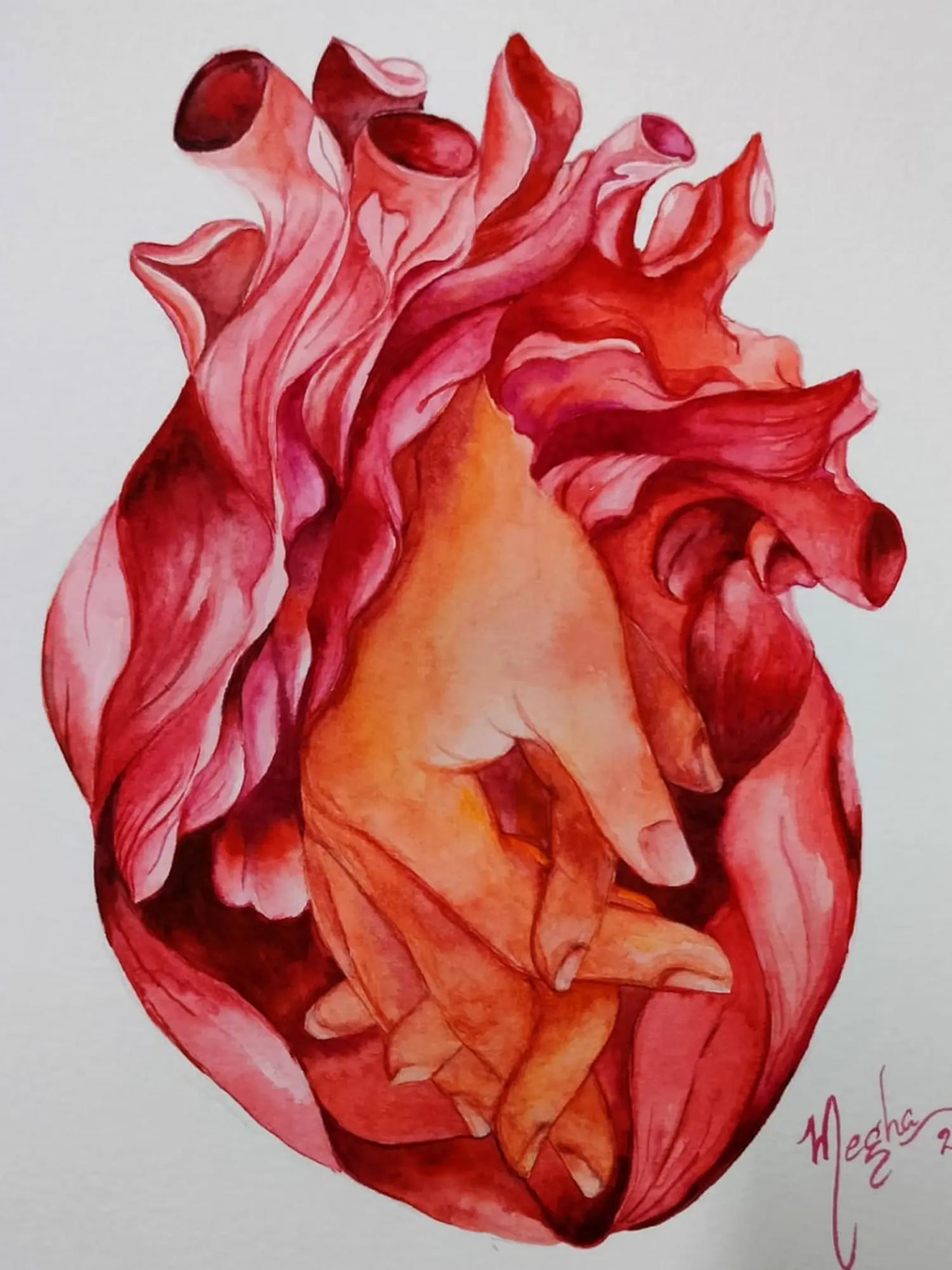In the symphony of emotions, the heart often becomes a poignant melody of longing, an unsung ballad echoing desires. Megha Chakraborty, in her art, embodies this yearning through a symbolic portrayal, a human heart cradled by two hands, reaching for a connection.