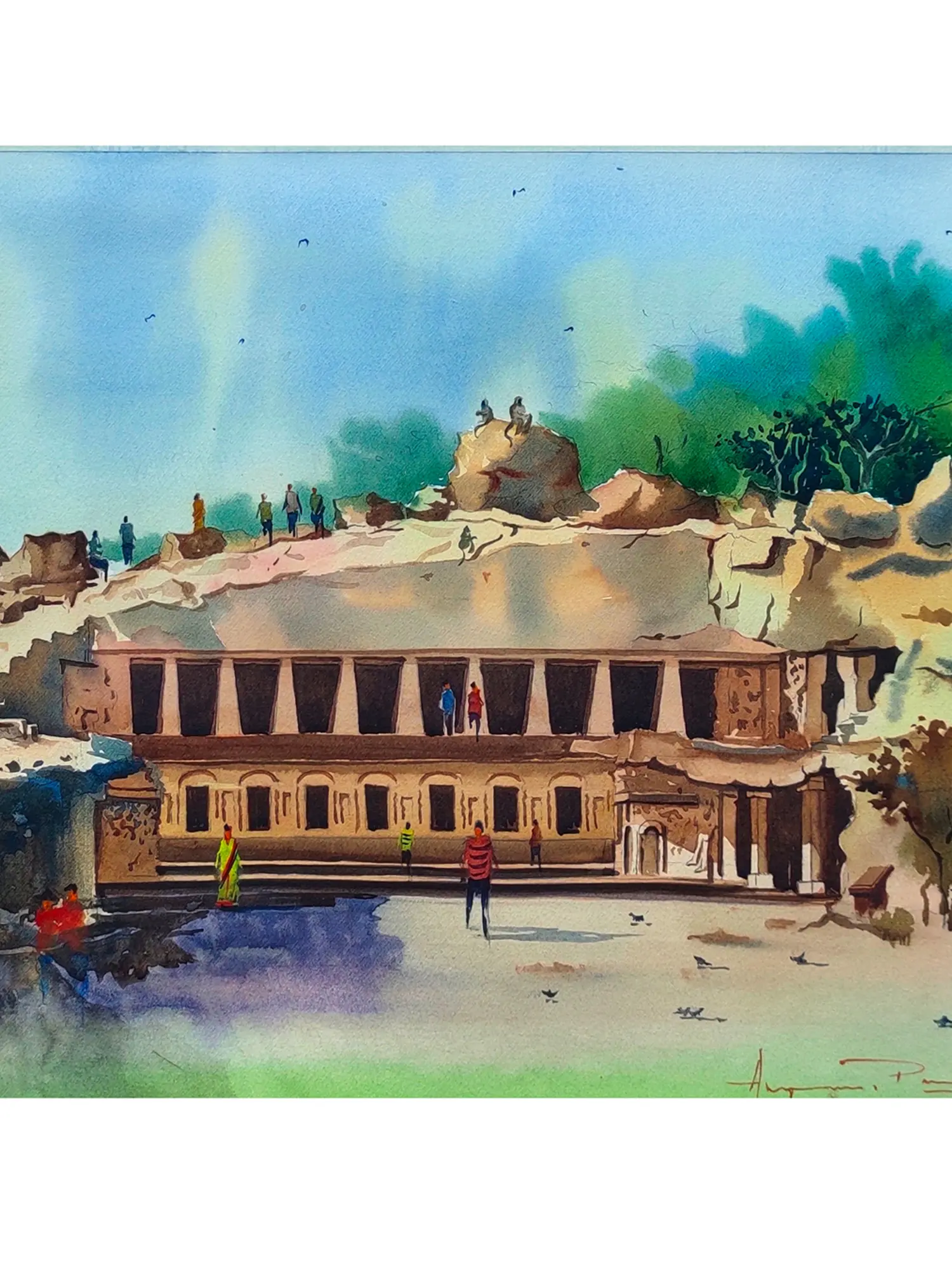 The composition unfolds across the 13.00 inches of height and 21.00 inches of width, drawing your eye across the scene with graceful ease. The vibrant blues of the sky transition into soft, dappled clouds, while the earthy tones of the rock face and architecture are brought to life with nuanced washes of color. Verdant foliage frames the upper reaches, providing a rich contrast to the sun-baked stone. The artist’s subtle inclusion of figures adds a human element, suggesting a living, breathing place.