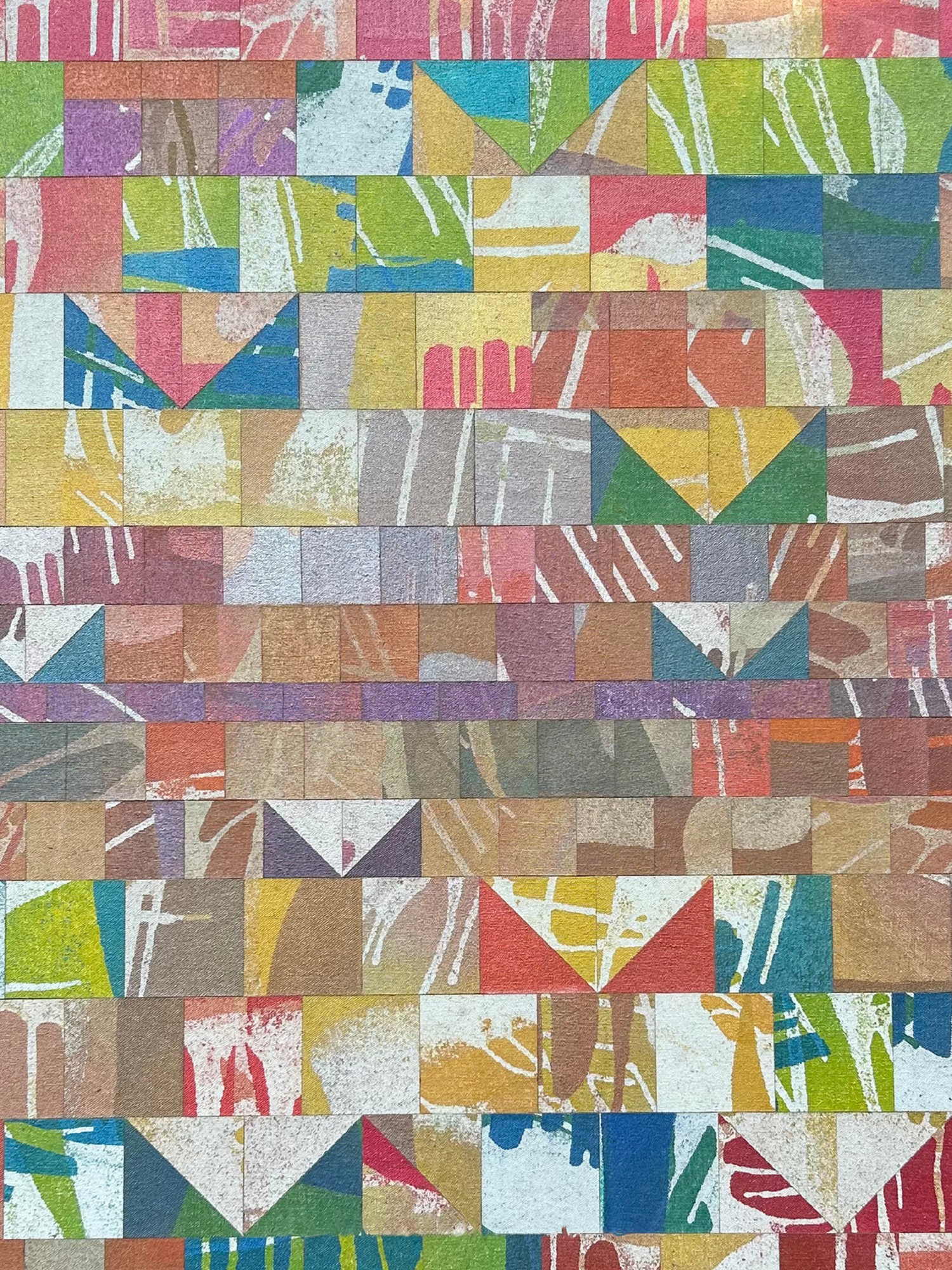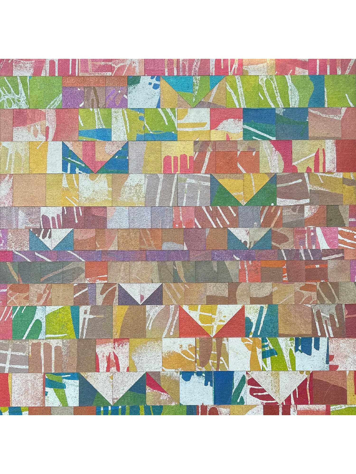This artwork resonates with a modern sensibility, drawing inspiration from the vibrant energy and exploratory spirit of abstract expressionism. While modern in its execution, it evokes a timeless appeal, reminiscent of mosaic artistry found across ancient cultures, celebrating the enduring power of geometric patterns and harmonious color palettes to uplift and inspire.