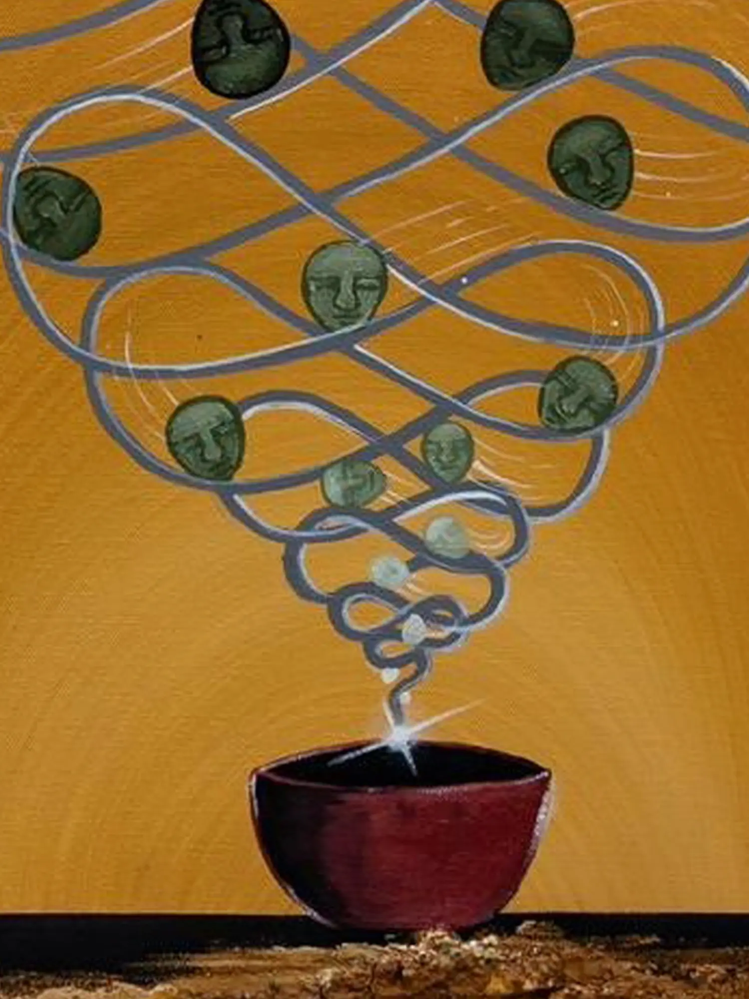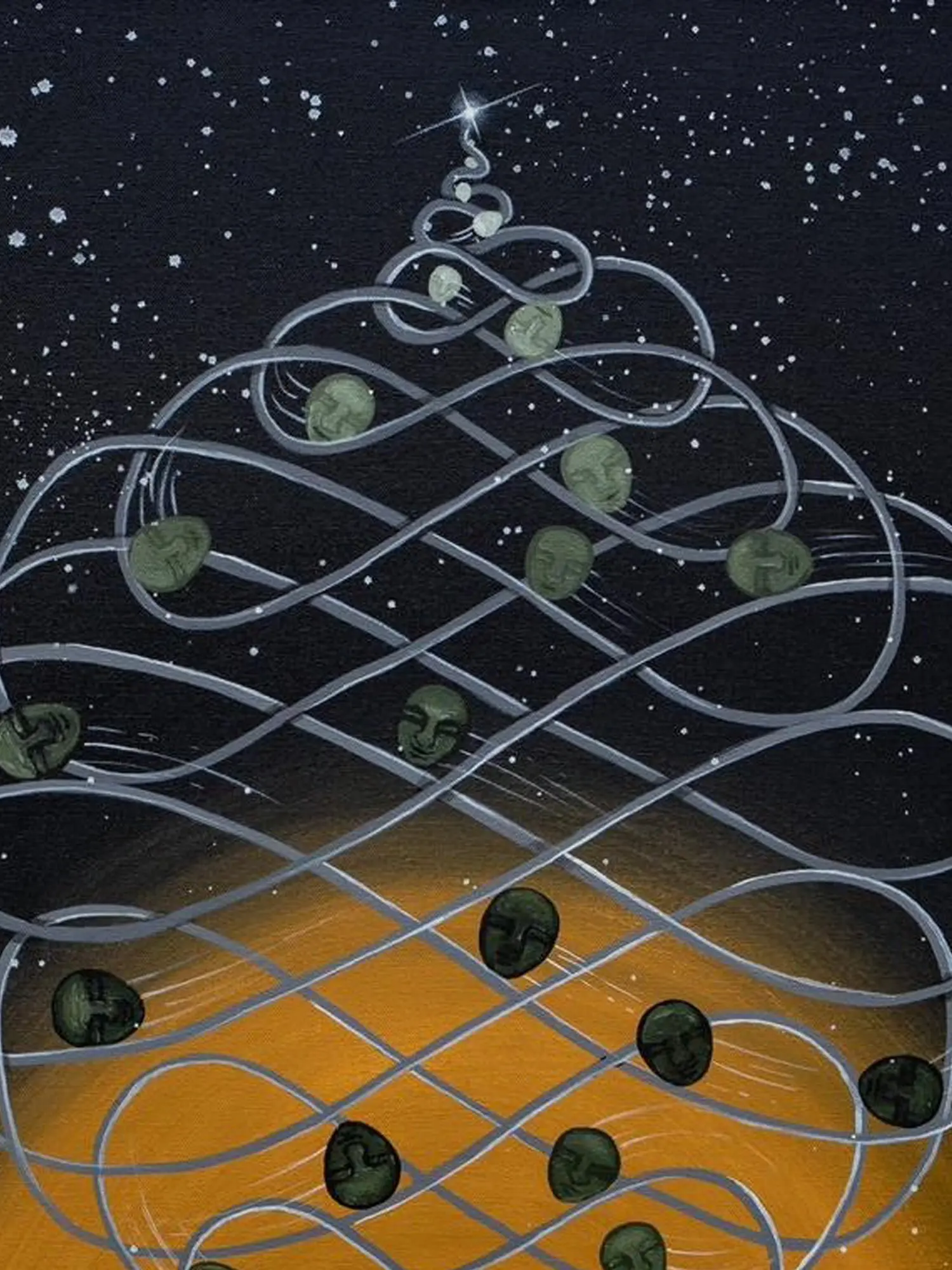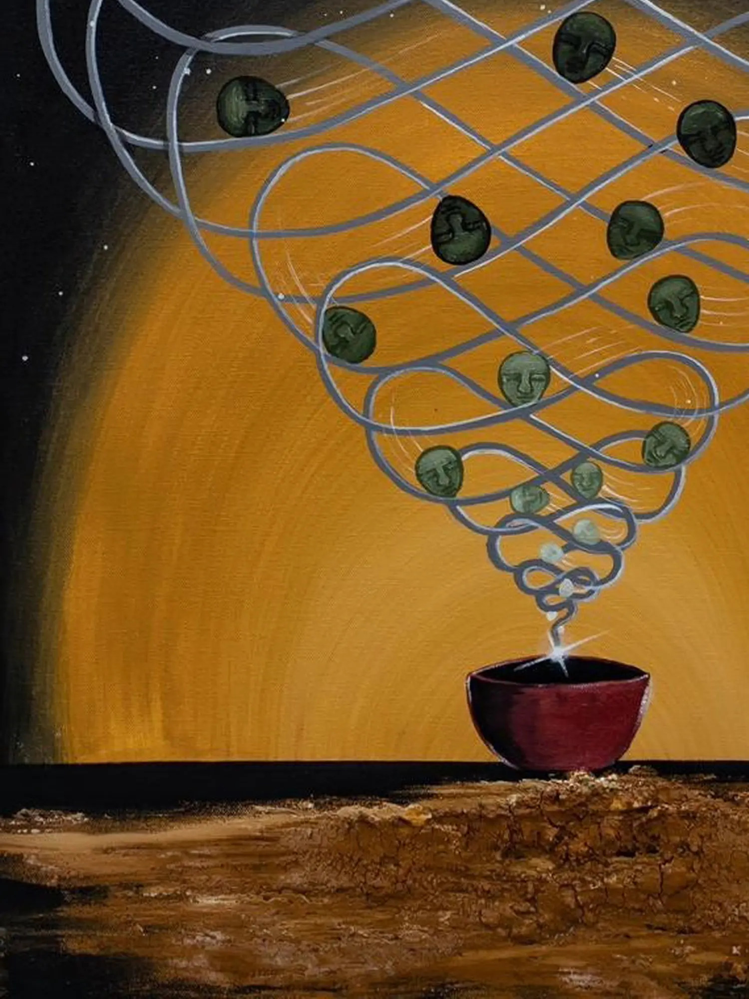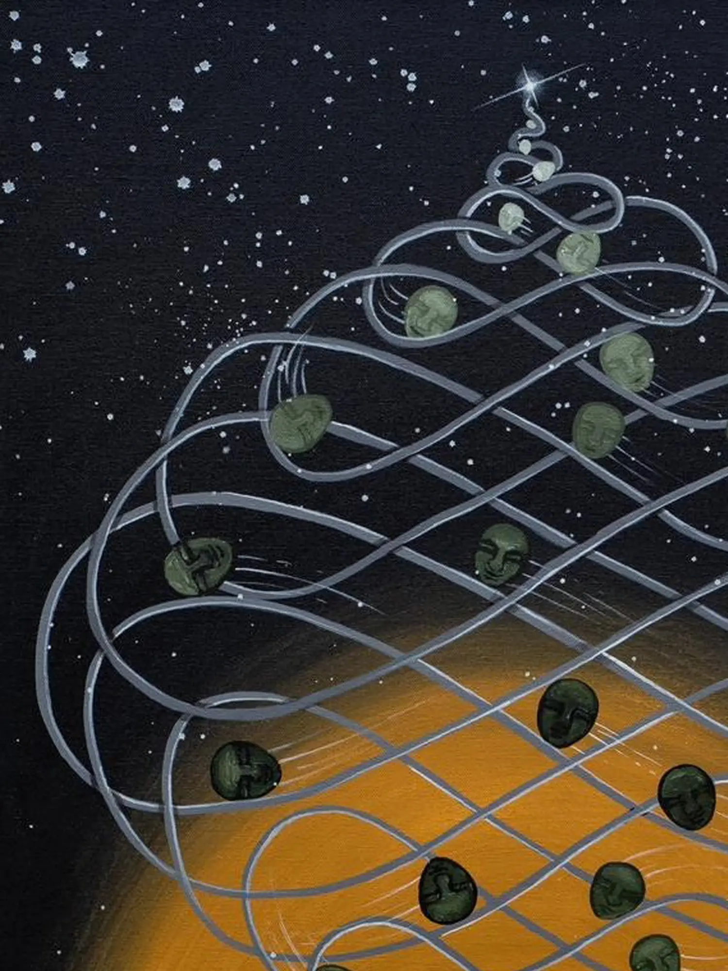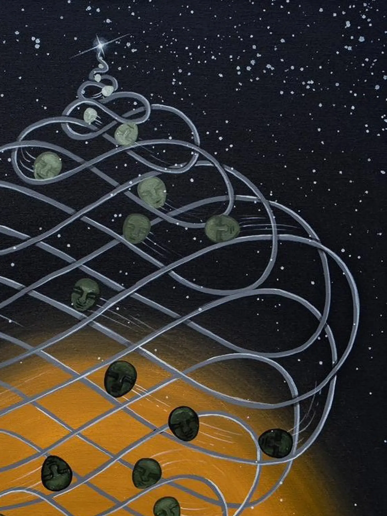 Embark on a journey of cosmic exploration with this acrylic piece that transcends the boundaries of space and time - in chromosome like motifs, the painting traces the cyclical nature of existence, from the boundless expanse of infinity to the finite confines of earthly reality and back again. Through colours and shapes, the artist invites viewers to contemplate the mysteries of the universe and embrace the eternal dance of creation and dissolution.