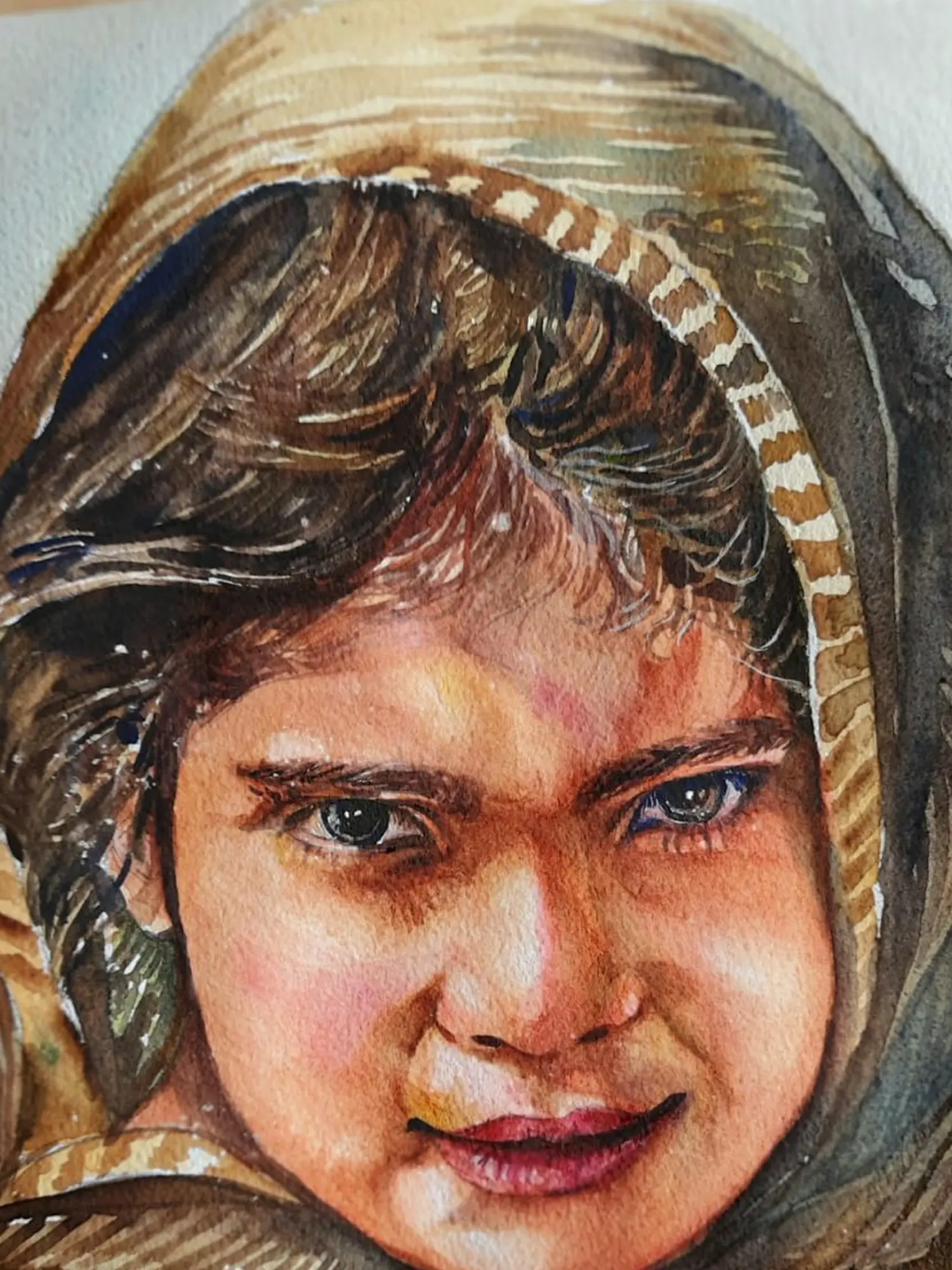 This exquisite watercolor painting, "Innocent Girl," by Priya Ghosh, captures a moment of timeless beauty. The young subject, veiled in earthy tones, holds the viewer's gaze with an intensity that belies her age. Her eyes, a captivating blend of browns and greens, seem to hold both wisdom and a hint of apprehension, reflecting a depth of emotion rarely seen in such a youthful countenance. The artist masterfully uses the watercolor medium to create soft transitions and subtle shading, bringing life to the girl’s delicate features. The details in her hair, the texture of the fabric, and the slight curve of her lips are all rendered with astonishing precision, speaking volumes about the artist's talent and sensitivity. The composition is intimate, drawing the observer into the girl's world and inviting contemplation of her story.