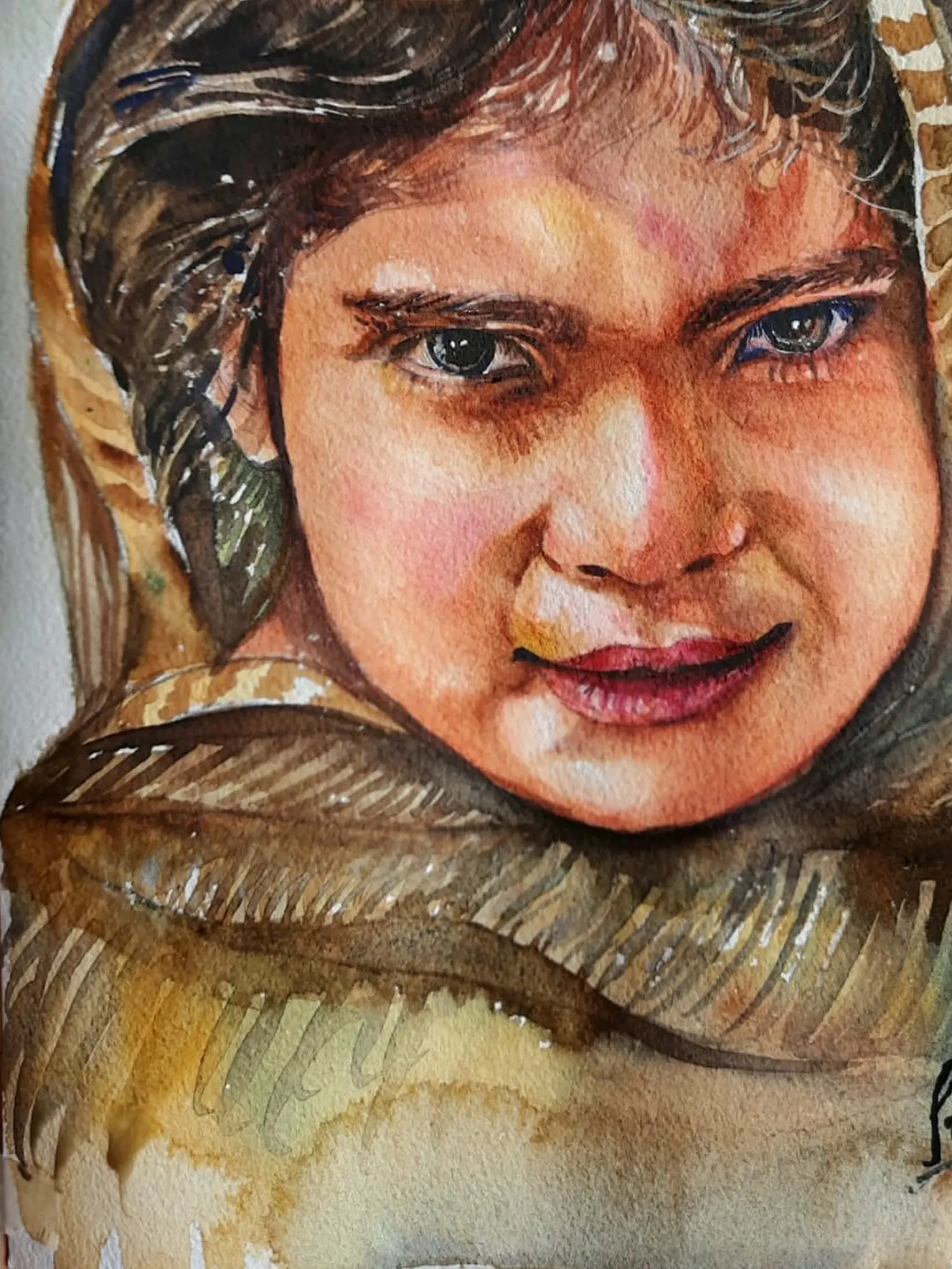 Priya Ghosh’s artistic skill shines through in the delicate rendering of this piece. Her use of watercolor is impeccable, capturing the subtle nuances of light and shadow with breathtaking accuracy. The painting is not merely a representation of a girl; it is a meditation on innocence, resilience, and the complexities of youth. Ghosh's mastery of color and technique elevates the painting beyond mere portraiture, transforming it into a work of art that resonates deeply with the viewer. The artist's signature subtly placed at the bottom adds a final touch of elegance and authenticity to this beautiful creation.