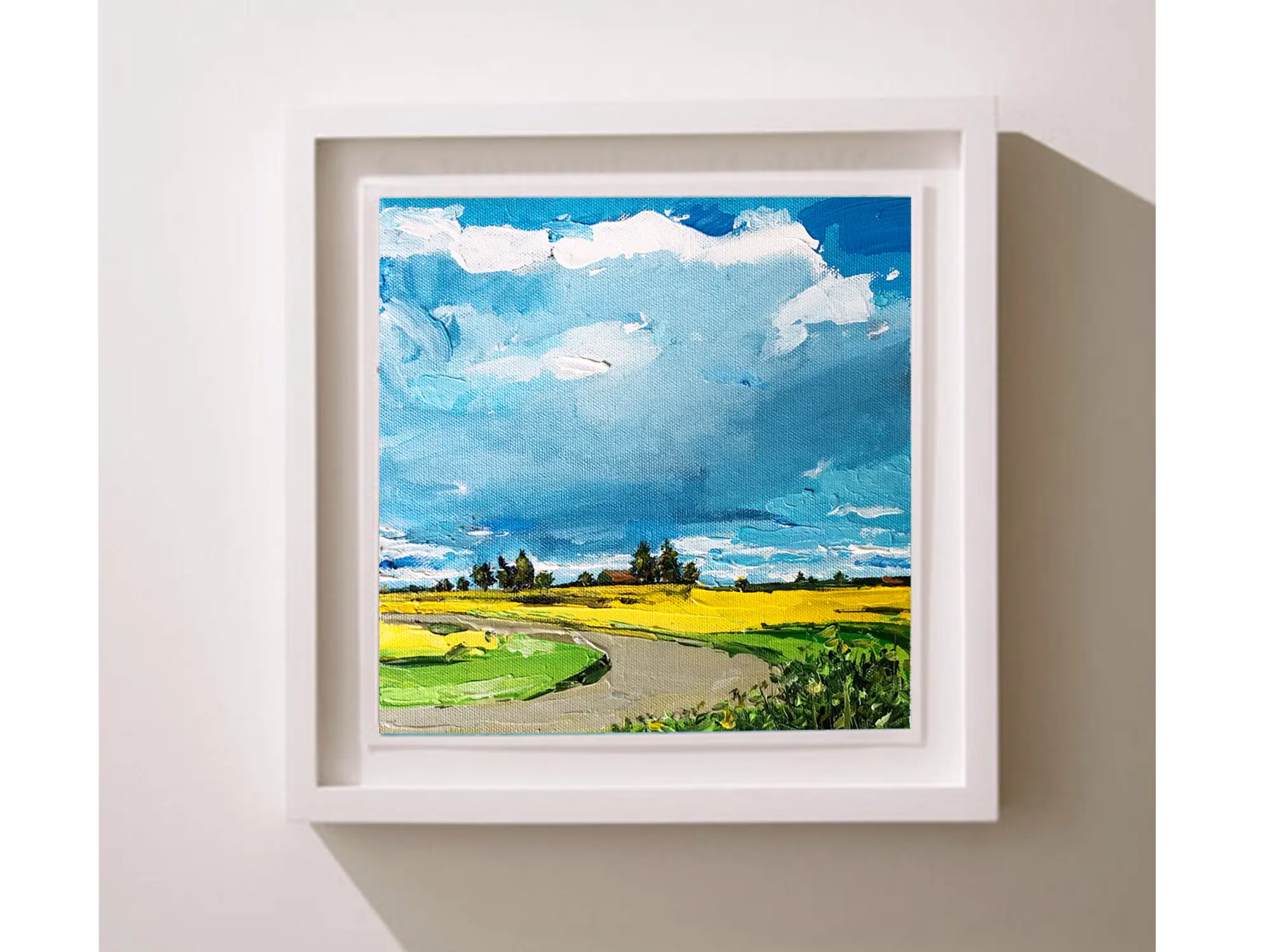 The contrasting colors of the sky and the fields create a visually striking composition, making the artwork a delightful celebration of nature's beauty and the artist's ability to transport viewers into the heart of a serene countryside.