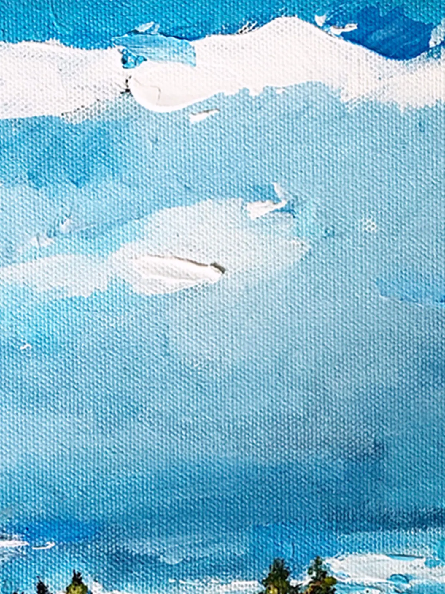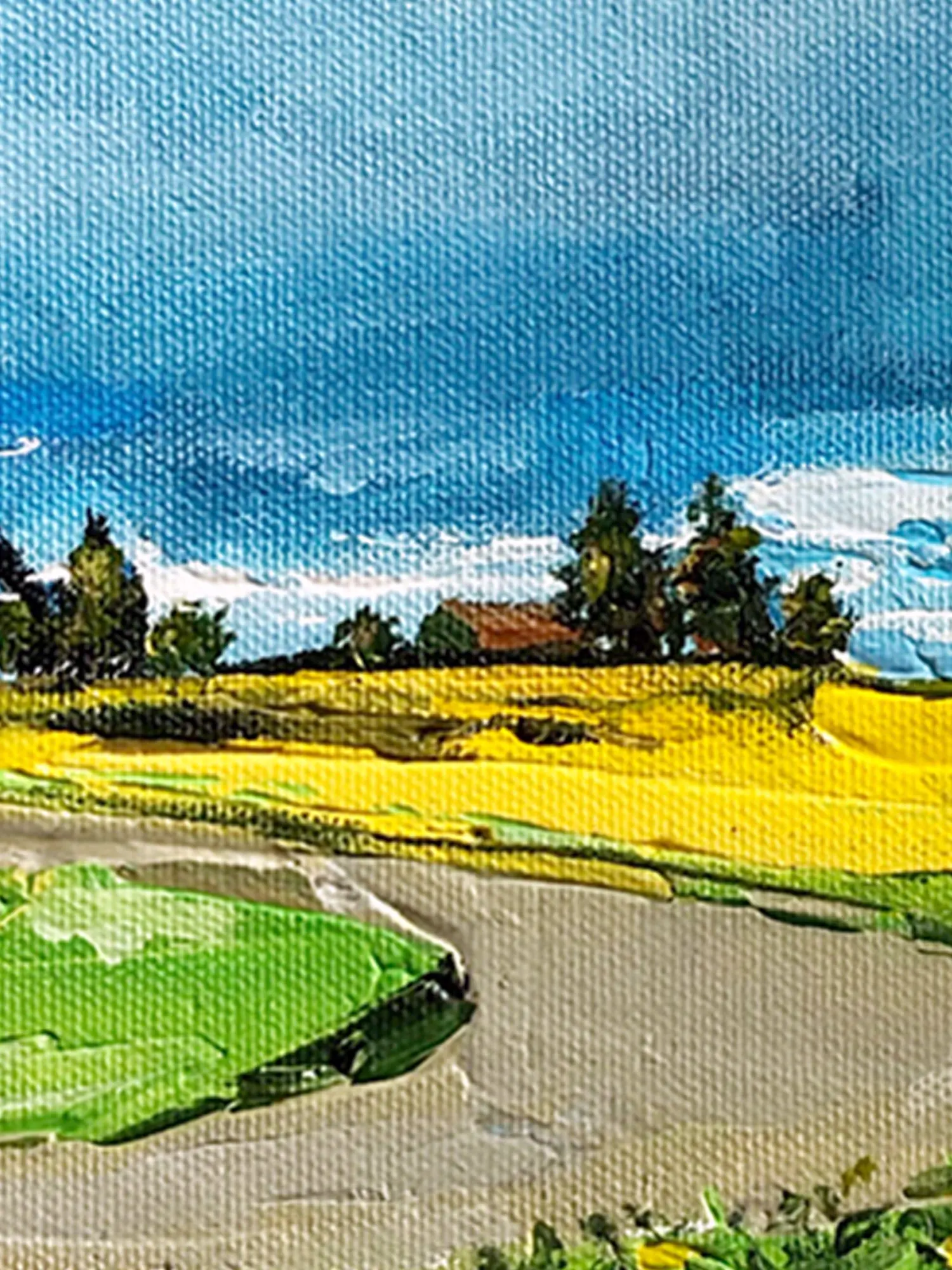 Into The Yellow Fields with Blue Skies, an acrylic on canvas by Mitisha Vakil, presents a captivating rural landscape. The painting features a serene blue sky reminiscent of a tranquil countryside scene. Amidst the canvas, vibrant yellow fields stretch into the distance, framing a quaint house. The artist's skillful use of acrylic captures the essence of idyllic scenery, evoking a sense of peace and harmony.