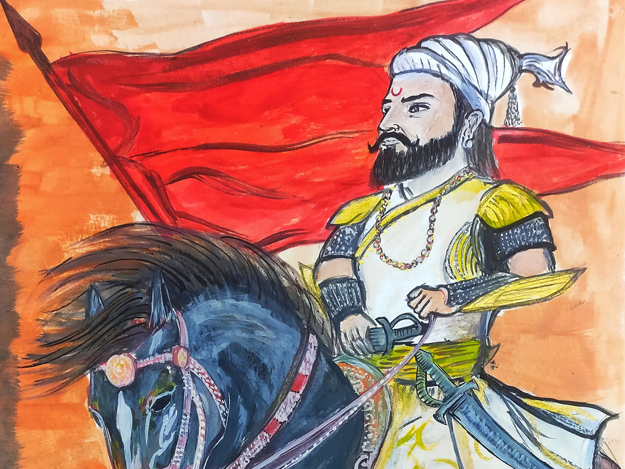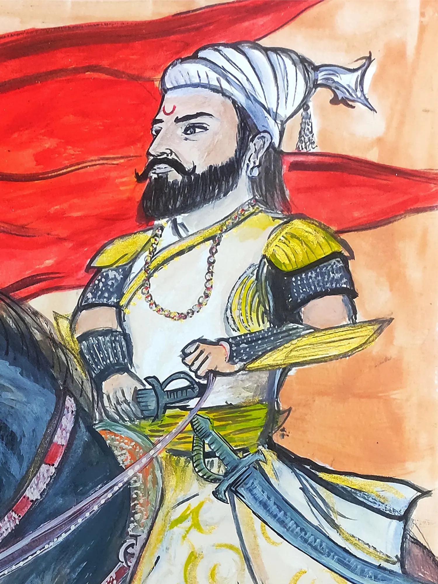 This portrayal pays homage to a pivotal figure in Maratha history, a leader whose indomitable spirit continues to inspire generations. The presence of the vibrant red flag symbolizes triumph and the unwavering pursuit of justice, echoing the warrior's legendary campaigns for Swarajya. It represents not just an individual, but an enduring spirit of valor.