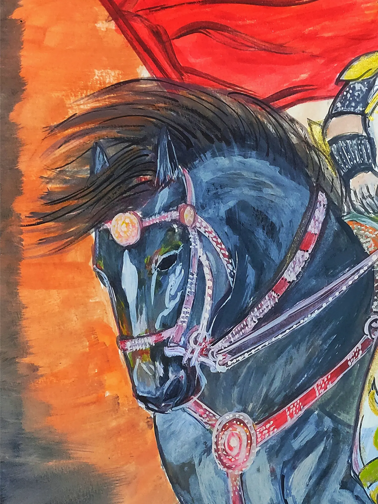 The interplay of light and shadow across the majestic horse and its rider is rendered with striking clarity. You'll appreciate the meticulous detail in the warrior's regal attire, the glint of his sabre, and the determined set of his gaze, all brought to life on a canvas that measures 16 inches in height and 12 inches in width. The deep, rich tones of the horse contrast beautifully with the fiery background, creating a truly immersive experience.