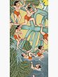 As seems to be the broad form of the represented sport, the blue-bodied Krishna occupies the centre of the tree’s trunk symbolic of the axis – much like a temple’s sanctum. Not merely a crowned turban revealing great regalia, a halo and golden footwear – his figure alone wearing in the entire composition, impart to his figure the presiding deity-like status. The painting represents above this figure of Krishna the figure of his elder brother Balarama in a gems-studded golden cap. The eleven of the rest of the twenty-two figures are males – Gopas, and other eleven, the females, the Gopis. The Gopis are in ankle-long lower wears, white or red, with upper halves being either unclad or clad in transparent muslins, and the Gopas, in stitched loincloths, red, striped, printed with golden dots and gold-bordered. Except their heads three of the Gopis are submerged in deep waters, while one on extreme right in the centre of the canvas, half-covered with tree-leaves.