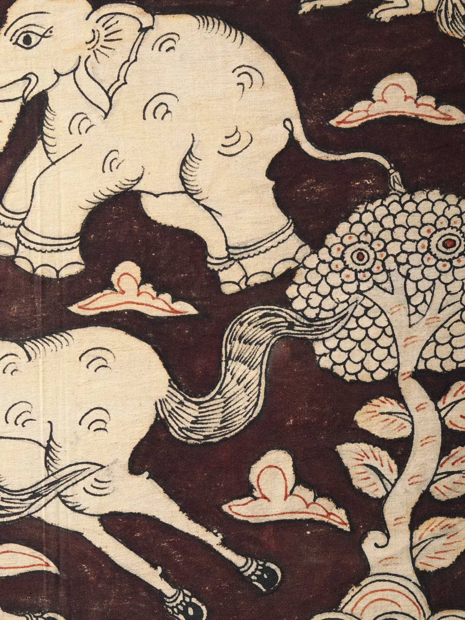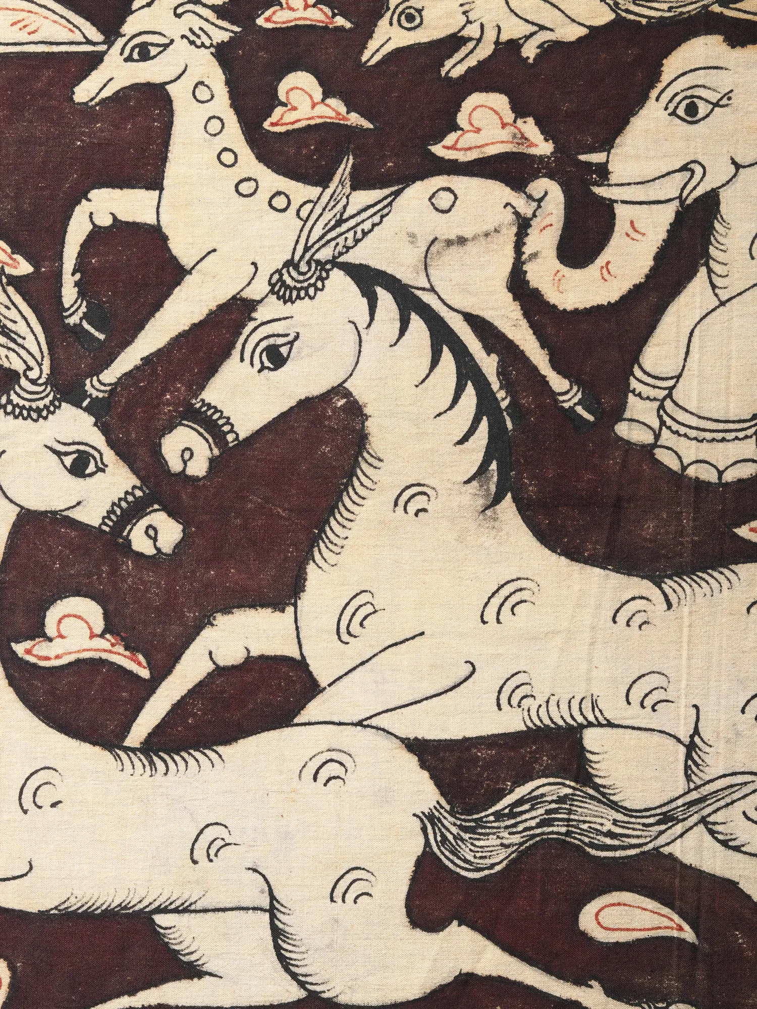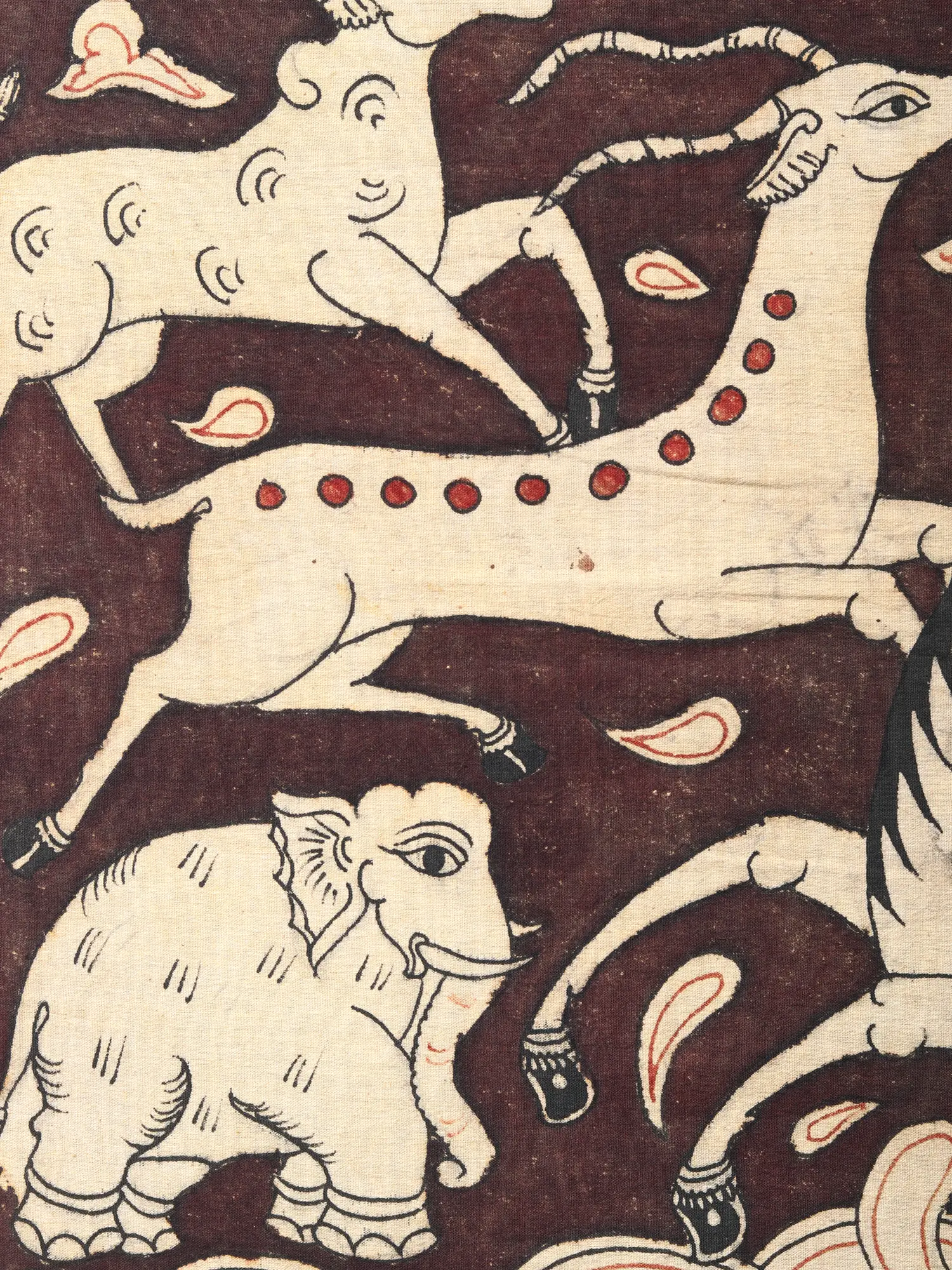 Kalamkari paintings on cotton employ natural colors, imparting distinctiveness and a matte finish to both images and backgrounds. In a masterpiece depicting the wild, the use of a magenta background serves to enhance prominence. The running elephants, deer, and horses come alive against this vibrant backdrop, showcasing the coexistence of diverse species in the untamed wilderness.