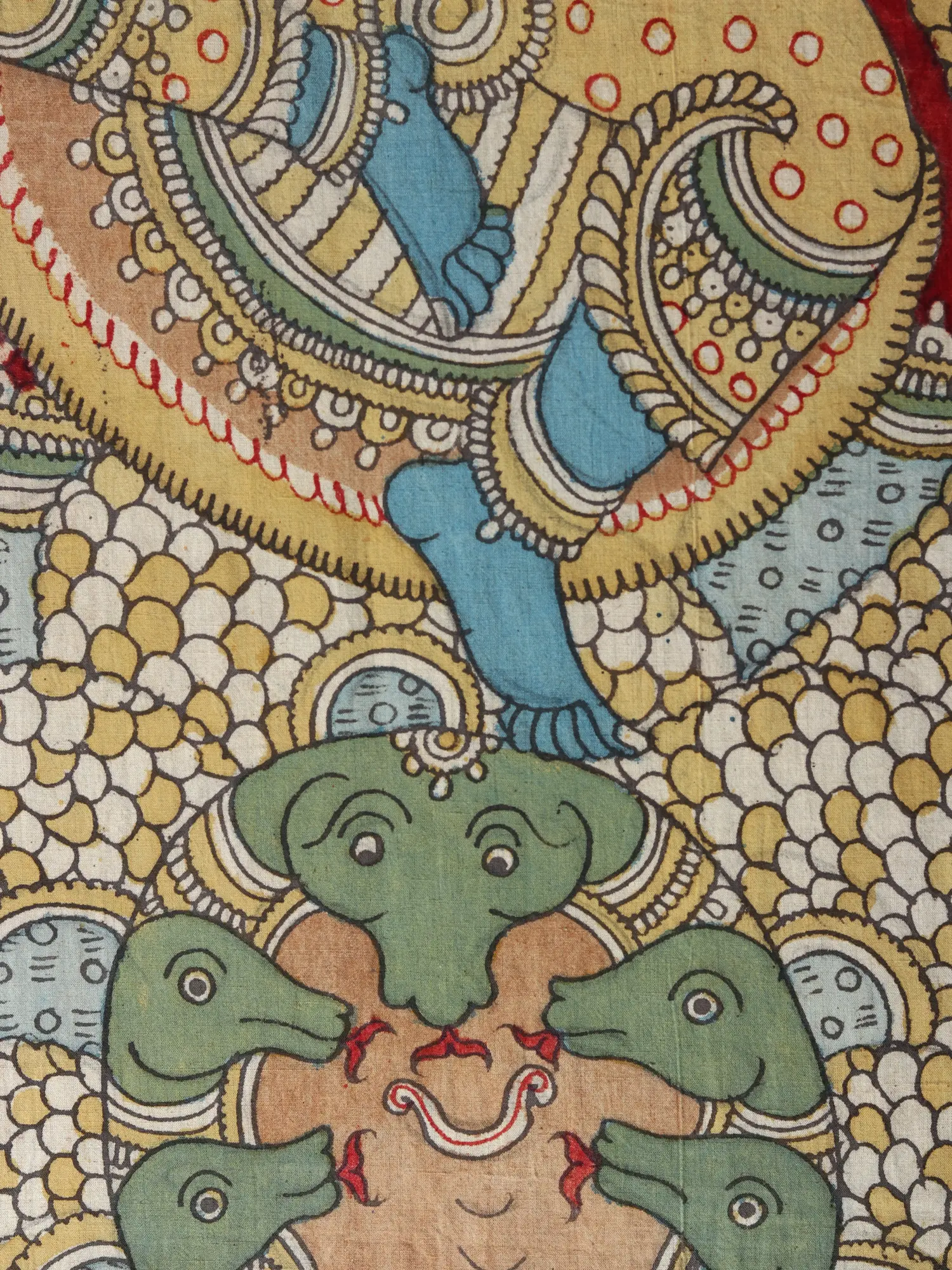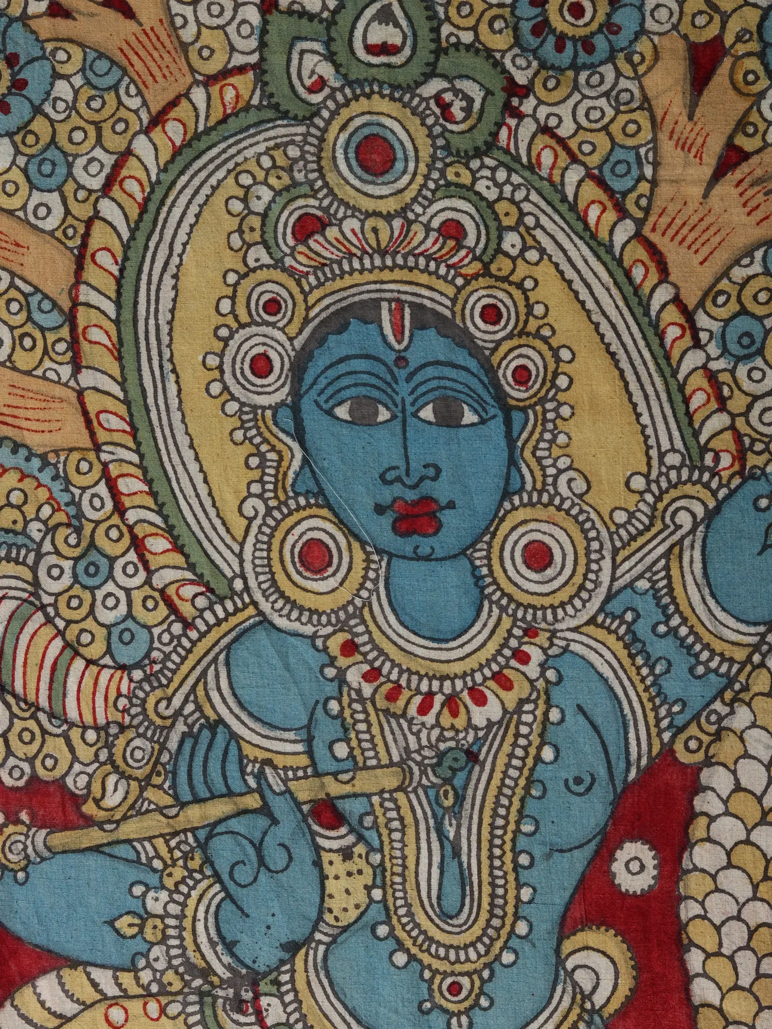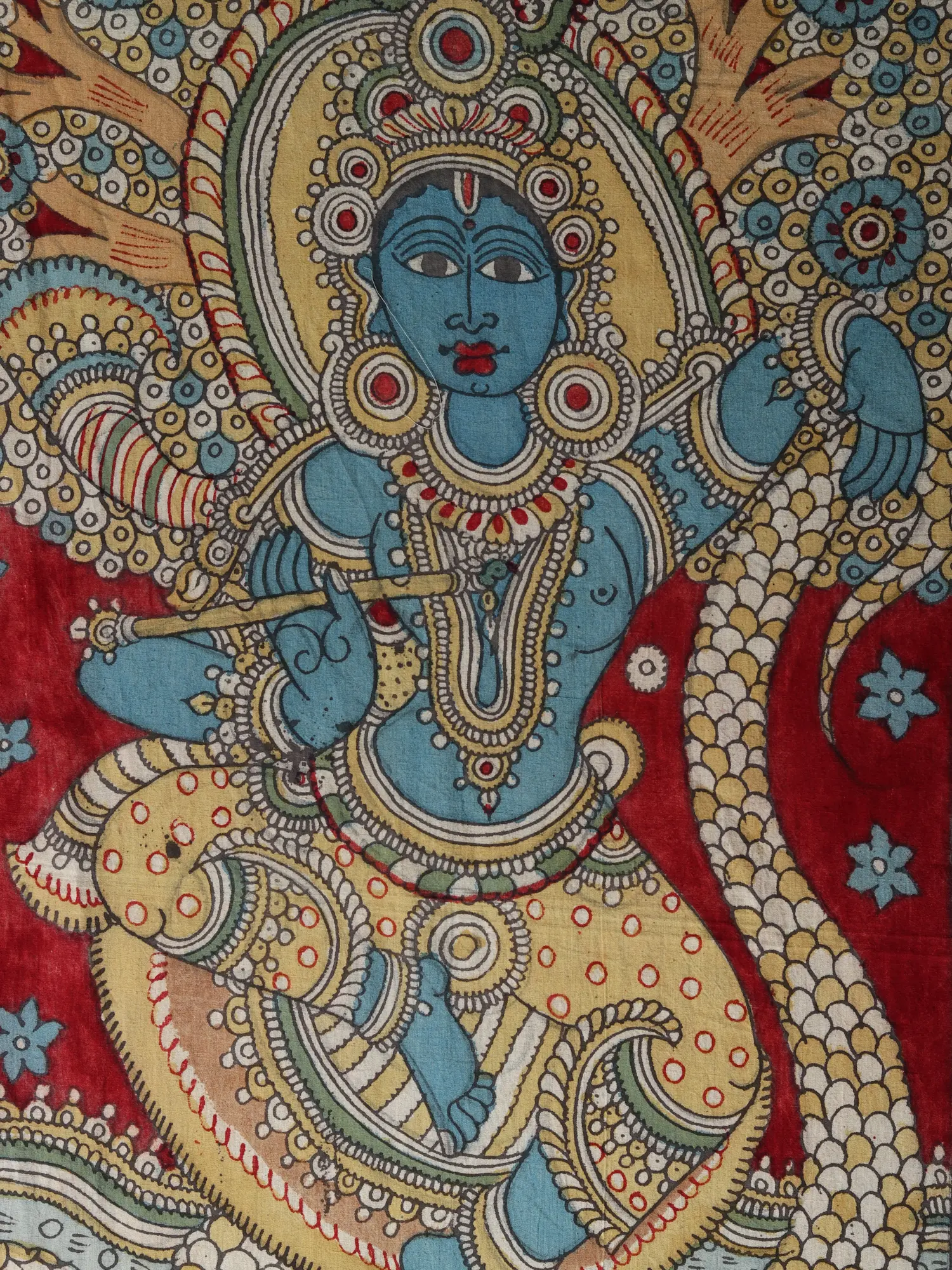 The episode of Kaliya Daman in Hindu mythology symbolizes the triumph of good over evil. Lord Krishna's victory over the serpent Kaliya represents the conquering of negative forces that threaten harmony and balance in the universe. It underscores the power of righteousness and the importance of standing against injustice. This narrative has been depicted across various art forms, including classical Indian dance, sculpture, painting, and literature. Each interpretation emphasizes different aspects of the story, showcasing the diversity of cultural expressions and the enduring relevance of its moral message. This Kaliya Mardana Krishna, Kalamkari Painting on cotton is one of such art forms that has utilised the story to establish the significance of righteousness.
