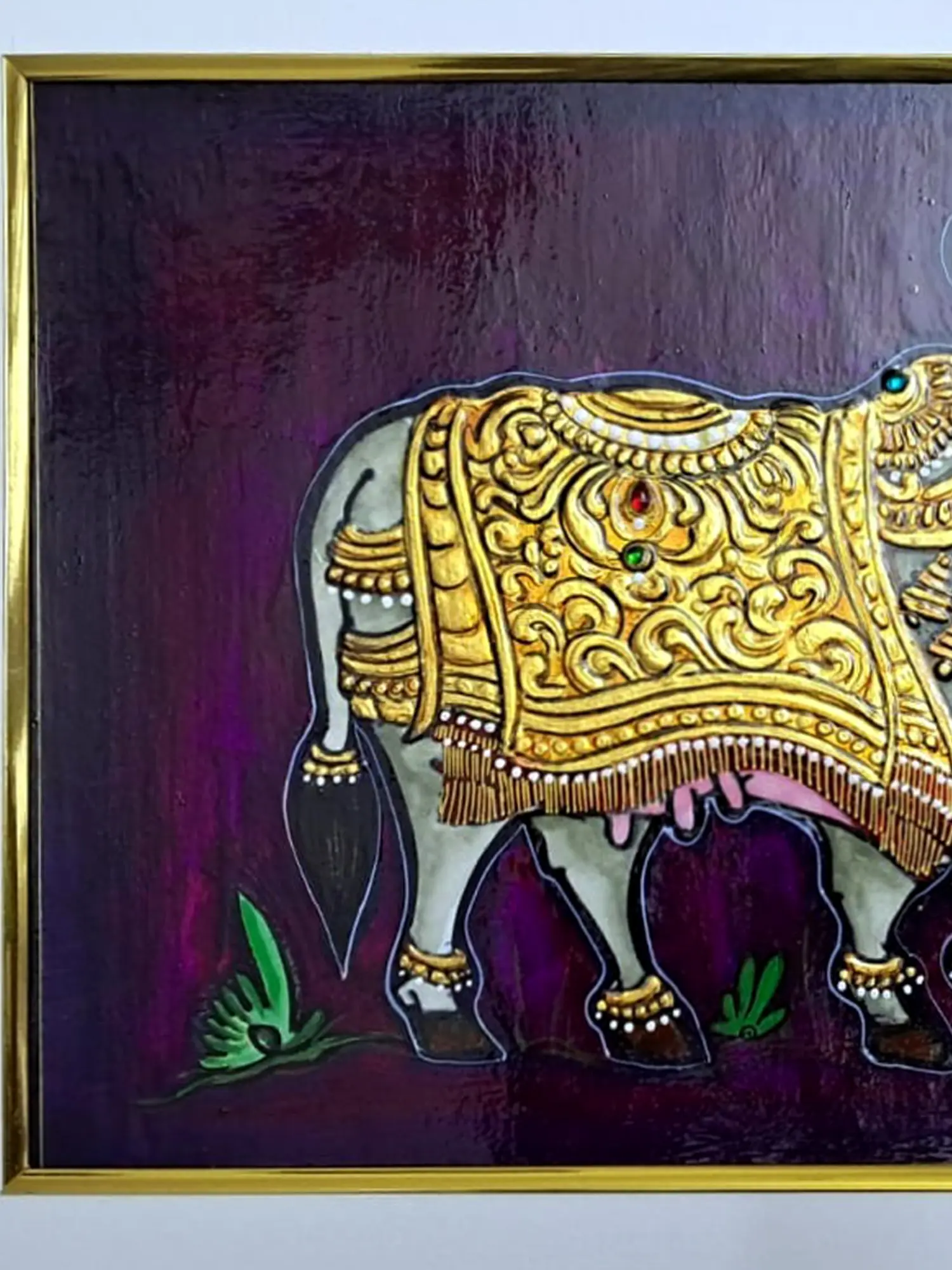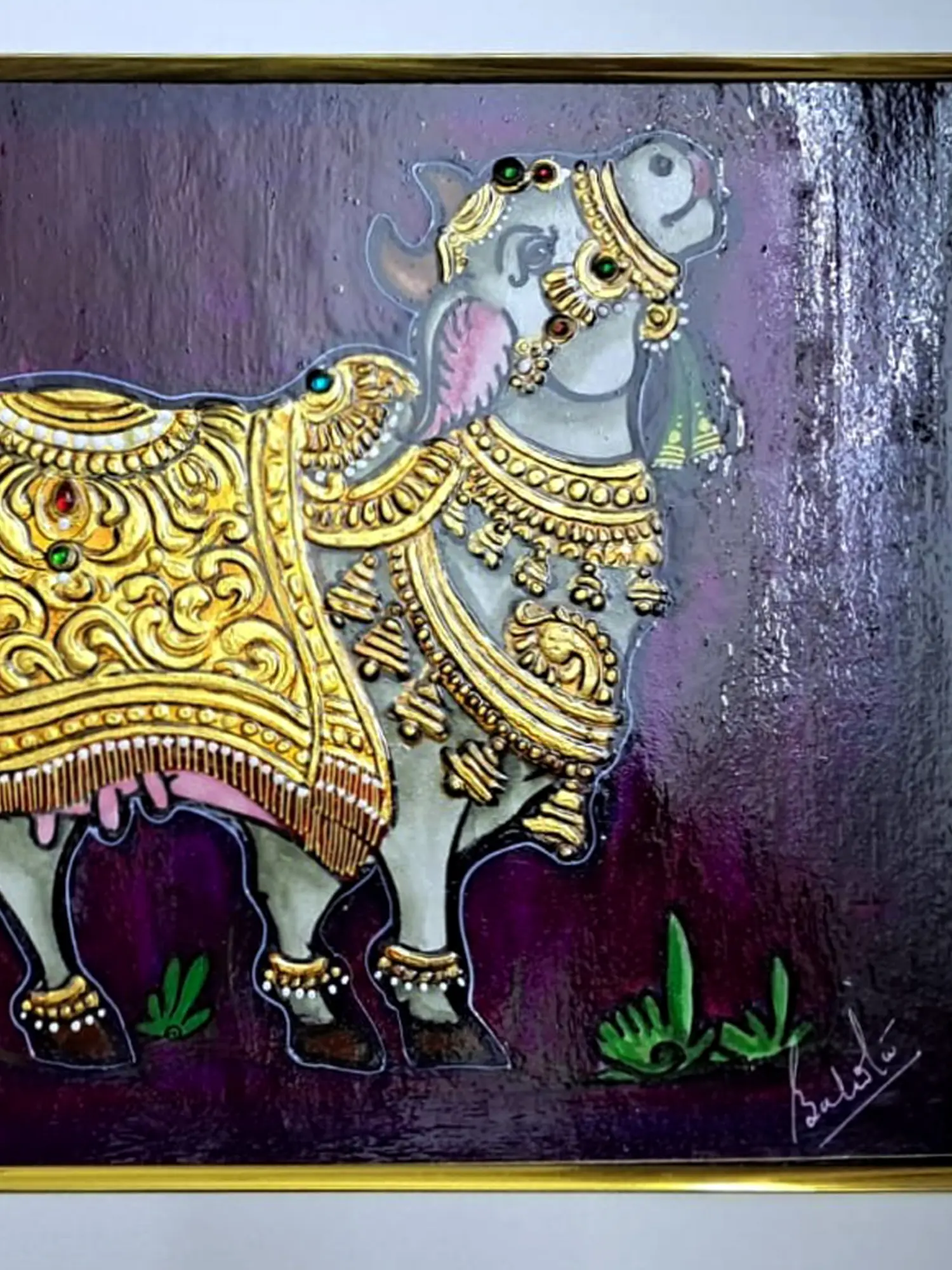 Babita's "Kamadhenu" Tanjore painting, executed on paper with natural colors, is a divine masterpiece. The artwork beautifully depicts the celestial cow, Kamadhenu, without a frame, allowing the imagery to command attention. The artist's adept use of natural colors lends a traditional and authentic touch to the piece. What makes this artwork truly enchanting is the application of golden color on the intricate ornaments adorning Kamadhenu.
