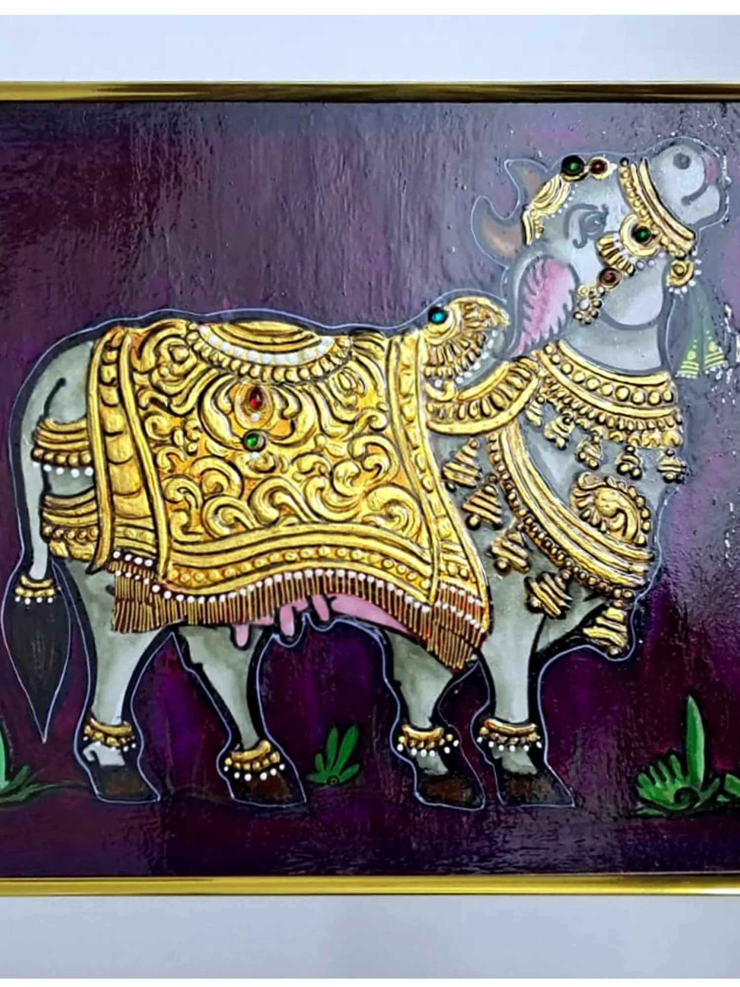 The use of gold not only imparts a regal opulence but also symbolizes divinity and prosperity. This Tanjore painting not only celebrates the sacredness of Kamadhenu but also showcases the artist's skill in bringing forth the richness of tradition through meticulous detailing and the judicious use of golden hues.