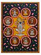 This exquisite Pichhwai painting, "Kamal Talai Shrinathji," is a breathtaking masterpiece crafted by the skilled hand of Dheeraj Munot. A testament to the rich artistic heritage of Rajasthan, it showcases the vibrant colors and intricate details characteristic of this traditional art form. The painting depicts Shrinathji, a form of Krishna, in his resplendent glory, surrounded by his divine companions. The central figure of Shrinathji is depicted standing gracefully on a pedestal, adorned with elaborate jewelry and clothing, embodying the divine charm and power of the deity. The surrounding figures showcase additional avatars and characters from Krishna's stories, adding to the overall narrative of devotion and divinity. The artwork meticulously uses natural colors on cloth, lending an unparalleled vibrancy and depth to the artwork, reflective of the artist's mastery over their craft. The overall composition exudes a sense of serenity and reverence, making it a perfect addition to any home or collection.