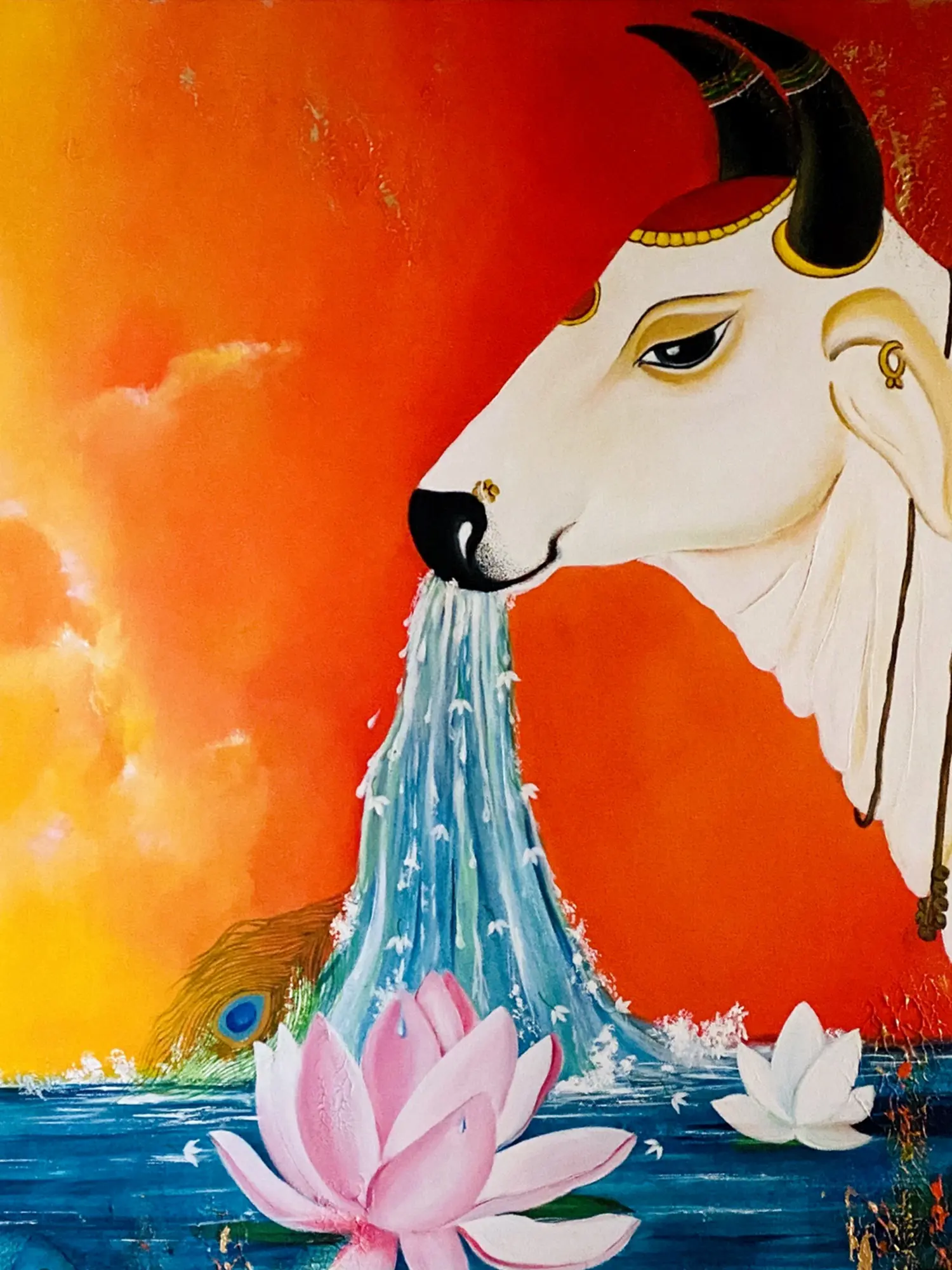 This depiction draws inspiration from the revered Kamadhenu, the celestial wish-fulfilling divine bovine-goddess in Hinduism. Kamadhenu is considered the mother of all cows and is a source of boundless prosperity, nourishment, and purity. Her image is deeply embedded in Indian culture, representing abundance, fertility, and the nurturing essence of life itself.