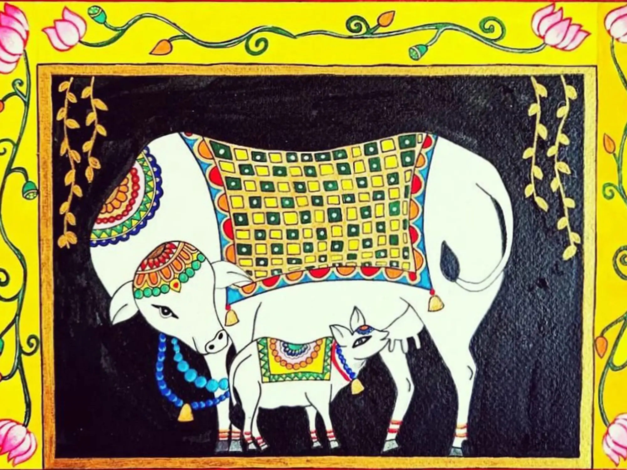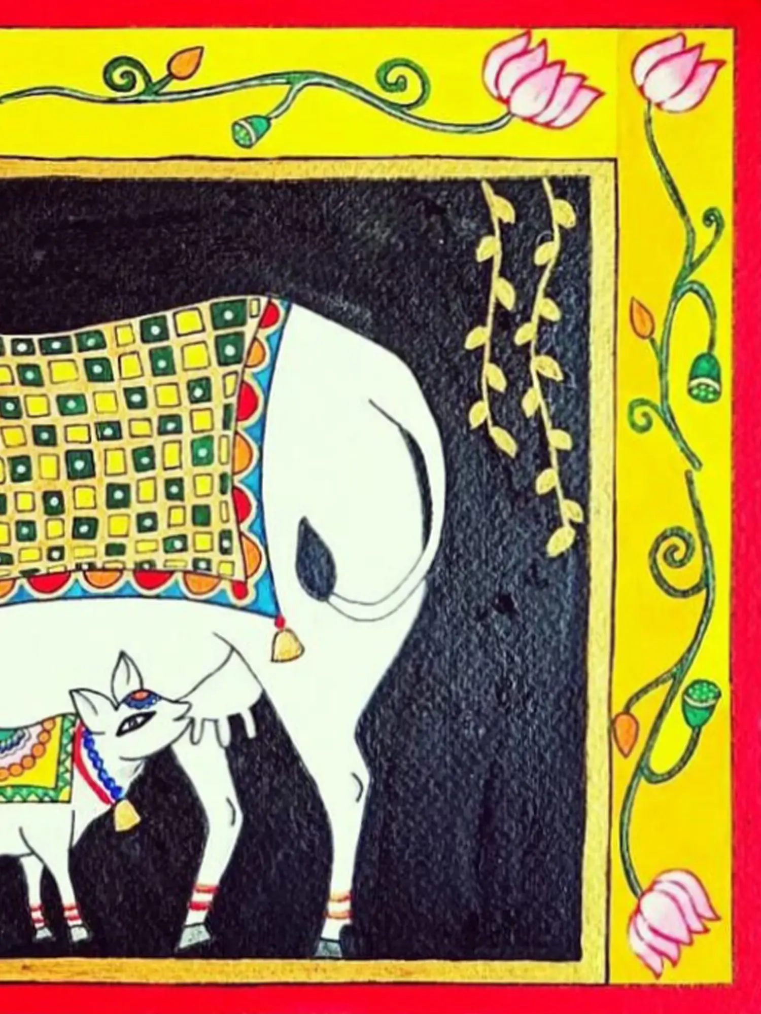 In Anshu Tripathi's, Paper Painting titled Kamdhenu - Bond of Mother, the warmth of the bond between mother and child unfolds. The artist skillfully captures the essence of Kamdhenu, the divine cow, symbolizing abundance and maternal nourishment. The intricate details bring Kamdhenu to life, radiating a sense of benevolence and sacredness. Against a backdrop of culturally rich patterns, the bond between mother and calf is beautifully depicted, evoking a profound sense of nurturing love.