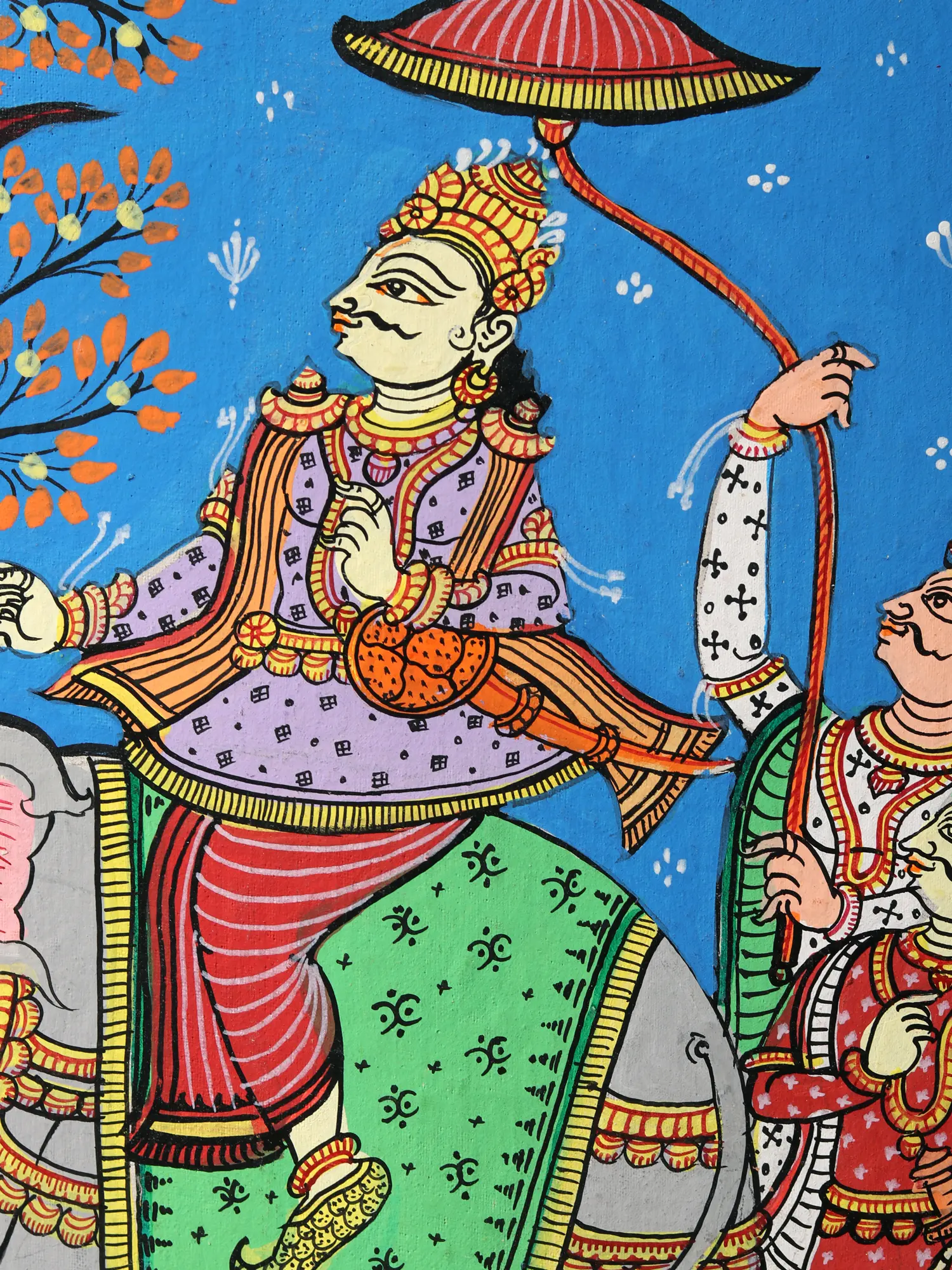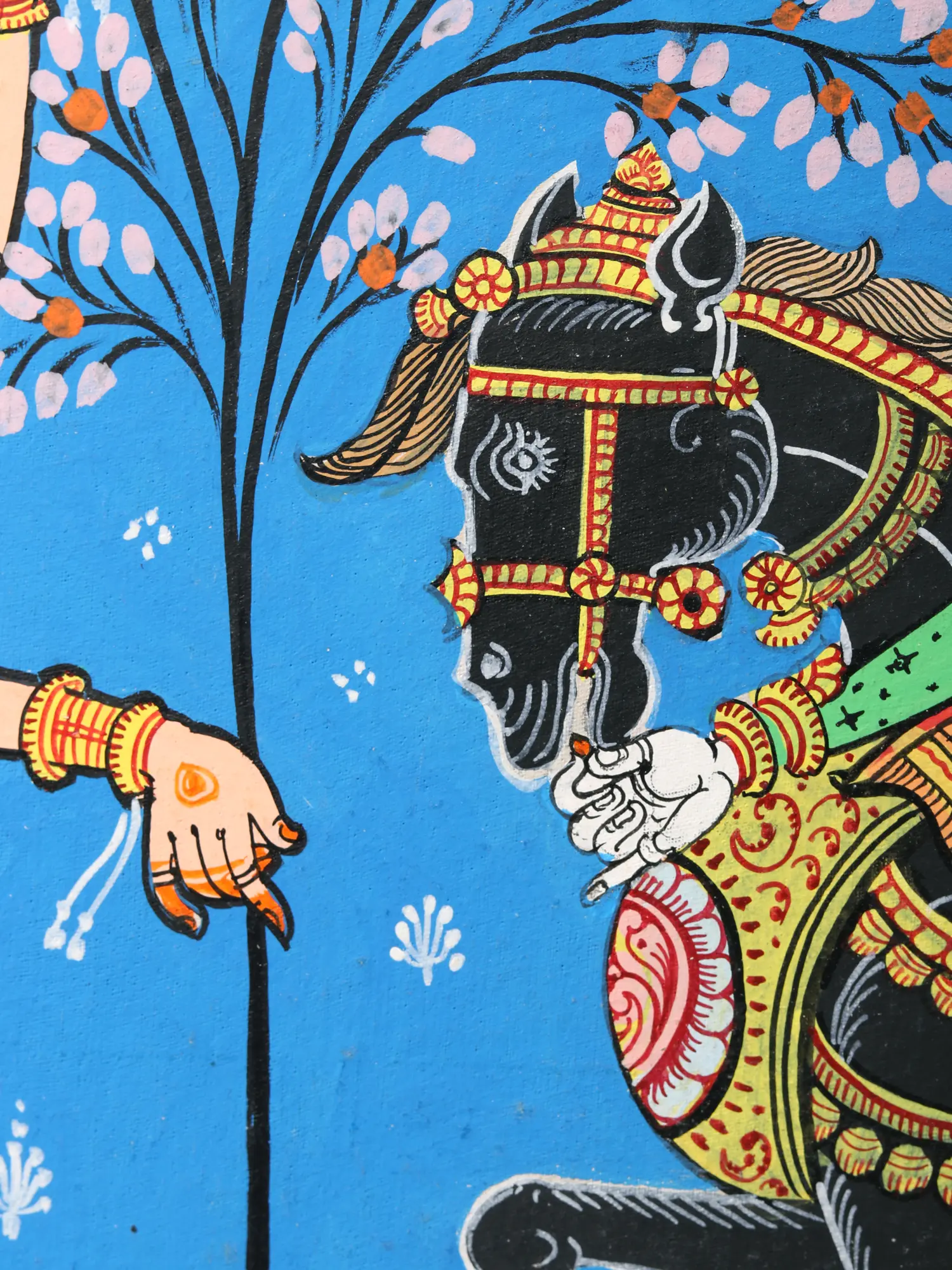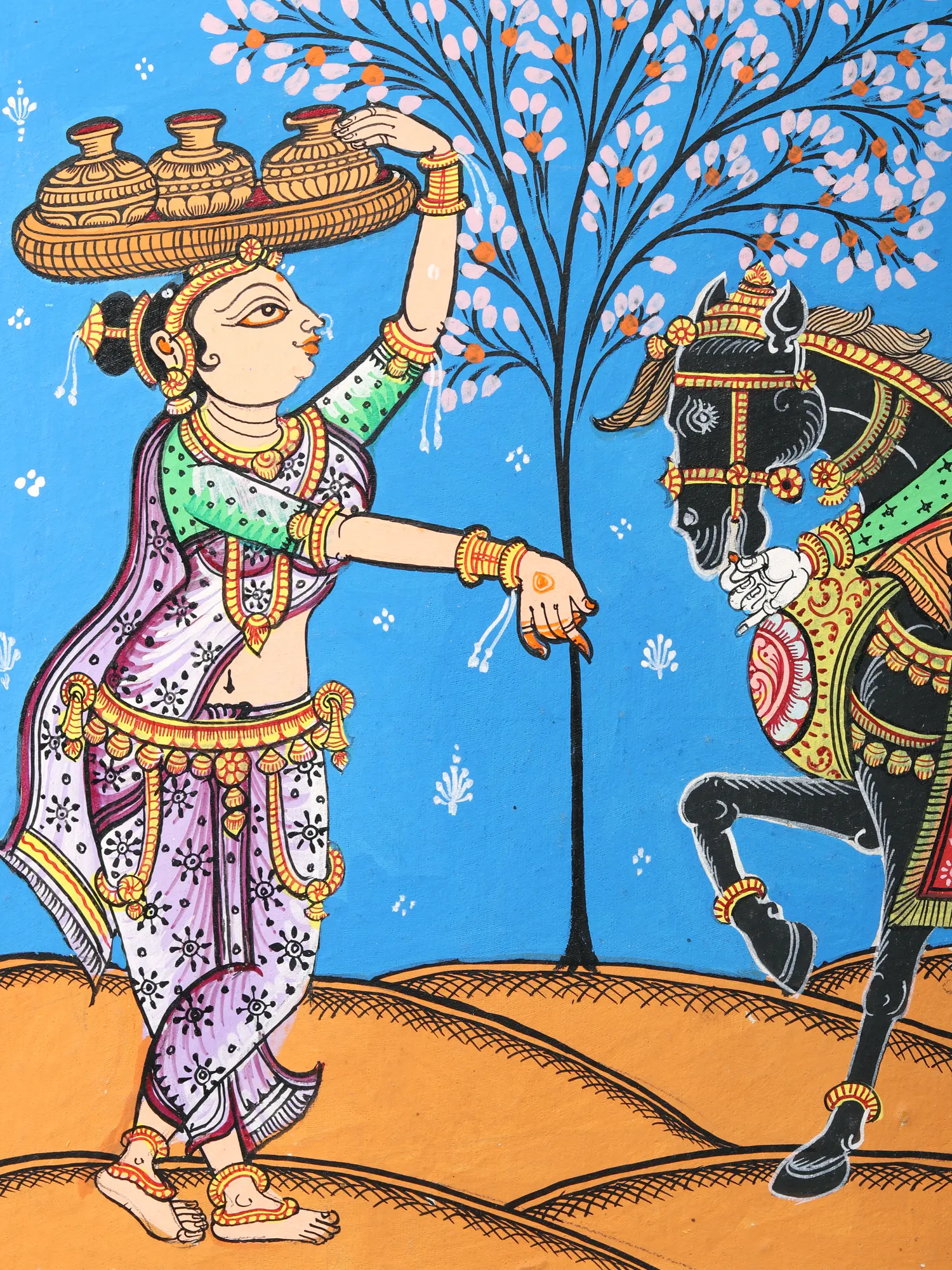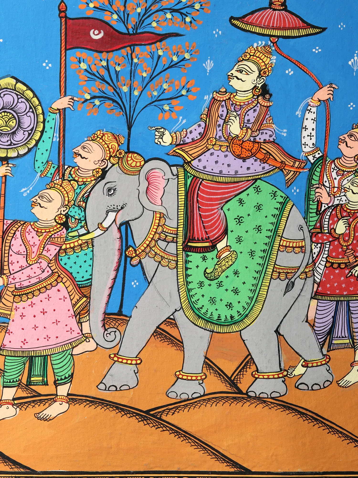 Observe the dynamic composition unfolding across a generous 18 inches in height and 40 inches in width, a scale that allows for intricate detail and storytelling. The luminous blue sky serves as a breathtaking backdrop for the procession, highlighting the vibrant hues of the figures and their regal attire. You'll appreciate the delicate rendering of the horses, the majestic elephant, and the tender portrayal of the milkmaid, Manika, offering her bounty, each element rendered with exquisite precision. The detailed ornamentation and symbolic motifs woven throughout the scene further enhance its visual appeal and narrative depth.