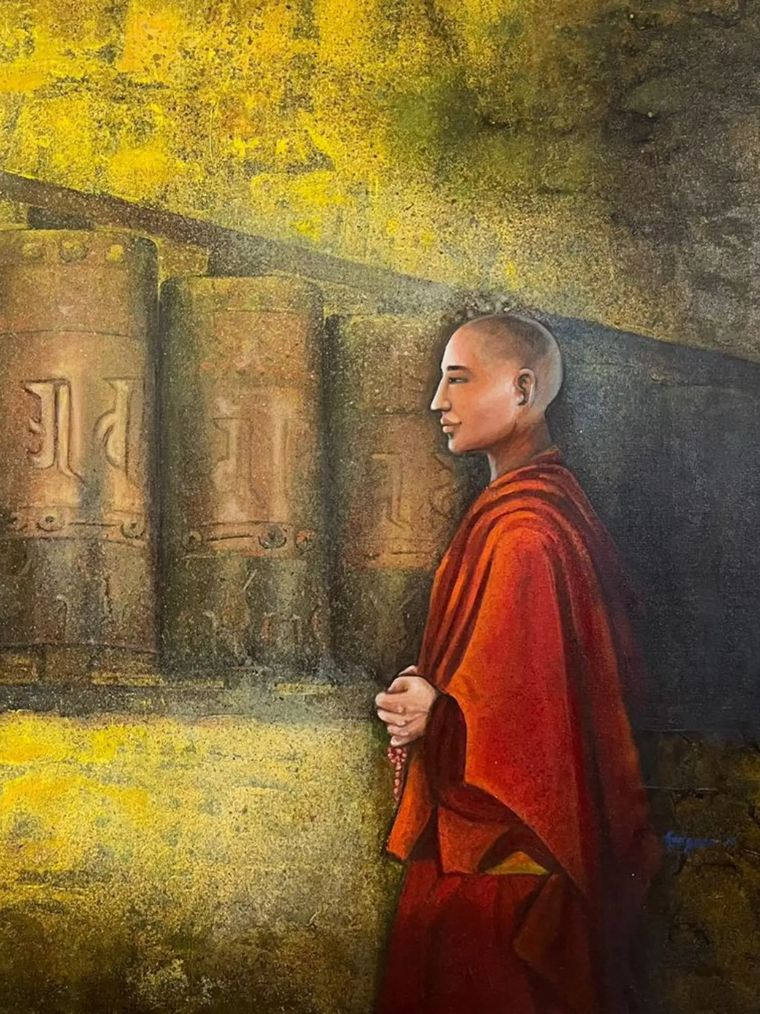 The richness of the acrylic medium is expertly employed, offering a luminous quality that enhances the spiritual aura of the subject. Vibrant hues of saffron and deep earth tones create a striking contrast, drawing your eye to the contemplative figure. The intricate details, from the prayer beads to the inscribed prayer wheels, speak to an artisan's dedication to authenticity and visual storytelling, all presented on a generous 36-inch by 42-inch canvas.