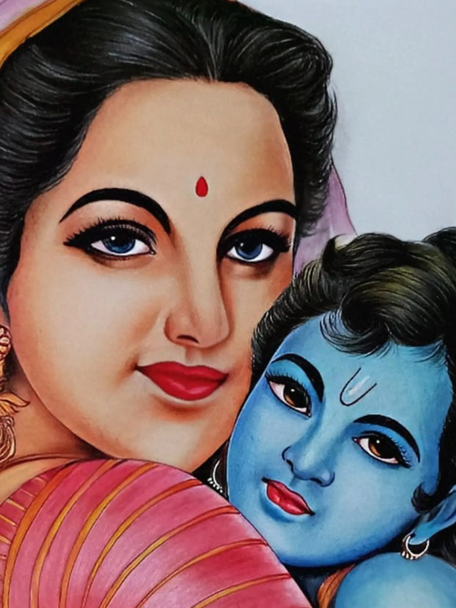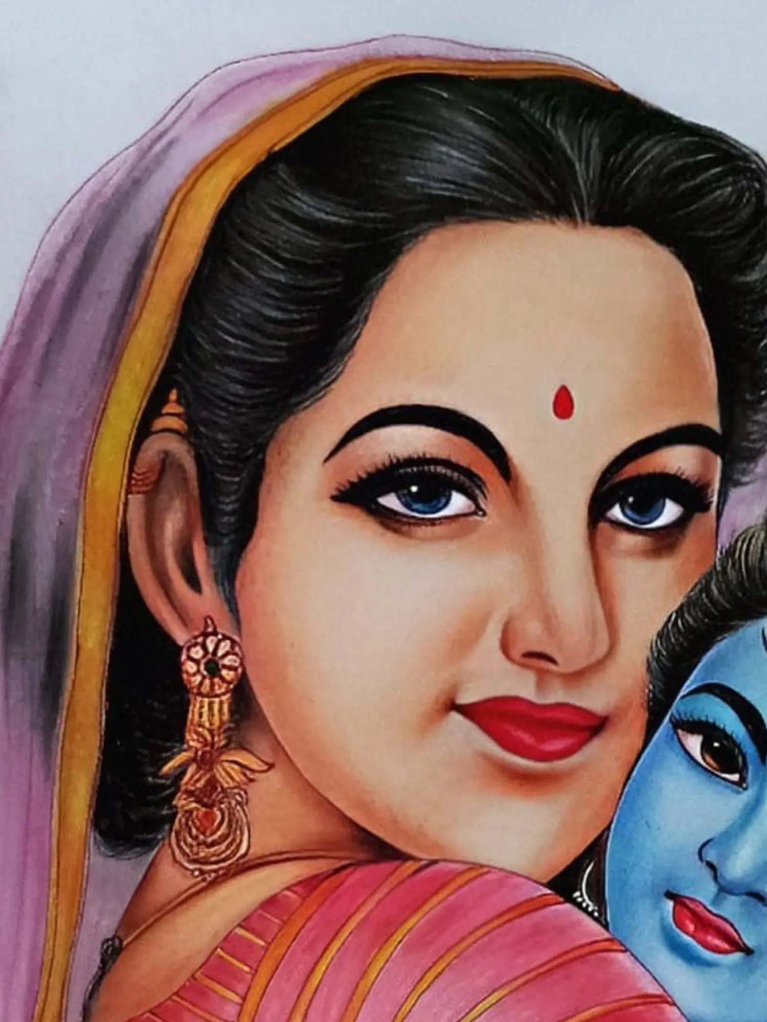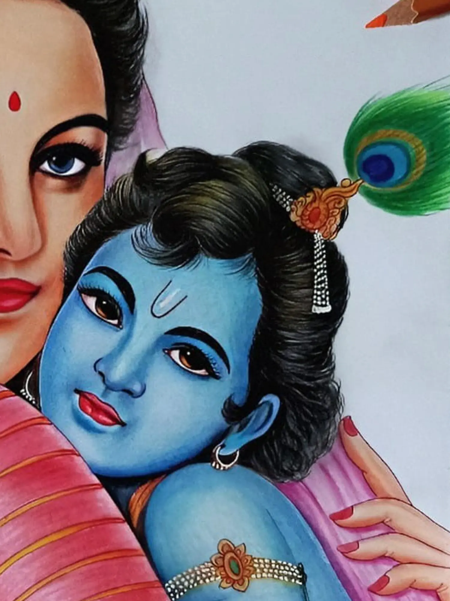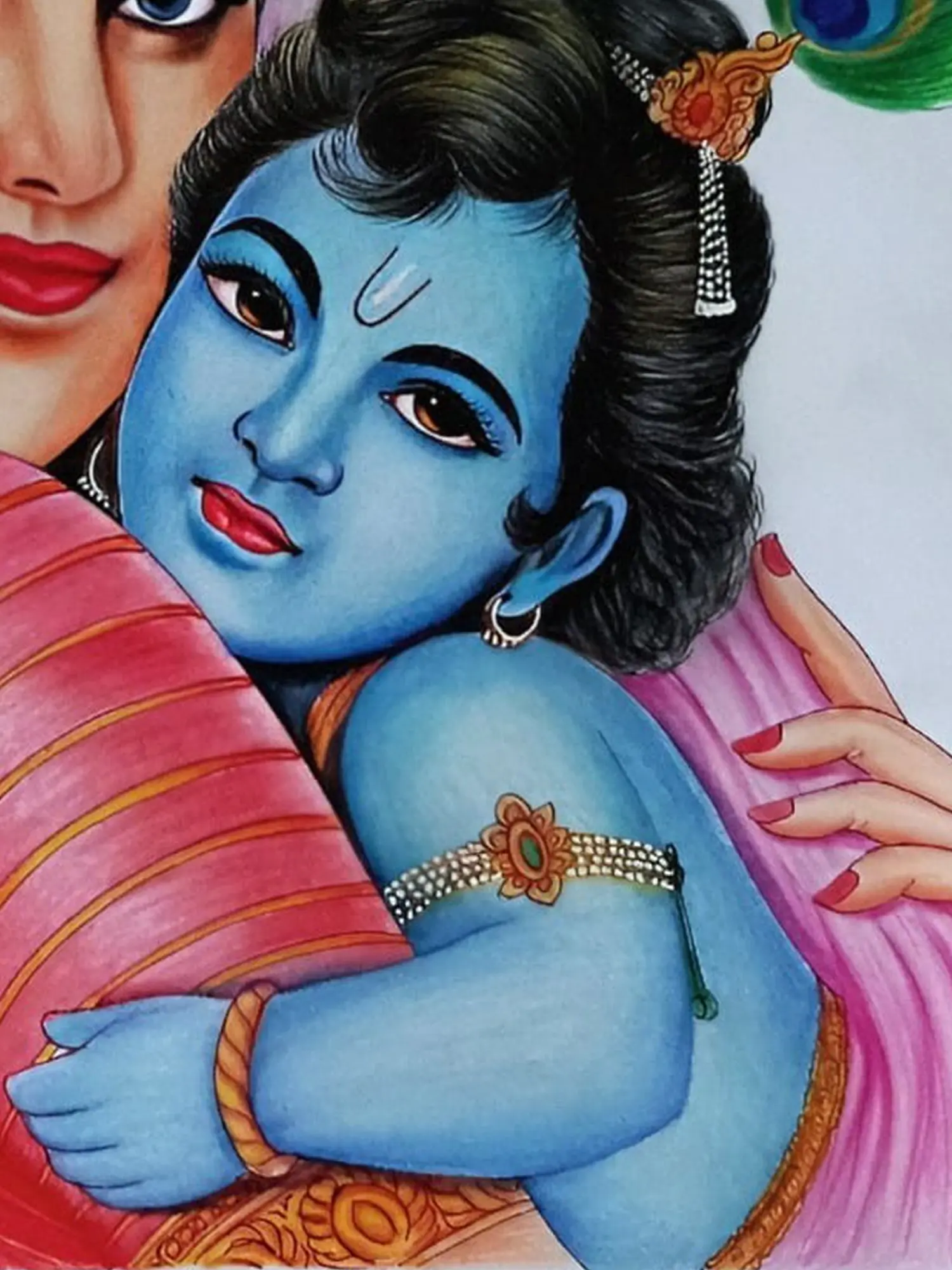 This masterwork by artist Sunil Kumar, portrays the ethereal bond between Yashoda Maiya and Lord Krishna. With delicate strokes of colour pencil, Kumar brings life into this scene, portraying the tender embrace of a mother’s affection for her divine child.