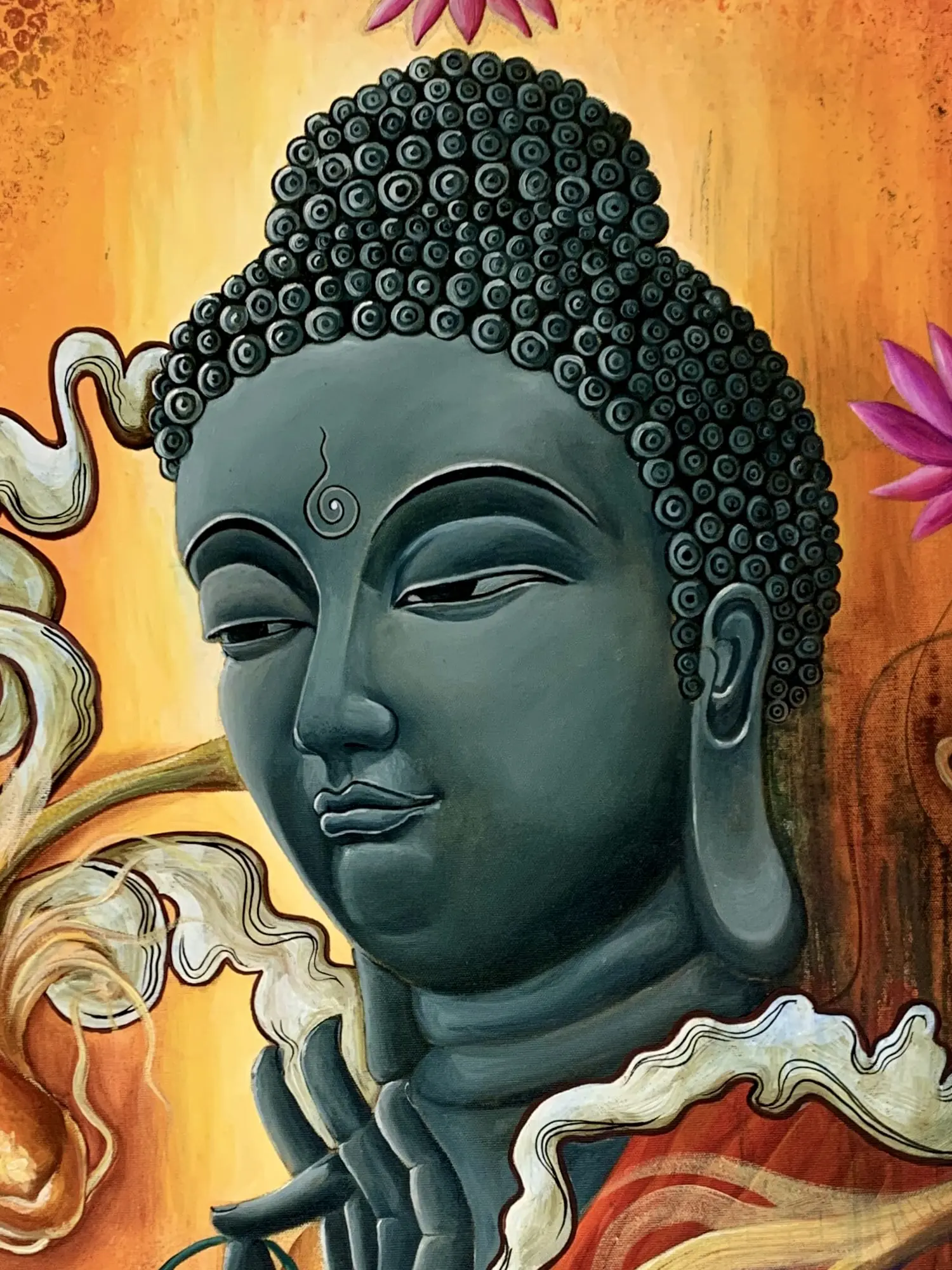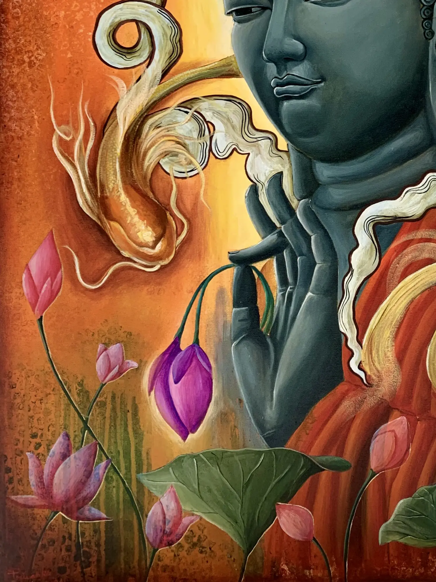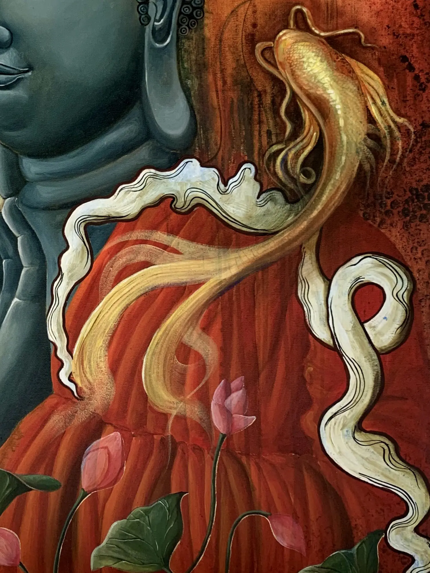 "Karana Mudra Buddha," an exquisite creation by Priyanka in oil and acrylic on canvas, weaves spiritual symbolism with abundance. The canvas features the Buddha in the Karana mudra, a gesture representing warding off negativity. Surrounding the serene figure are delicate lotus blooms, symbolizing purity and enlightenment. Integrating Chinese traditions, Priyanka introduces goldfish, renowned symbols of abundance and prosperity.