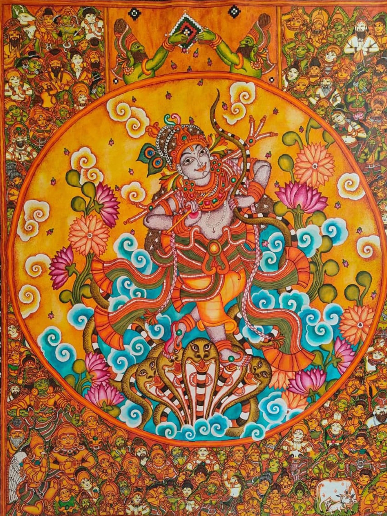 Rendered in the distinctive style of Kerala mural painting, this masterpiece showcases the intricate detailing, bold lines, and rich color palette that have been passed down through generations. The artists meticulously recreate the essence of this iconic event, imbuing each element with spiritual significance. Lord Krishna is portrayed with serene yet dynamic posture, his divine energy radiating outwards, while the multi-headed serpent Kaliya writhes beneath his feet, a testament to the triumph of good over evil. The vibrant oranges, blues, and greens create a visually stunning spectacle, drawing the viewer into the heart of the divine drama.