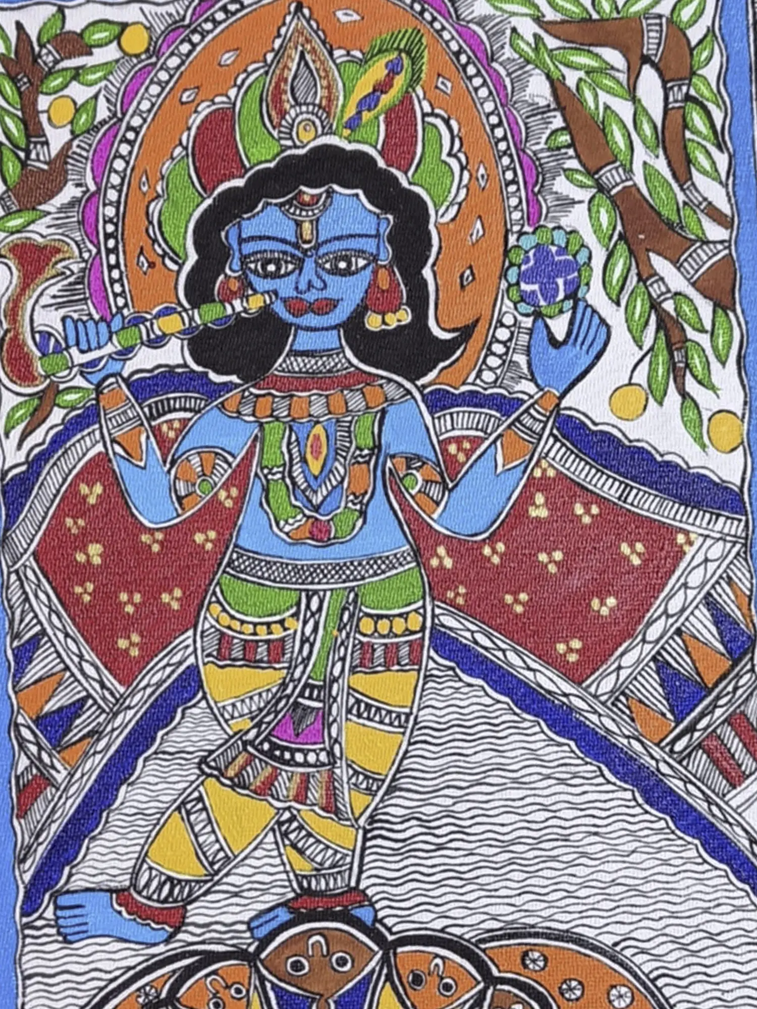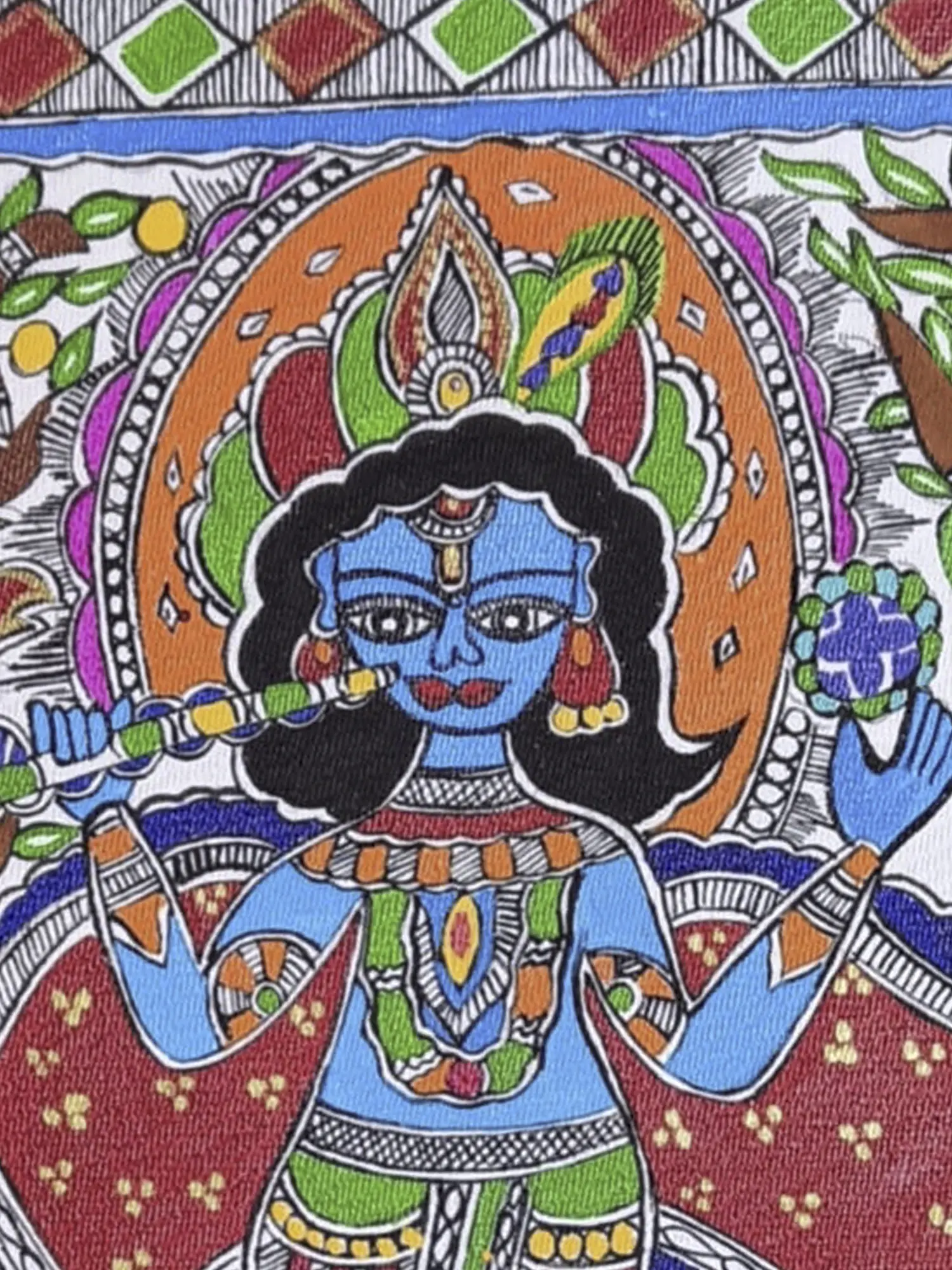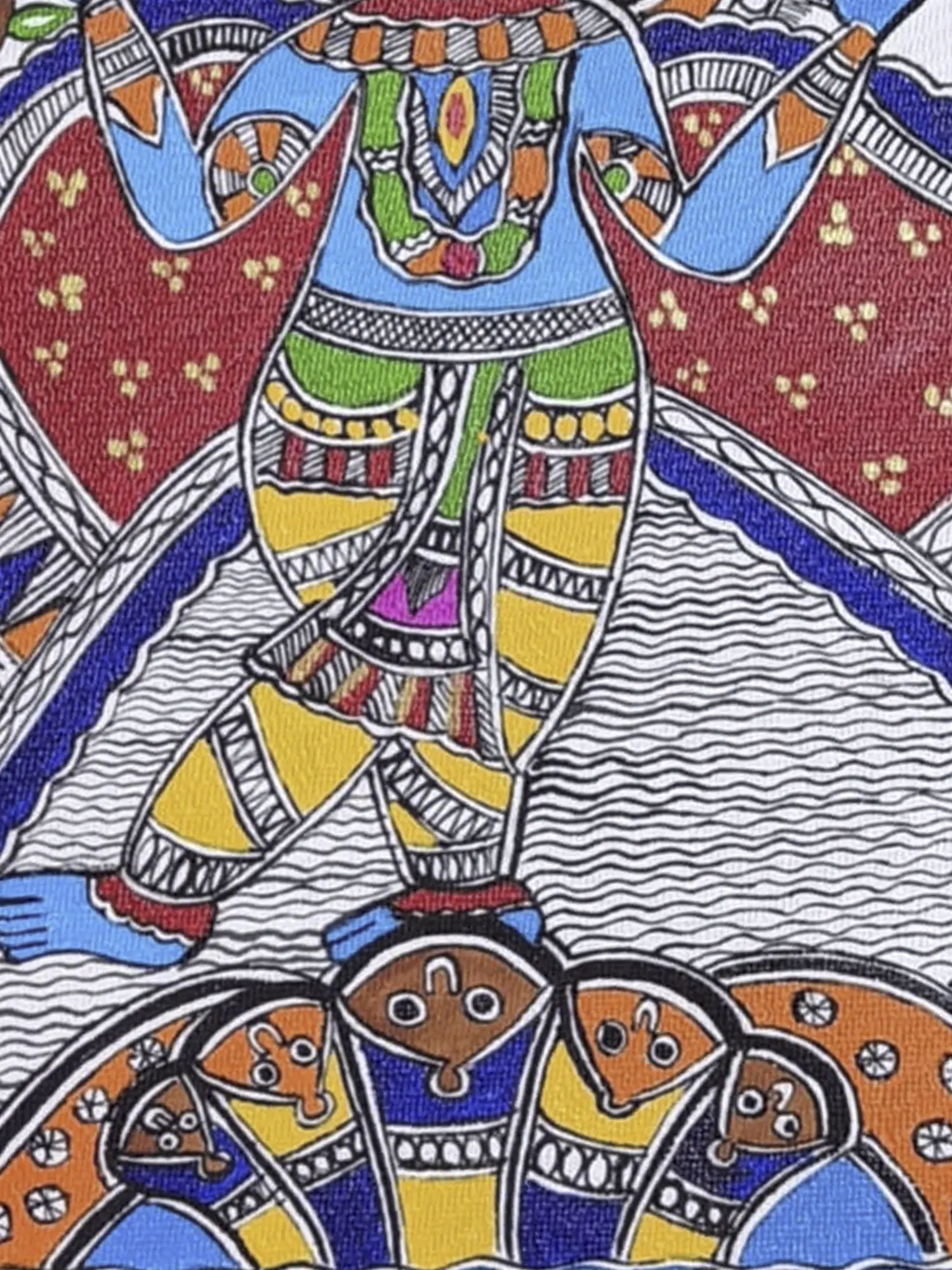 Madhubani art is a beautiful style of painting from Bihar that is also identified as Mithila Art. It generally contains sacred motifs like figures of Gods and Goddesses. This Krishna Dance on Kaliya Serpent is an Acrylic on Handmade paper made in Mithila or Madhubani style. The artist is Muskan, known for her simple yet effective strokes that create mesmerizing art. The artwork breathes life into the legendary tale of Lord Krishna subduing the venomous serpent, Kaliya. With dynamic strokes, Muskan captures the cosmic dance, showcasing Krishna's divine grace and triumph over evil.