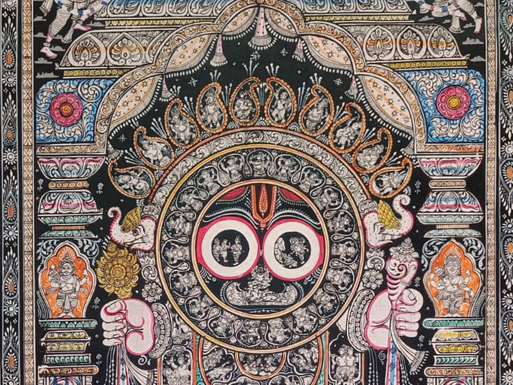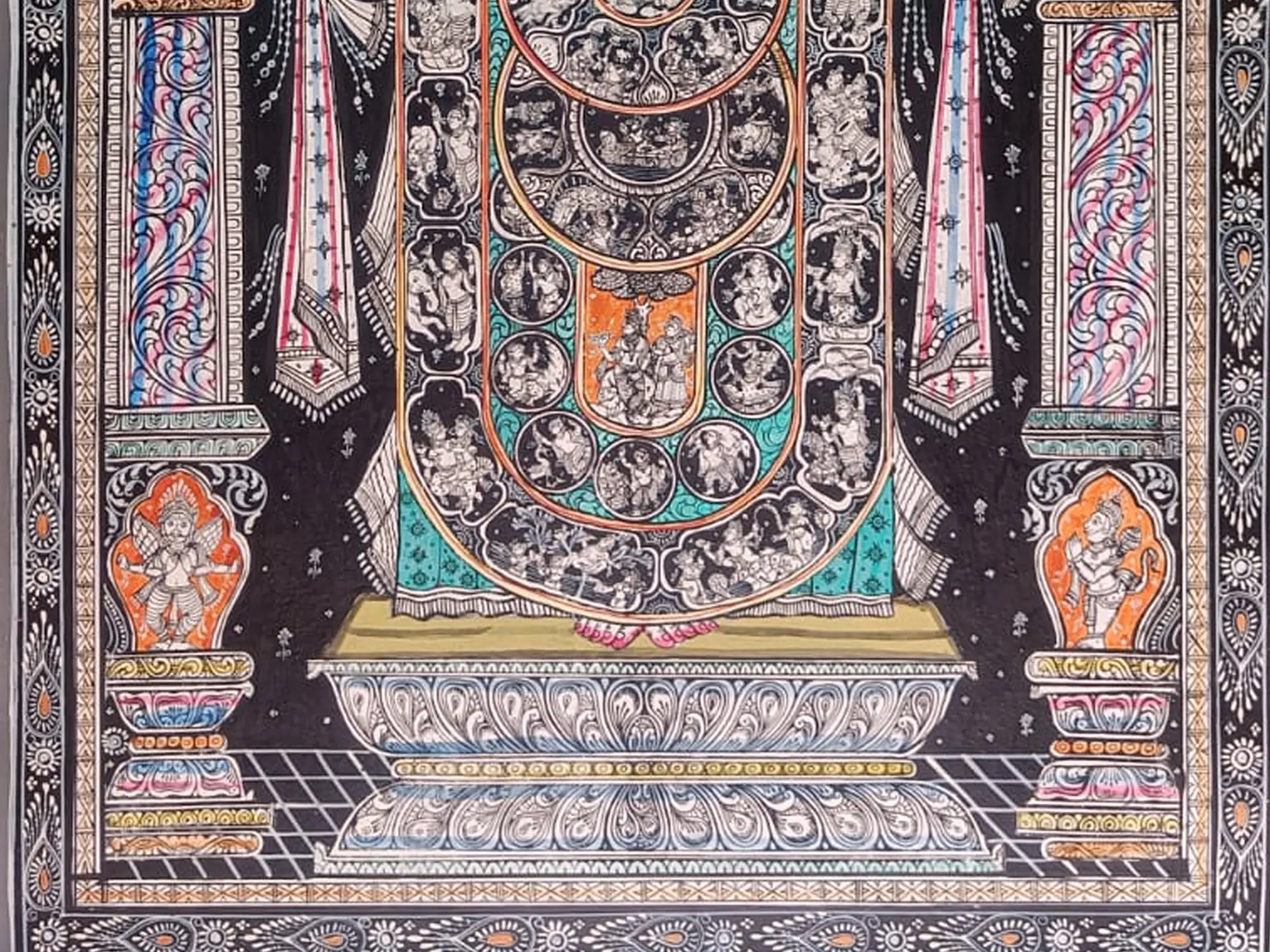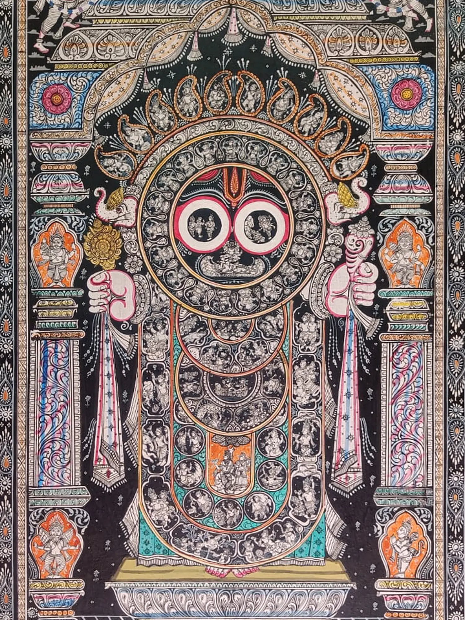 The expansive 36-inch height by 24-inch width offers a magnificent canvas for an astonishing display of artistry. The central motif, a depiction of Jagannath with the divine stories of Krishna contained within, is rendered with remarkable intricacy. Surrounding architectural elements and celestial beings are meticulously detailed, each figure and pattern contributing to the overall narrative tapestry. The interplay of deep blacks with vibrant, earth-toned natural colors creates a captivating visual experience that draws the eye deeper into its sacred world.