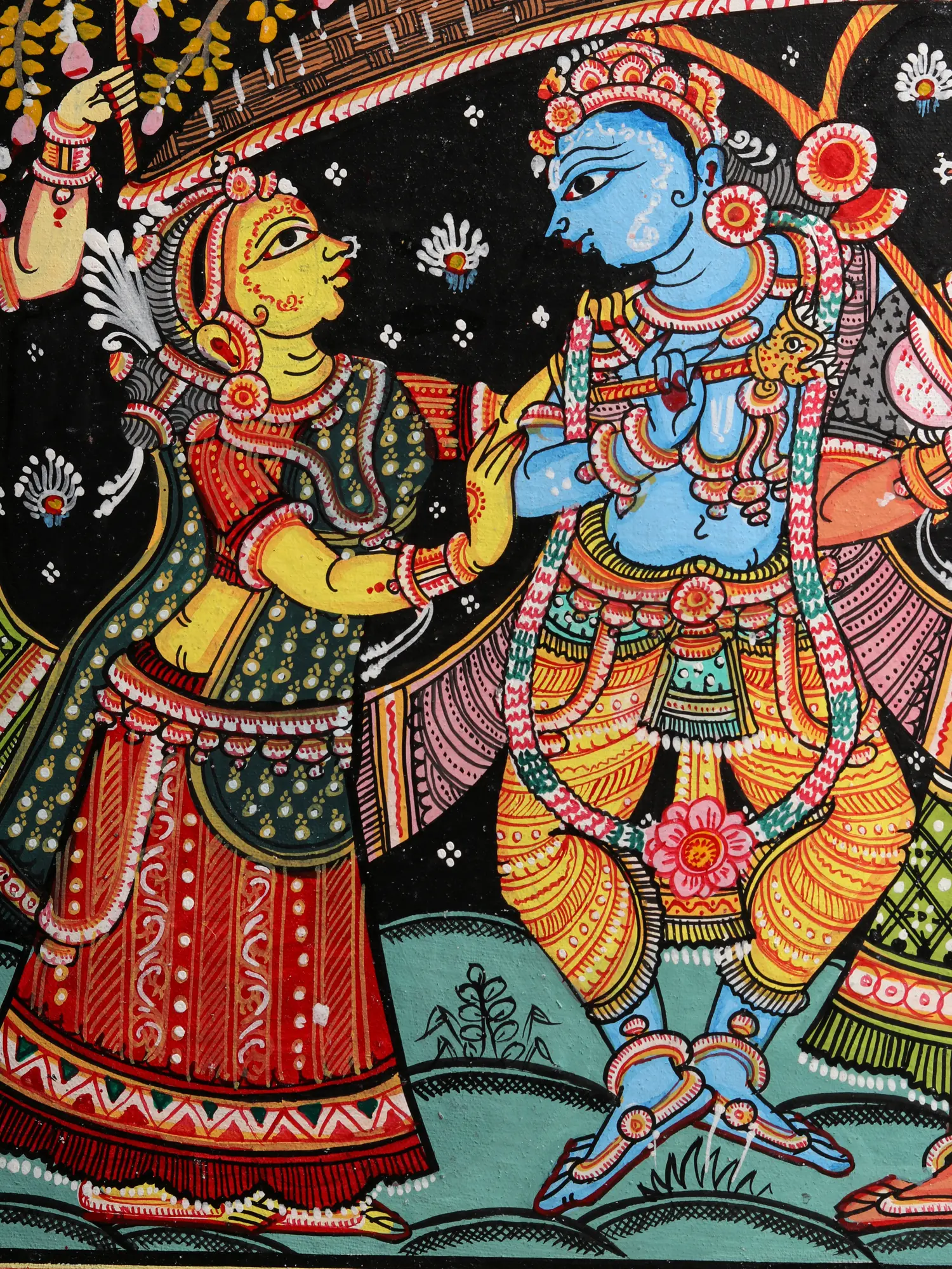 Each nuance of this piece reflects the dedication of skilled artisans who honor generations of Pattachitra tradition. Crafted on a specially prepared, handmade canvas, the foundation itself speaks of a commitment to authenticity. The fluid application of watercolor paints brings the figures and their surroundings to life, showcasing the depth of color and fine linework characteristic of this ancient art form. You'll appreciate the rich textures and the subtle gradations achieved, a testament to masterful technique.