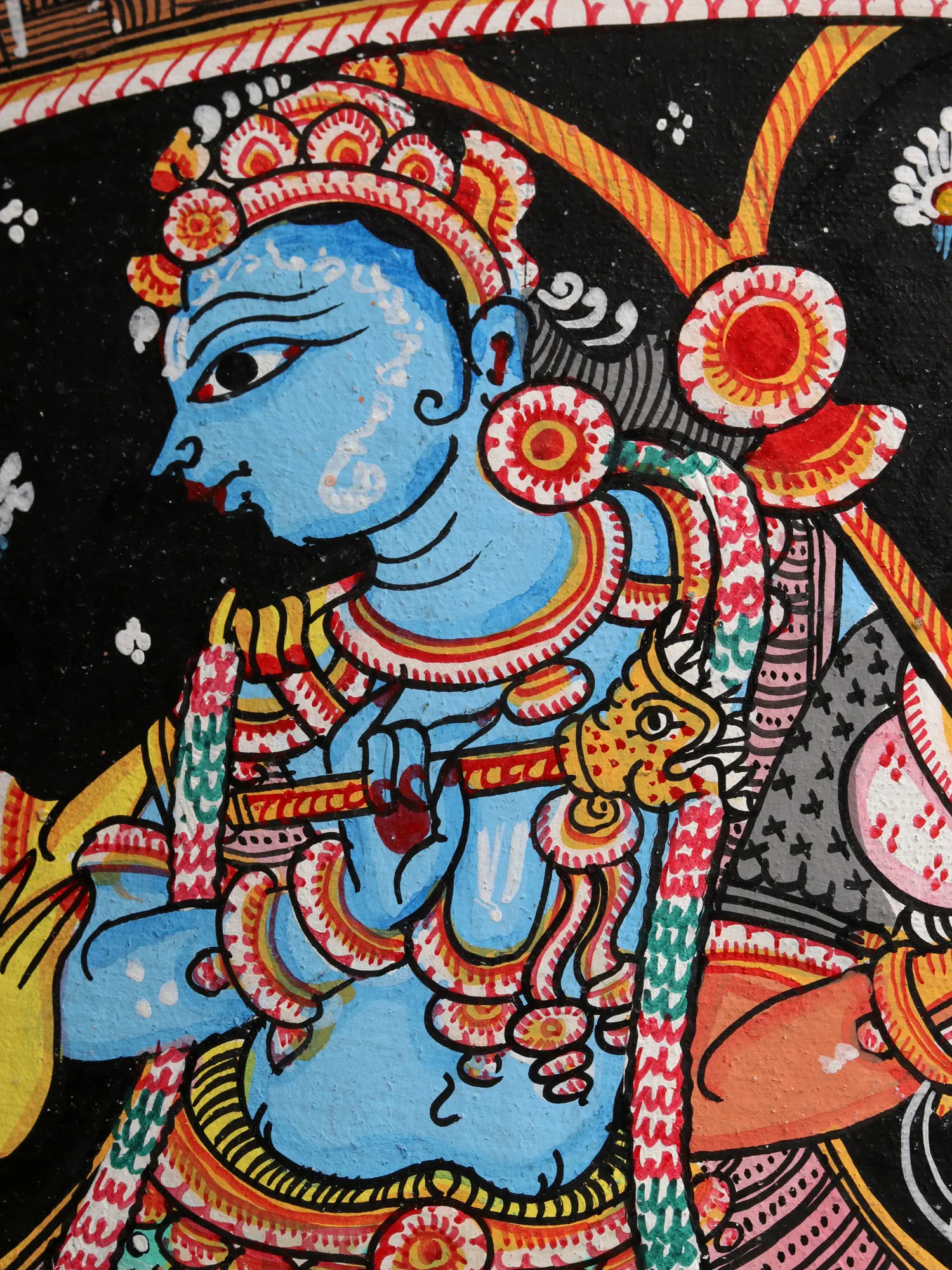 Immerse yourself in the vibrant tapestry of Indian folklore, where divine love and joyous celebration unfold. This exquisite artwork invites you to witness a scene steeped in spiritual lore, a moment captured with breathtaking artistry and meticulous detail. You'll find yourself drawn into the enchanting narrative depicted with every stroke.