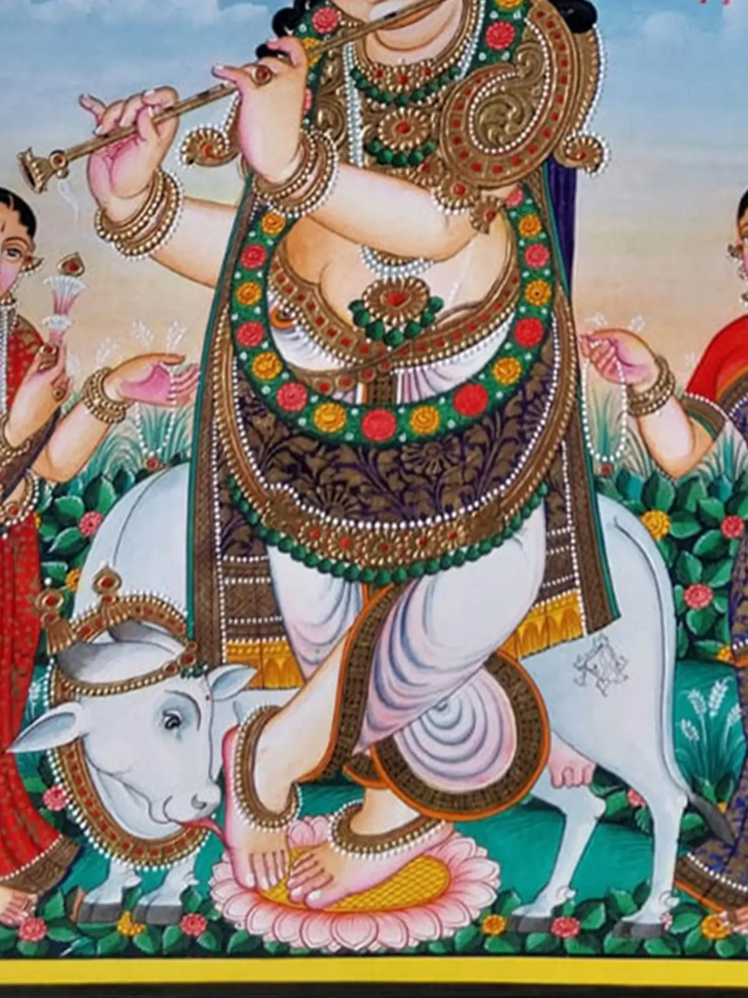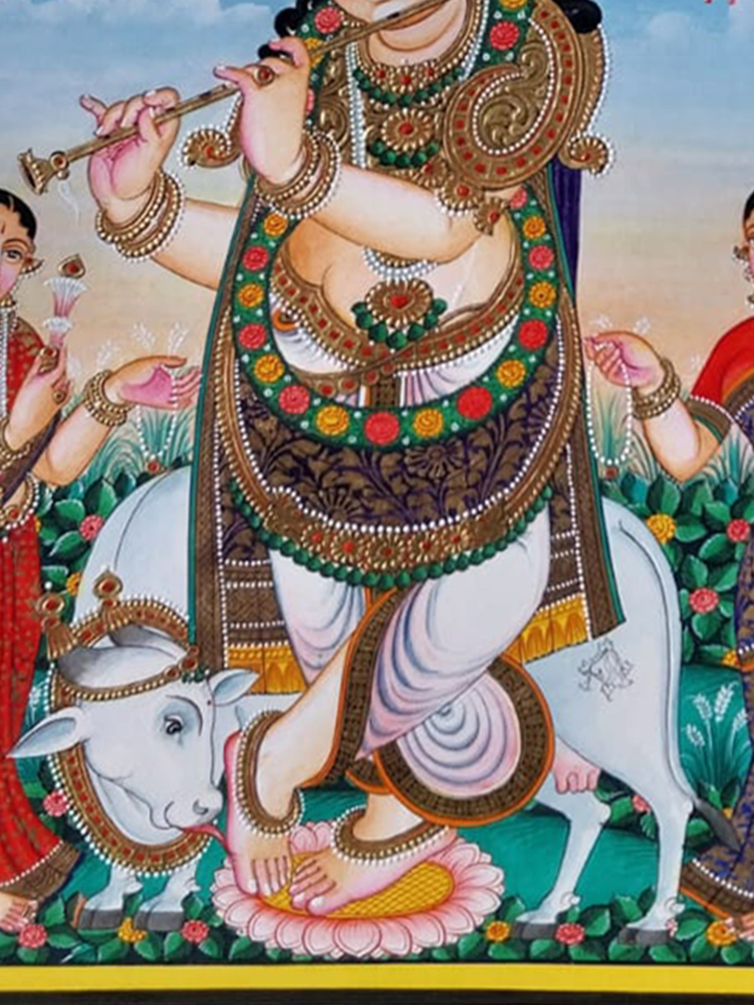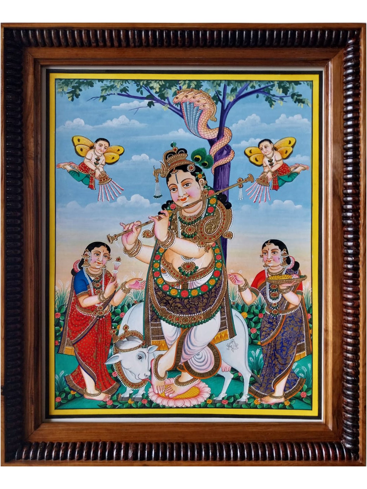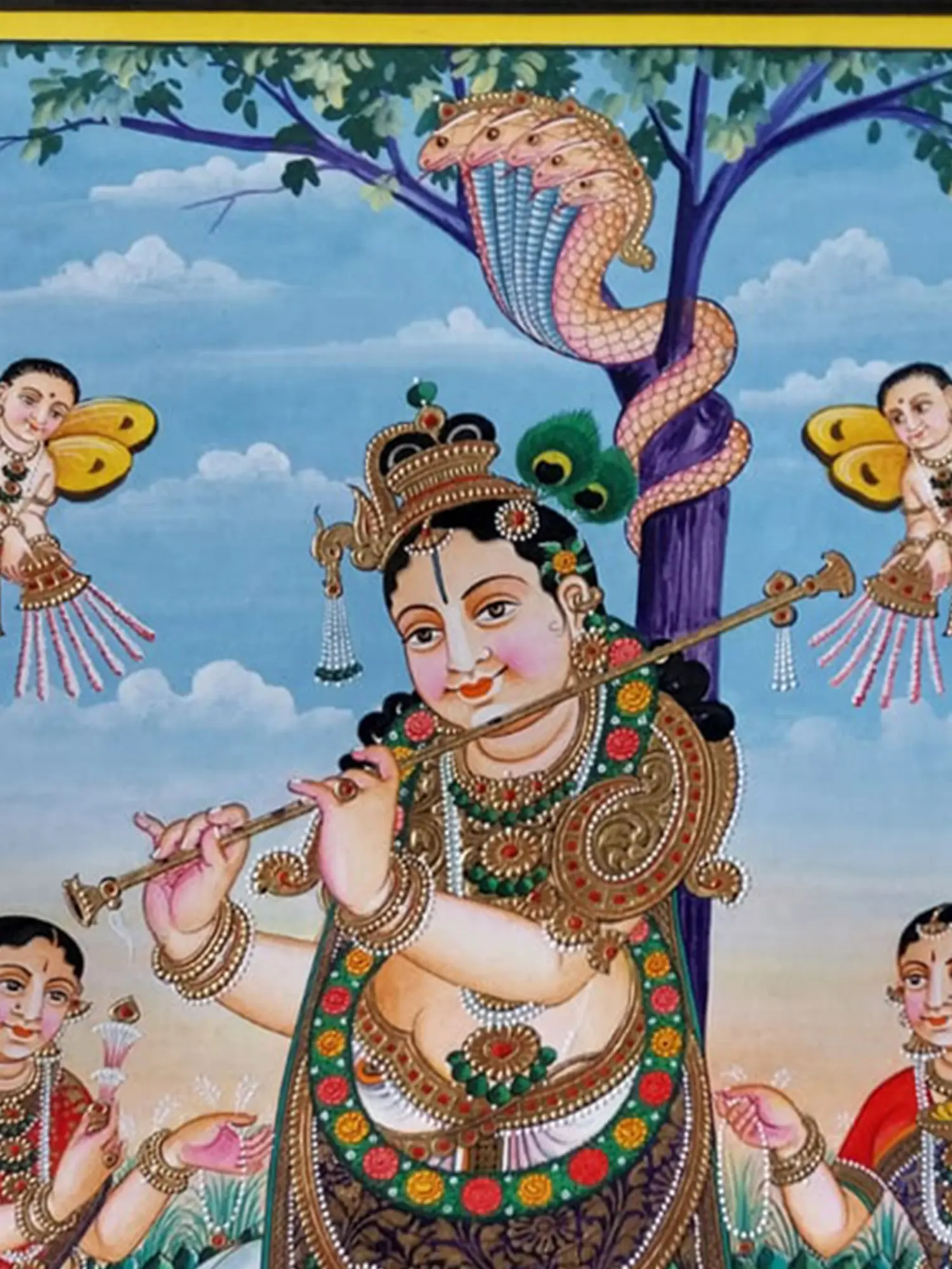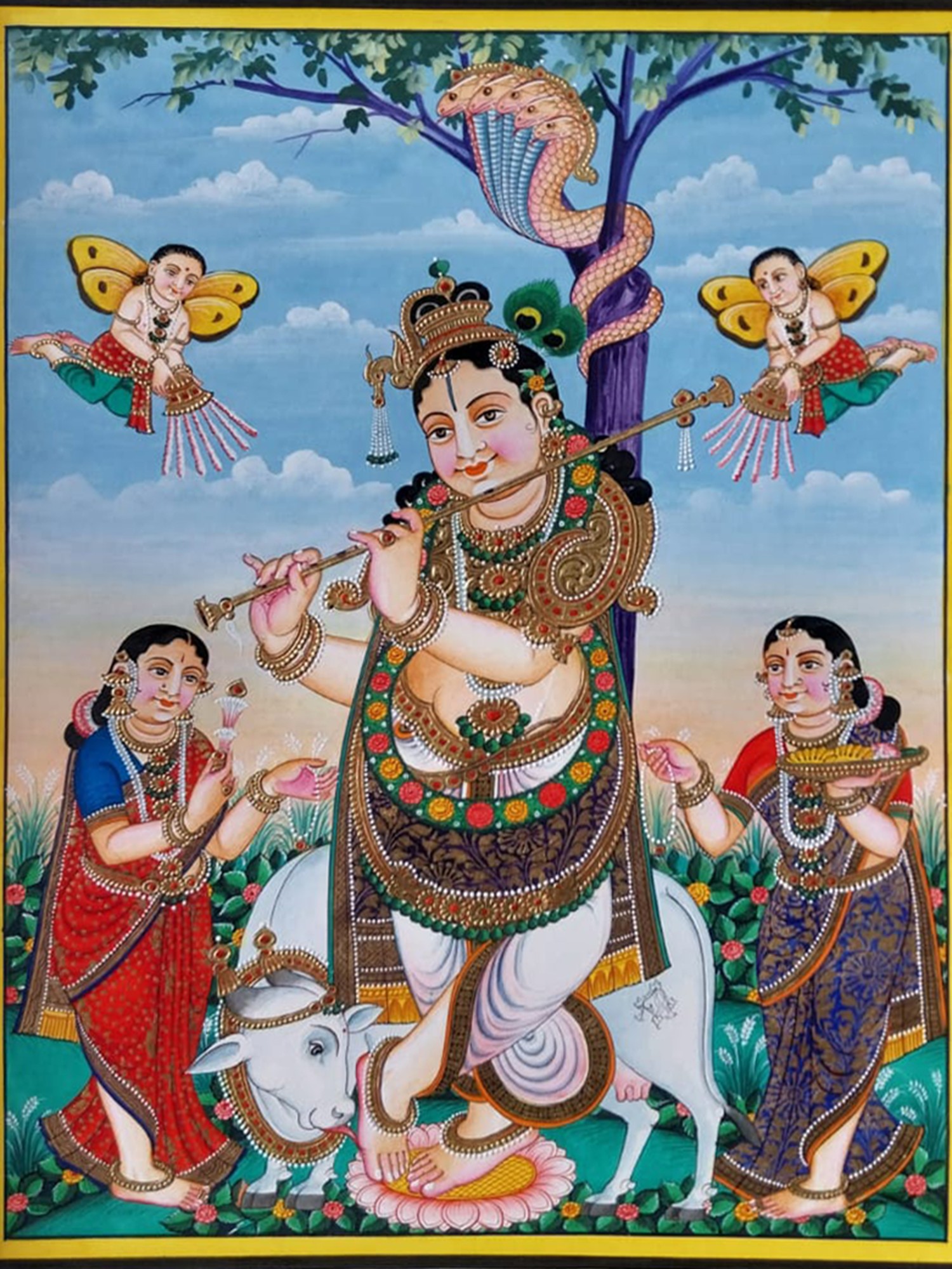 Chaturbhuja Krishna With Gopi | Mysore Painting With Frame | Watercolor And 22 Carat Gold Leaf