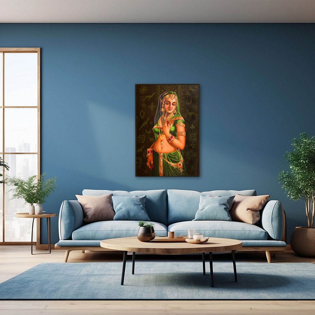This oil painting underlines the romanticism of the veil, through an exquisite female dressed in green, the color of blossoming youth. Ornamented majestically, the lady feigns shyness by pulling the veil over her face, which manages to shine through it, just as the moon shines through the clouds.
