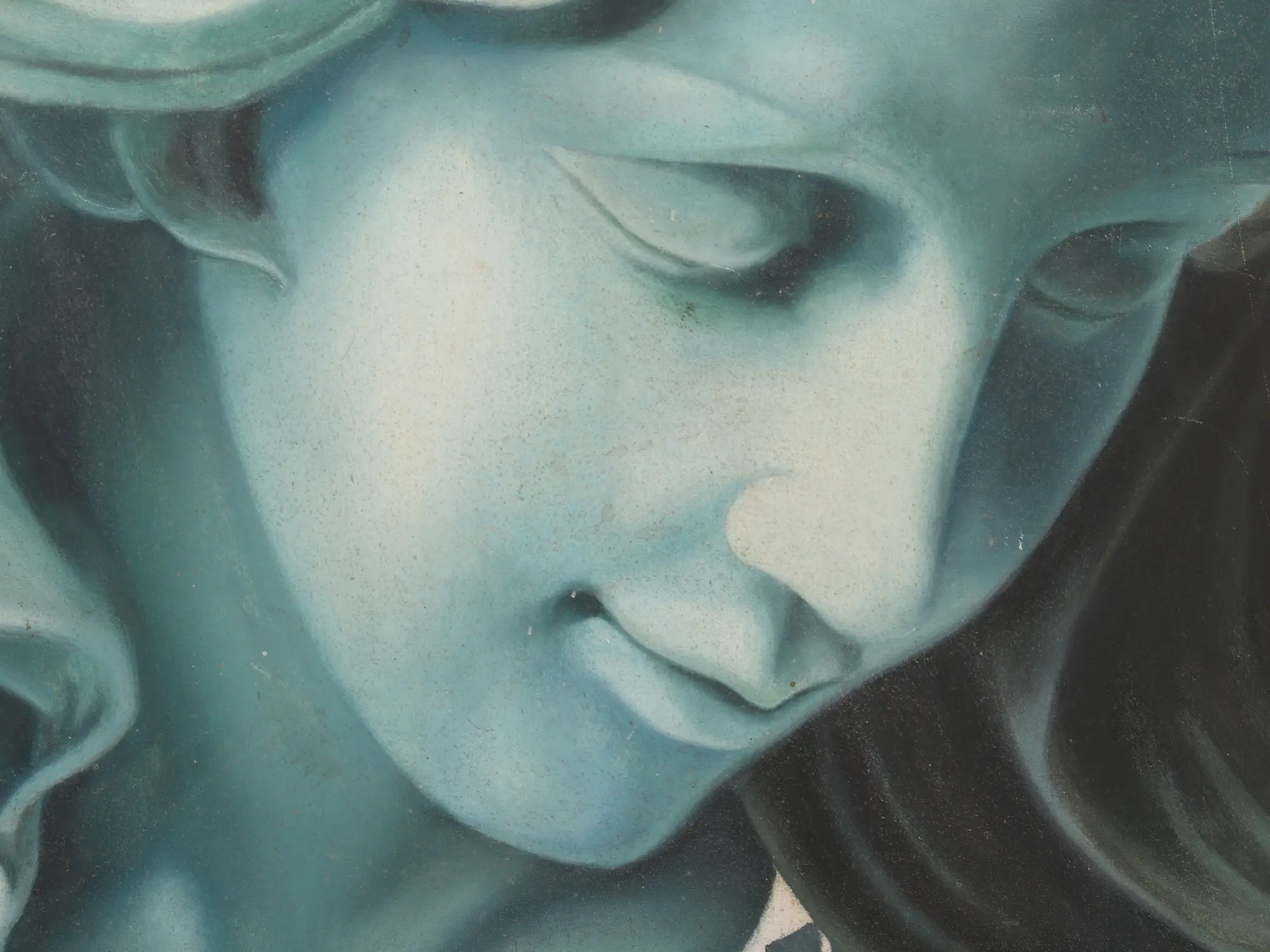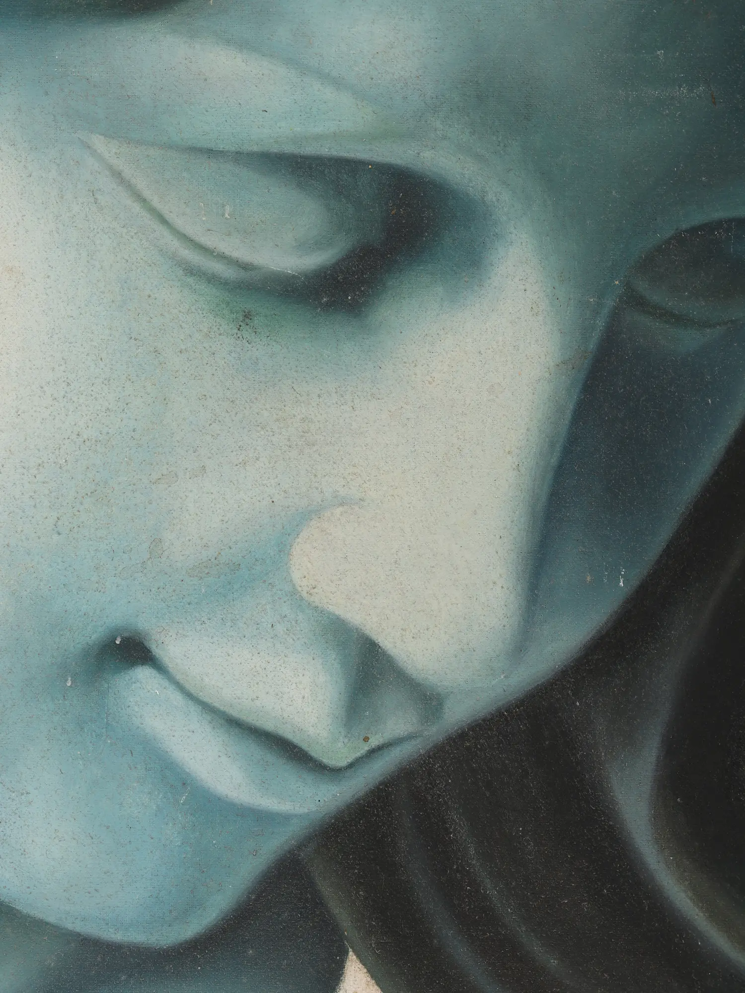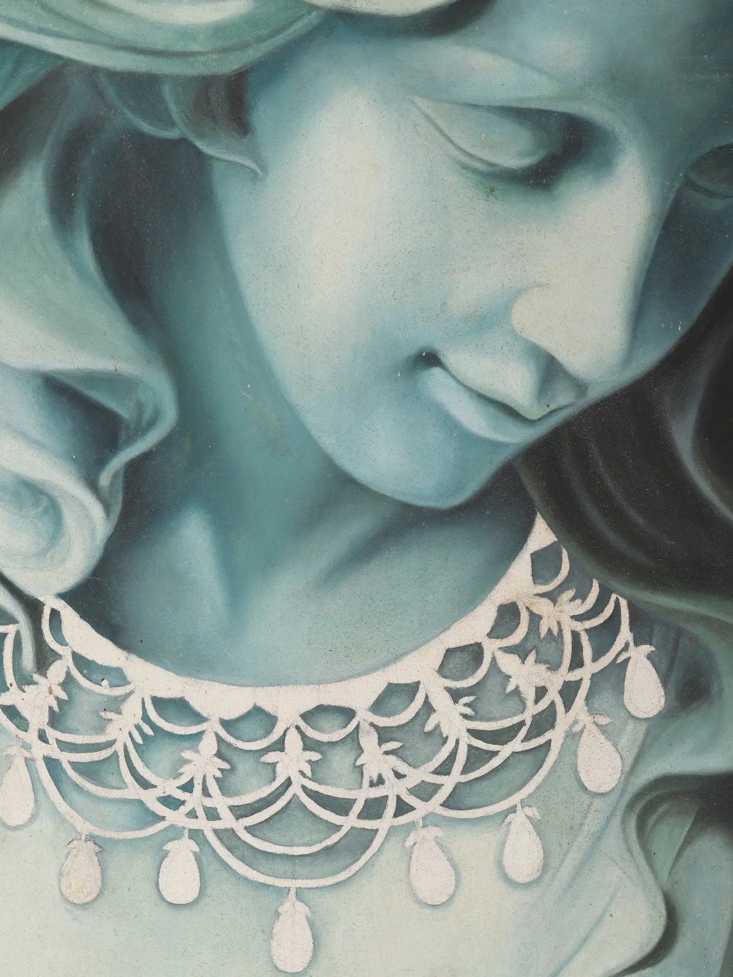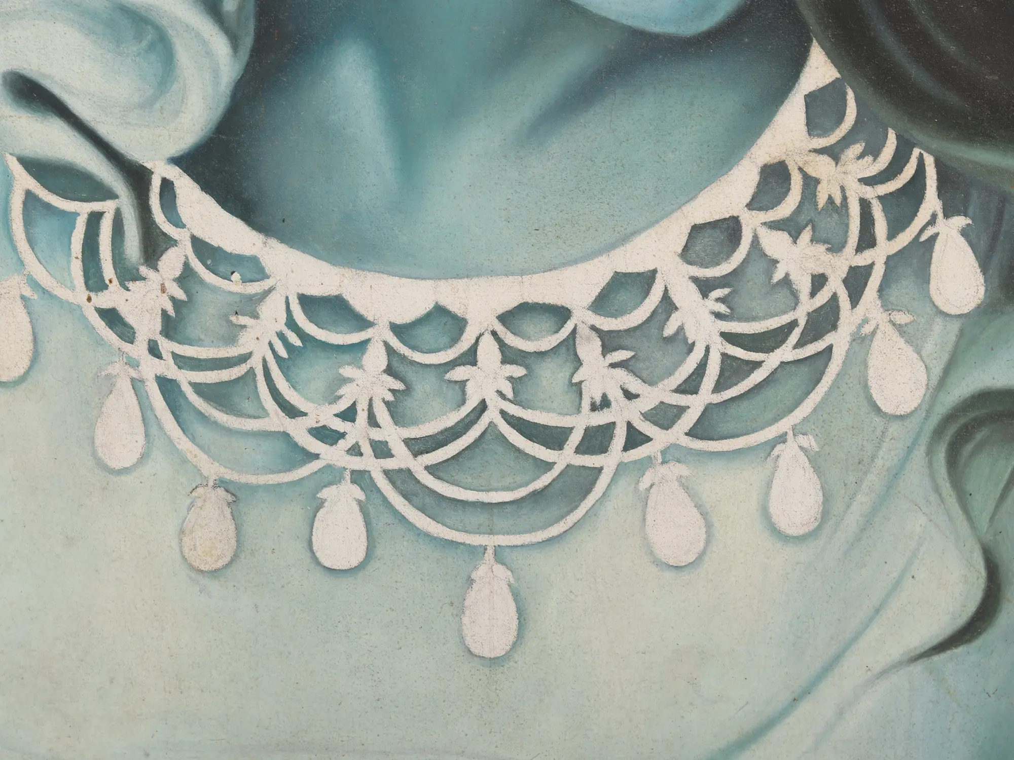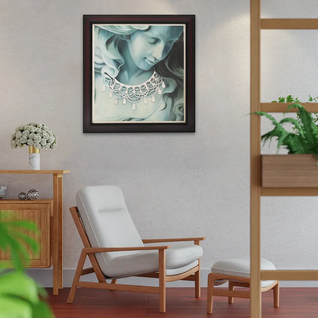 In the contemporary realm, "Lady with the Diamond Necklace," a framed oil painting, continues this tradition. The artwork portrays a stunning woman looking demurely downward, wearing an elaborate diamond necklace. The artist skillfully renders her face and body in a light bluish-grey shade, creating a sculptural effect. The intricate details of the white-painted diamond necklace further emphasize the luxury and delicacy of the adornment.