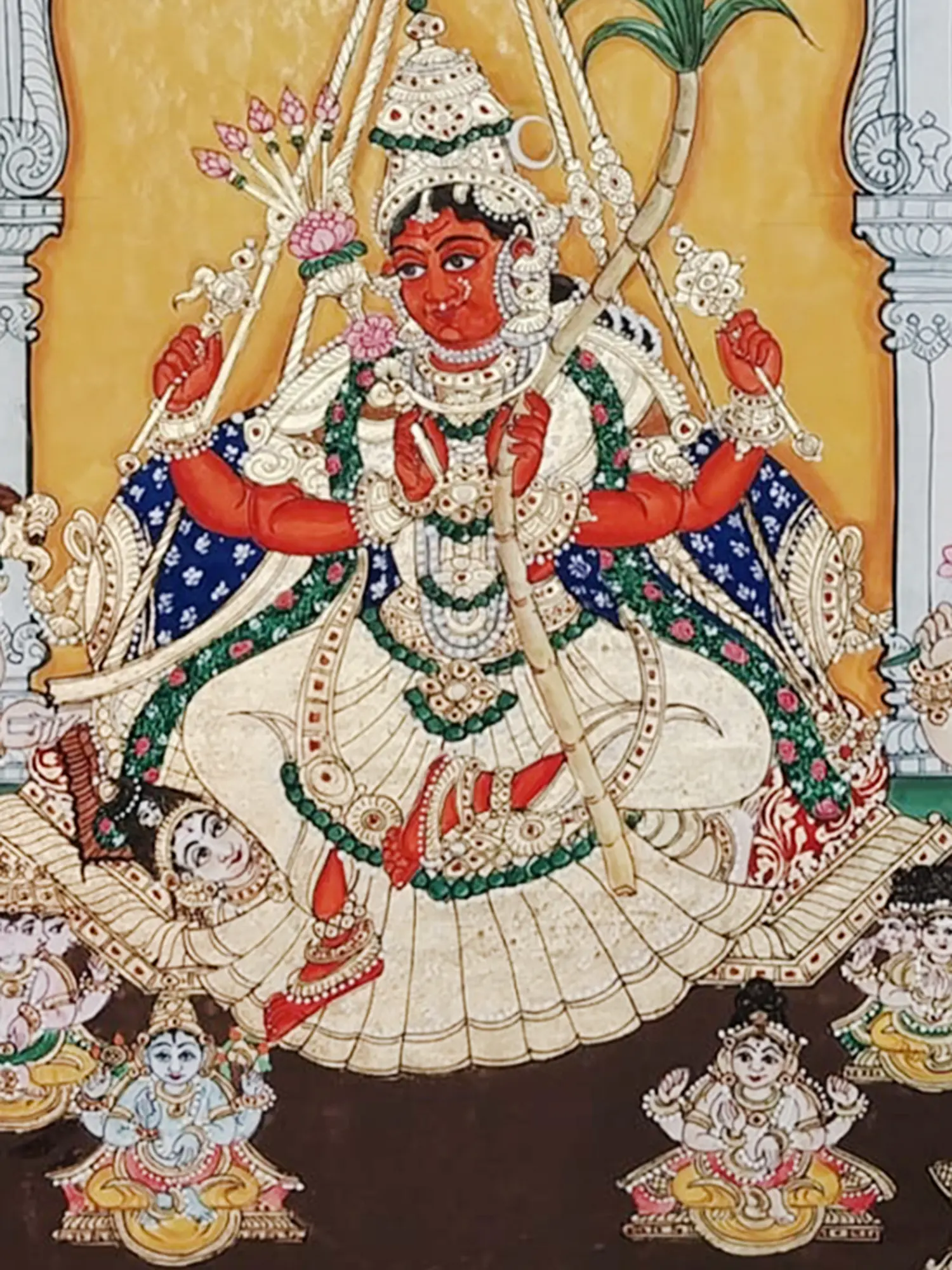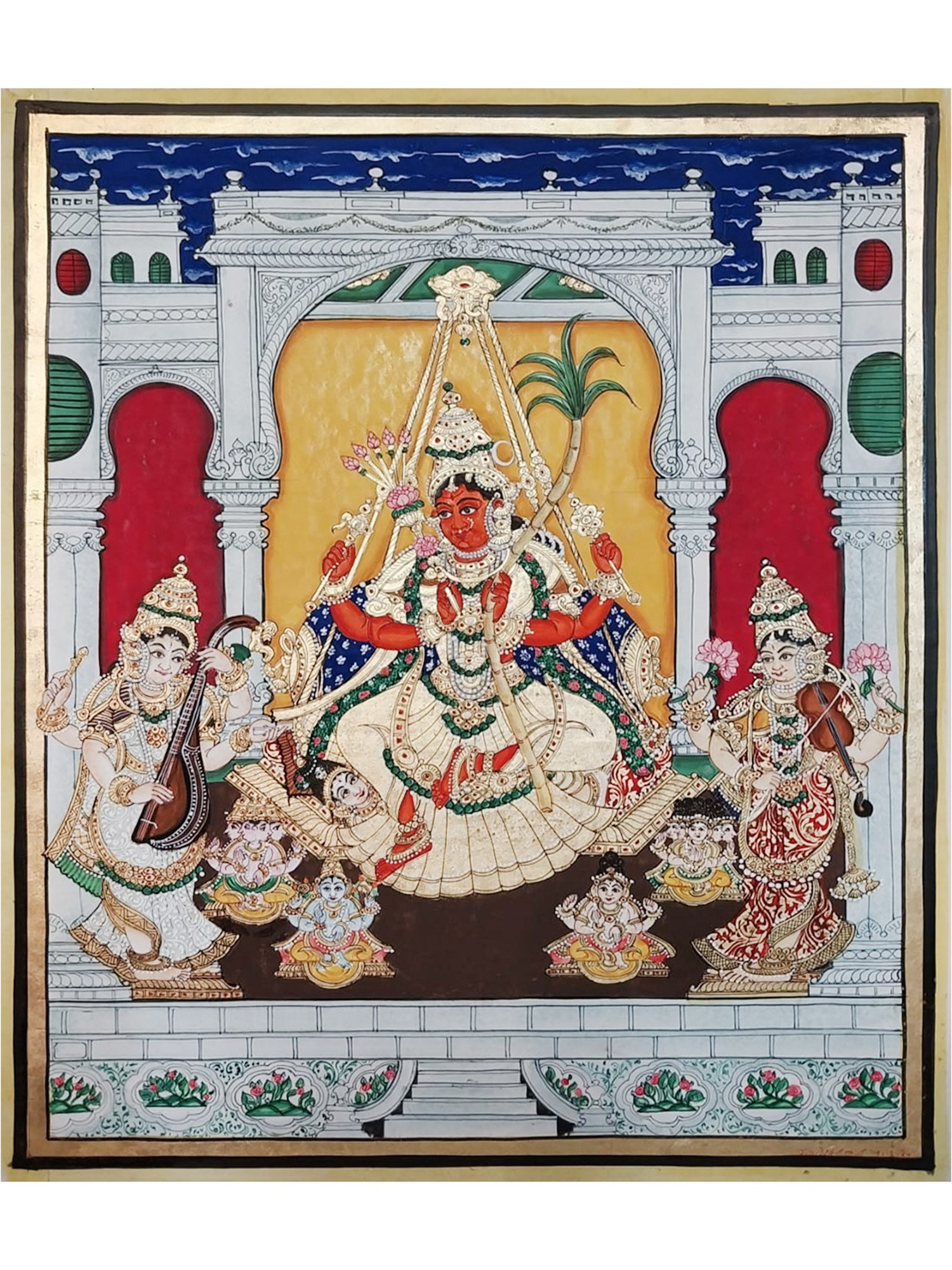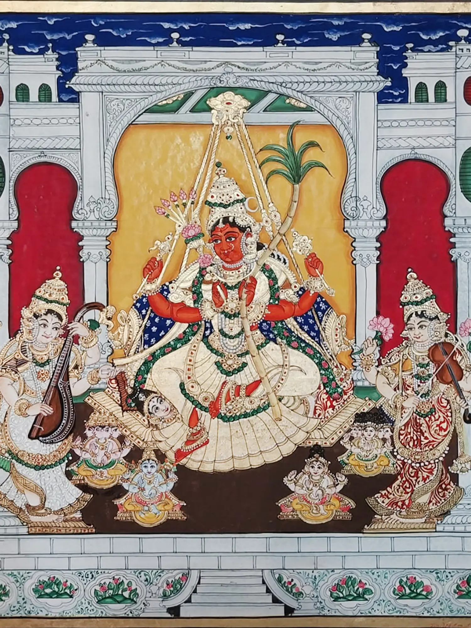 The vibrant depiction of the central deity, rendered in a striking crimson hue, commands attention as she rests on an ornate swing. Surrounding her, celestial attendants play instruments and offer devotion, their elaborate attire meticulously detailed with fine lines and rich color. The architectural setting, with its arched doorways and patterned friezes, provides a grand yet intimate stage for this divine tableau, creating a rich visual narrative within the 16-inch by 20-inch canvas.
