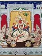 This composition draws inspiration from the rich tapestry of Hindu mythology, specifically depicting a scene of reverence for a divine mother figure, symbolizing nurture and power. The style is reminiscent of the Rajasthani miniature tradition, known for its intricate details, vibrant colors, and devotional themes, offering a glimpse into centuries of artistic heritage. The inclusion of celestial beings and the regal setting elevates the narrative, underscoring the sacred importance of the portrayed moment.