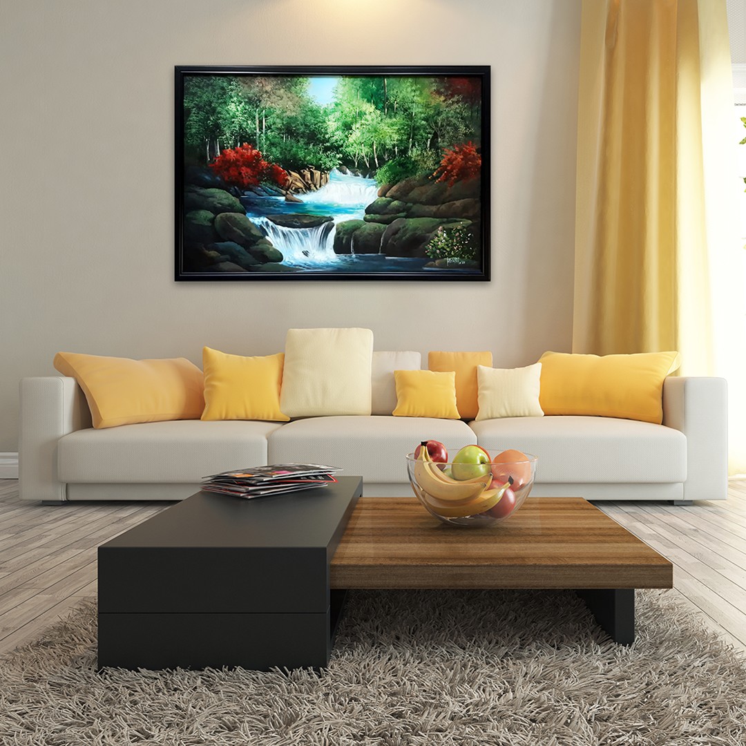 This landscape painting isn't just a piece of art; it's an experience. It transforms a room into a sanctuary, inviting peace and calm into your daily life. The vibrant greens and blues, offset by the fiery red accents, create a dynamic yet harmonious balance. The movement of the water draws the eye, instilling a sense of flow and serenity. Imagine the subtle shift in mood as the natural light changes across the canvas during the day, each new angle revealing new facets of this captivating piece. It's an artwork that breathes, that changes with the light and the seasons, offering a constant source of visual delight and inspiration. This piece will serve as a conversation starter, a source of daily contemplation, and a truly unique addition to your home. Let the beauty of nature enhance your living space and fill it with the tranquil energy of flowing water and lush forests.