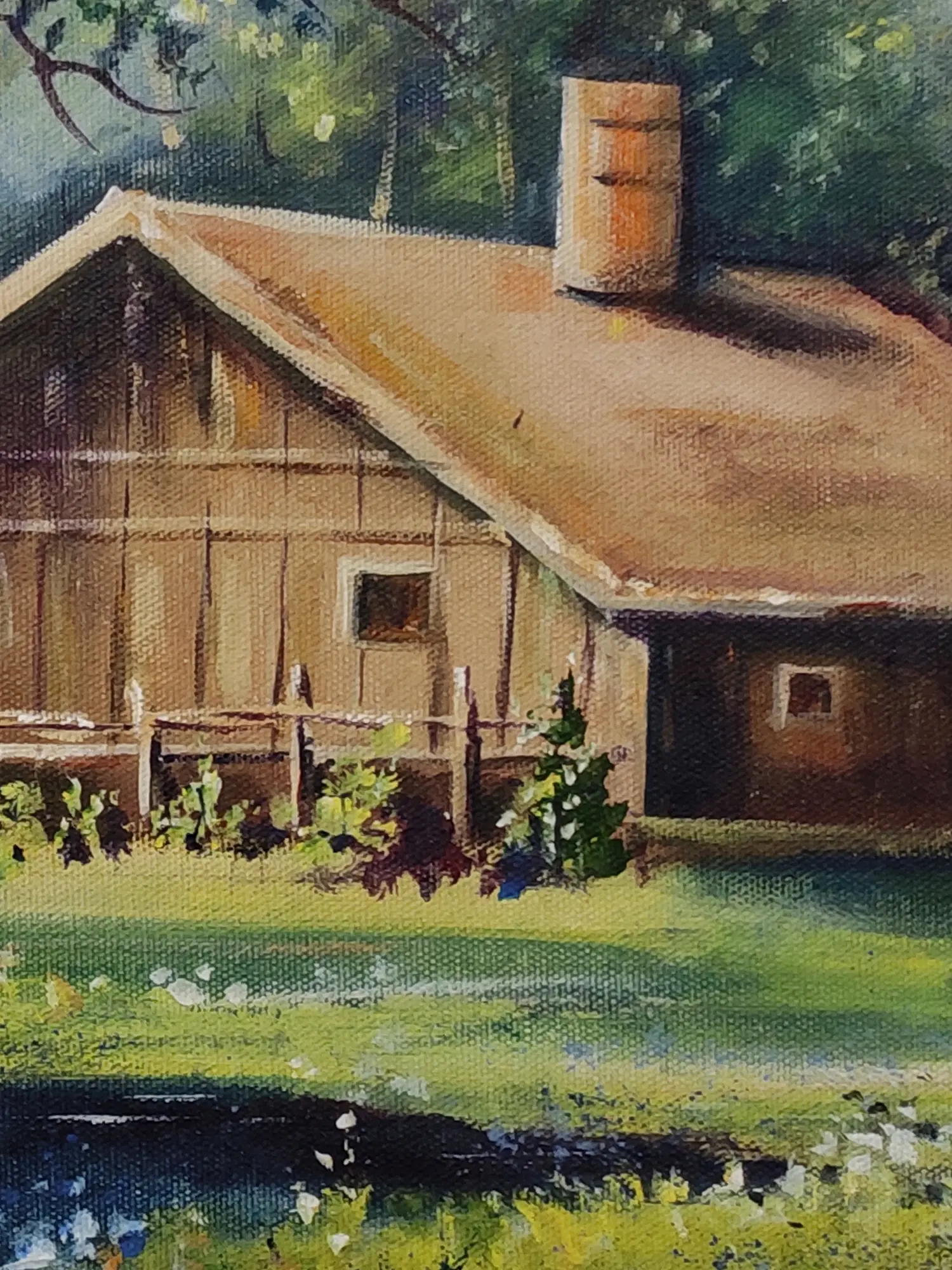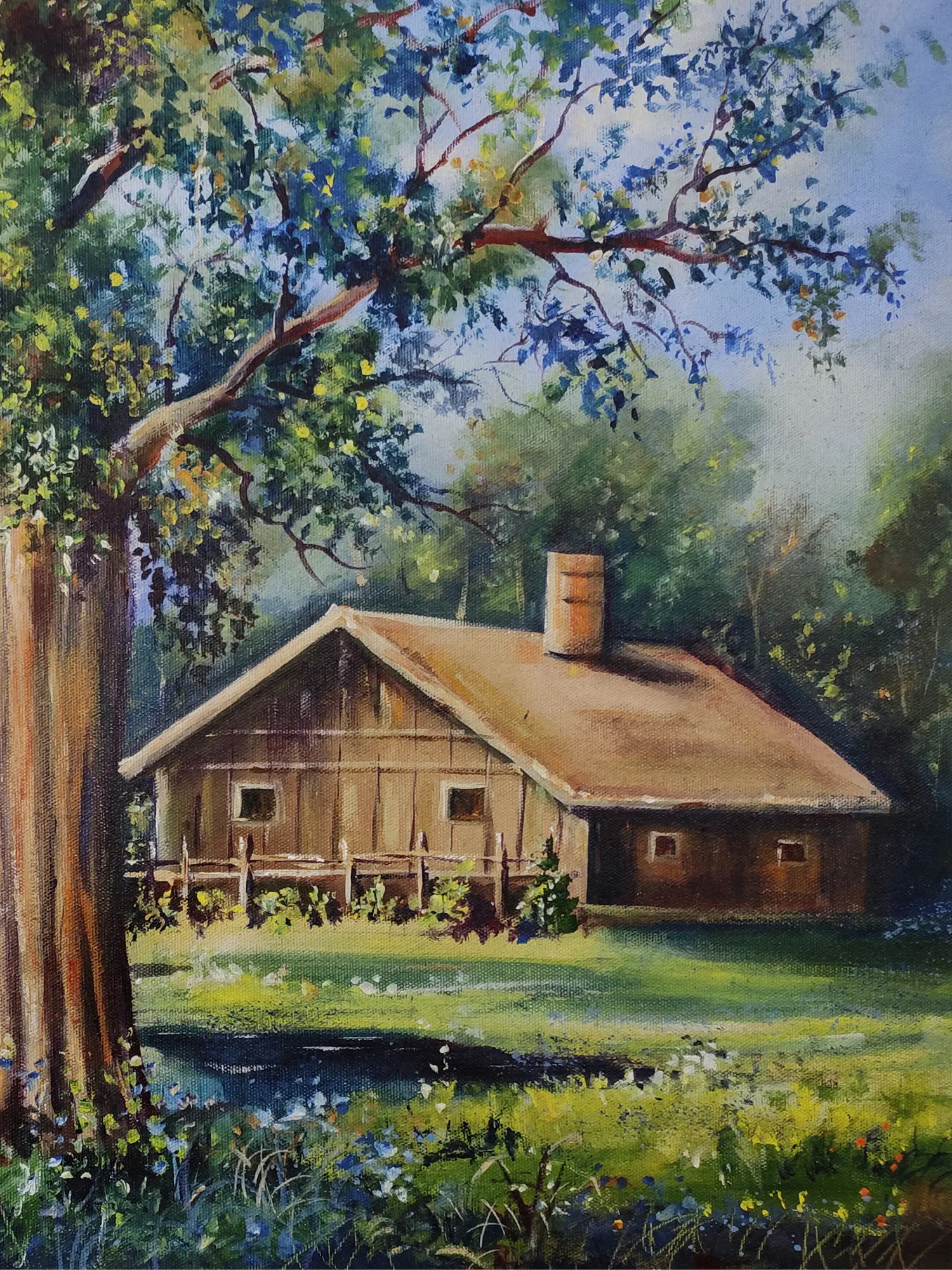 The composition, measuring 22 inches in height and 28 inches in width, unfolds a narrative of harmonious coexistence between nature and humble dwelling. Majestic trees stand sentinel, their leaves a vibrant tapestry against a soft, blue sky, while the warm tones of the cabin exude an inviting aura. The dappled sunlight filtering through the foliage creates a dynamic yet peaceful atmosphere, drawing you into the scene and promising a constant source of visual delight.