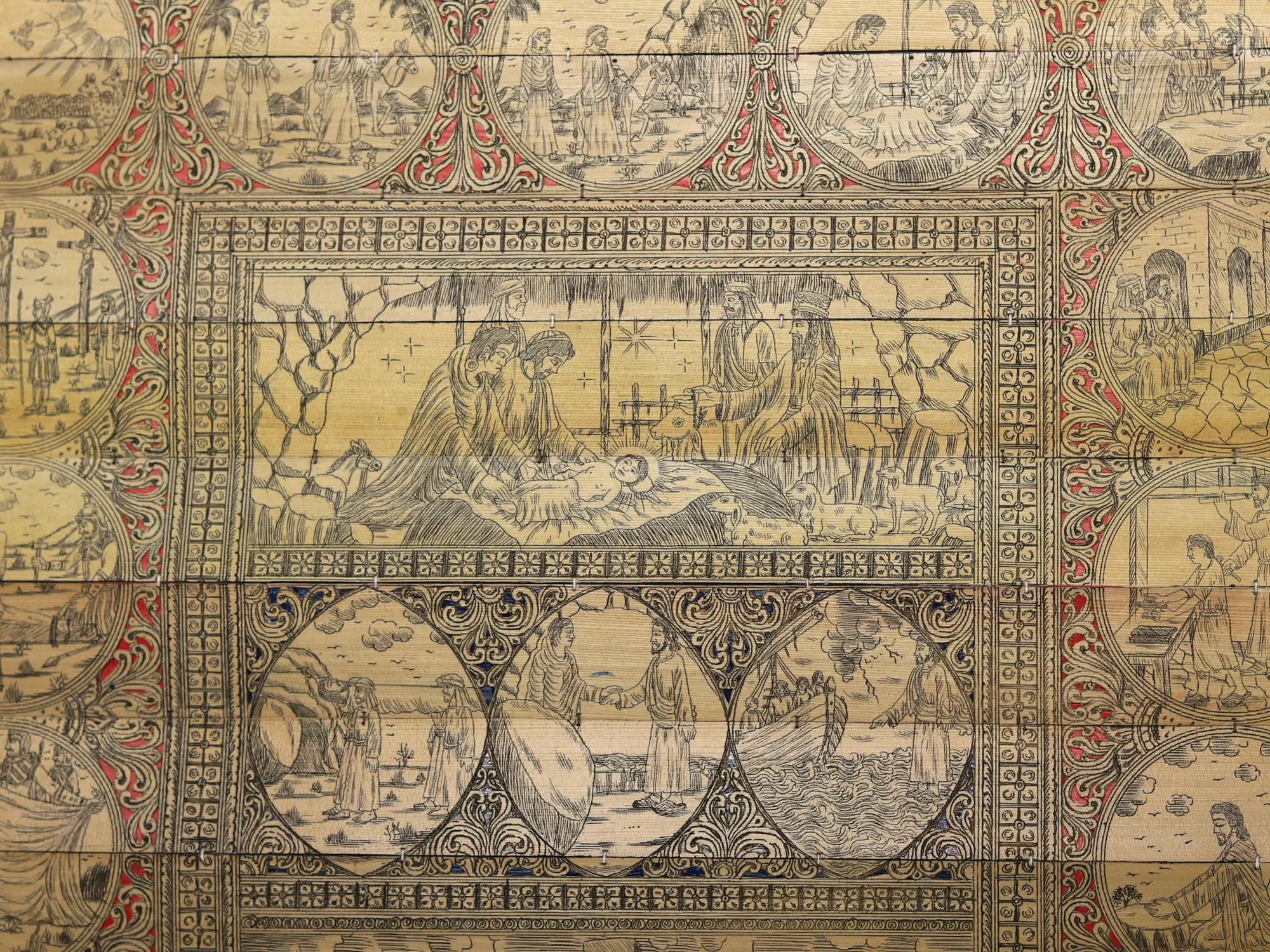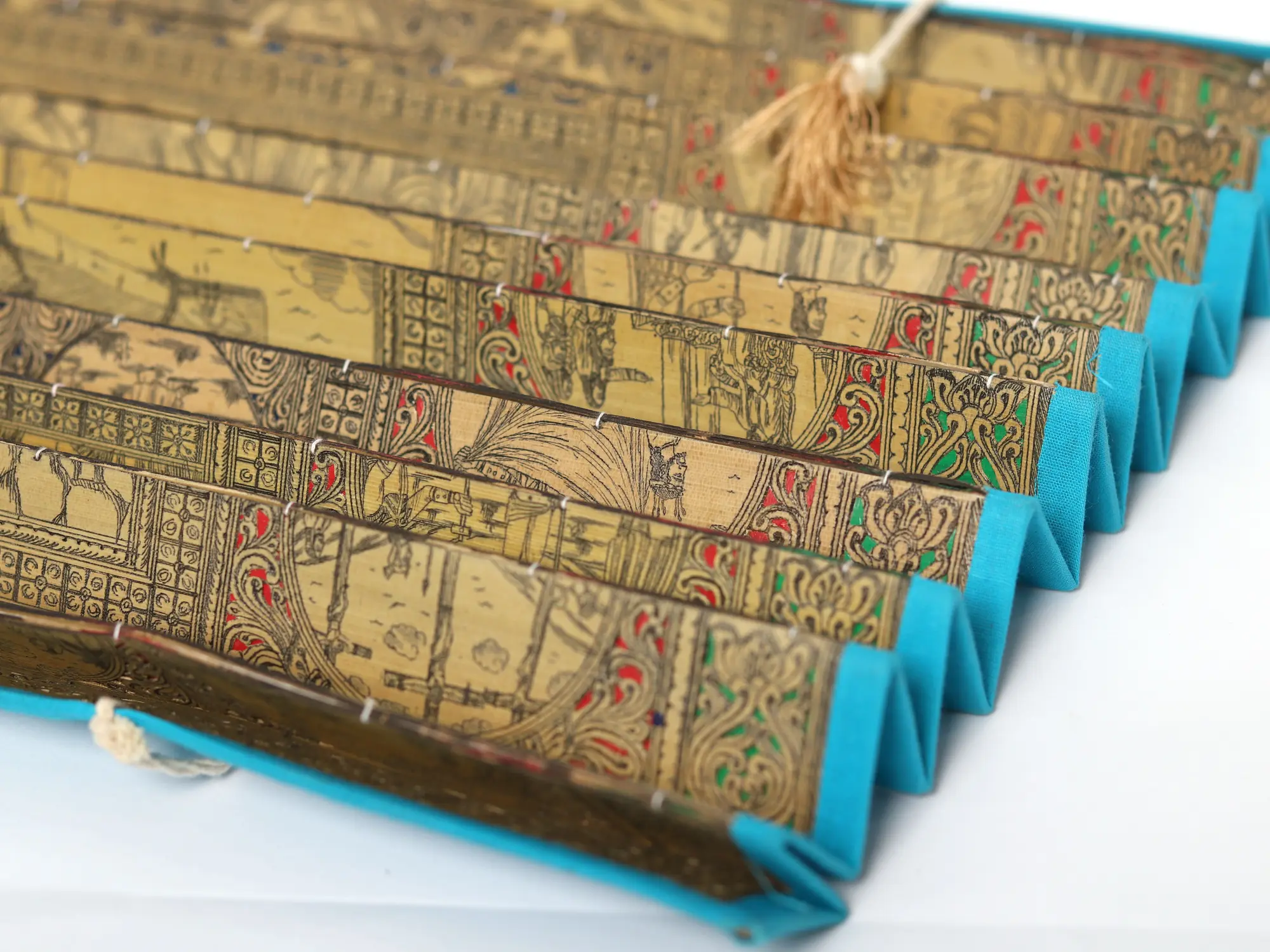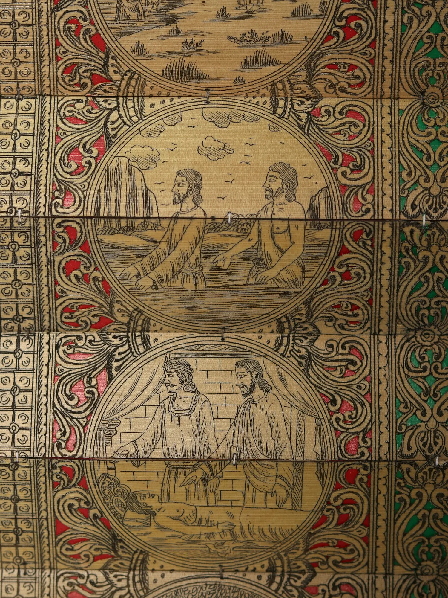 The artist now makes a double-lined border on all four sides of the canvas. The local artists are so expert in painting that they do not draw figures and motifs with pencil but directly draw them with a brush. The paint brushes that the painters use are made of the hair of domestic animals, a bunch of which is tied to the end of a bamboo stick. The figures are now painted with natural colors using the indigenous brushes. The outline is thickened with black color.